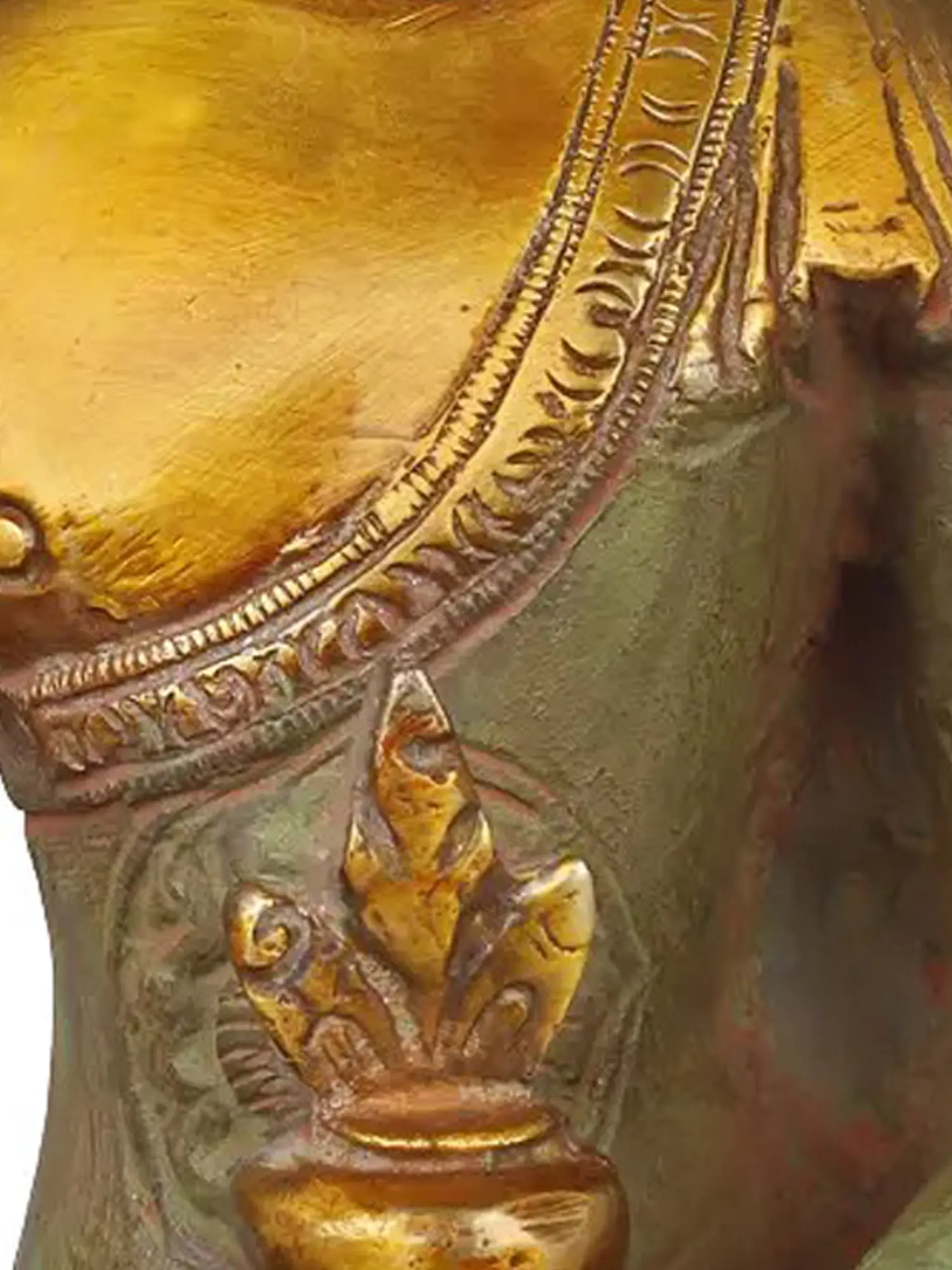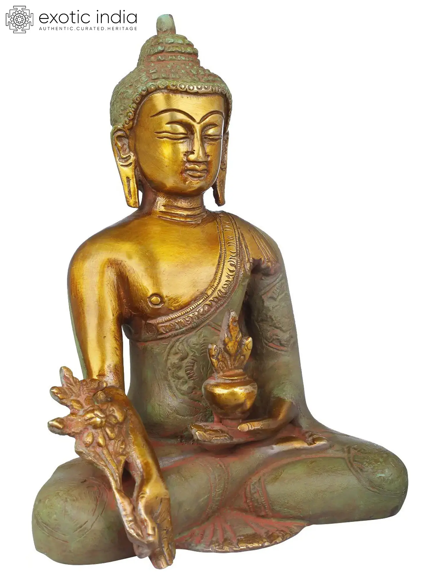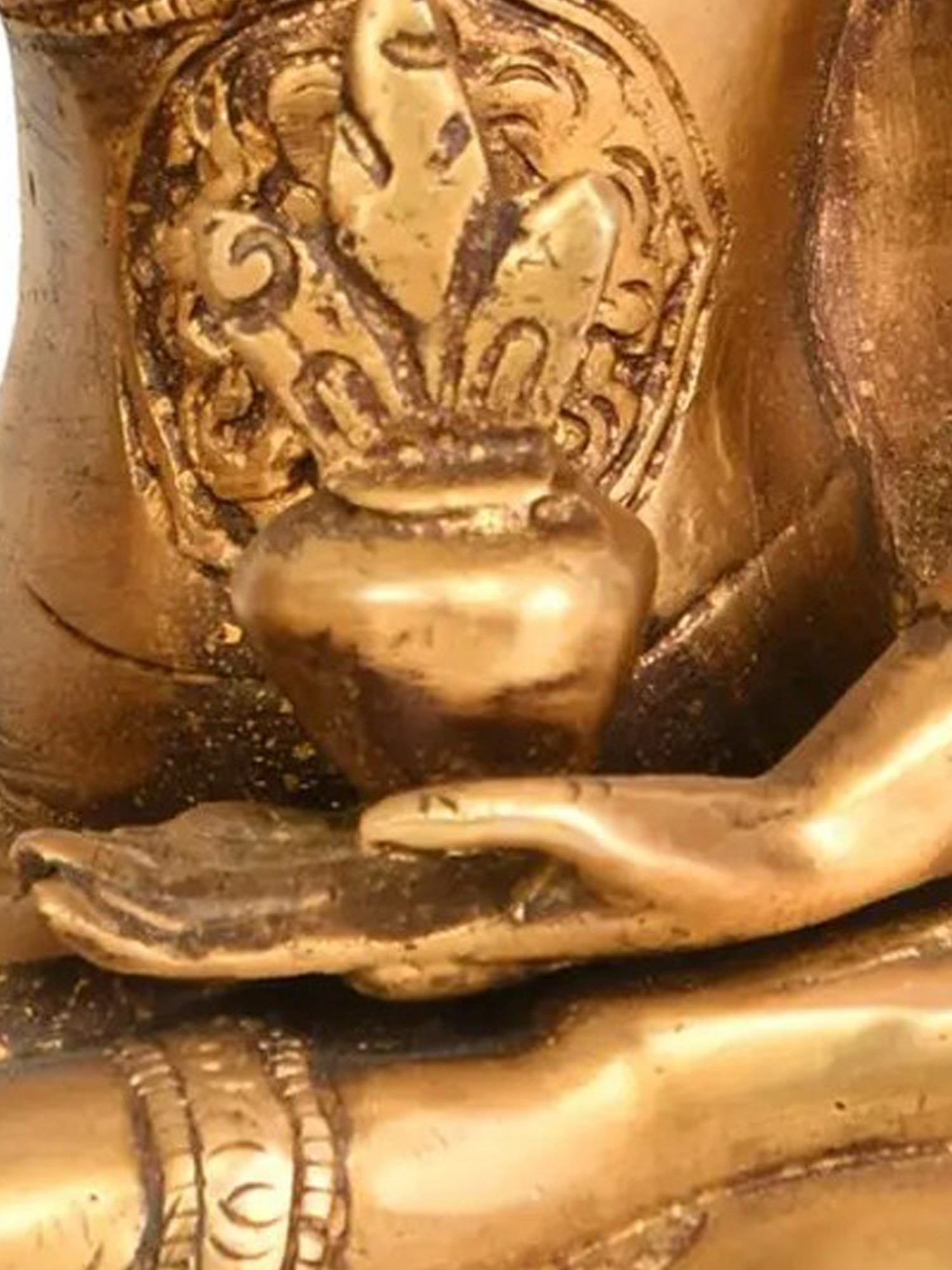 In the artistry of brass, the Medicine Buddha emerges as a profound embodiment of healing and compassion in the Tibetan Buddhist tradition. The intricately crafted statue showcases the deity's serene expression and the symbolic healing bowl, radiating a sense of spiritual tranquility. The golden warmth of brass enhances the sacred aura, symbolizing enlightenment and the alleviation of suffering. This representation beckons contemplation on the transformative power of compassion and the journey toward spiritual well-being. Beyond a mere work of art, the brass statue becomes a conduit for the healing wisdom embodied by the Medicine Buddha, inviting a connection to the profound teachings of Tibetan Buddhism.