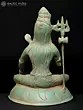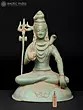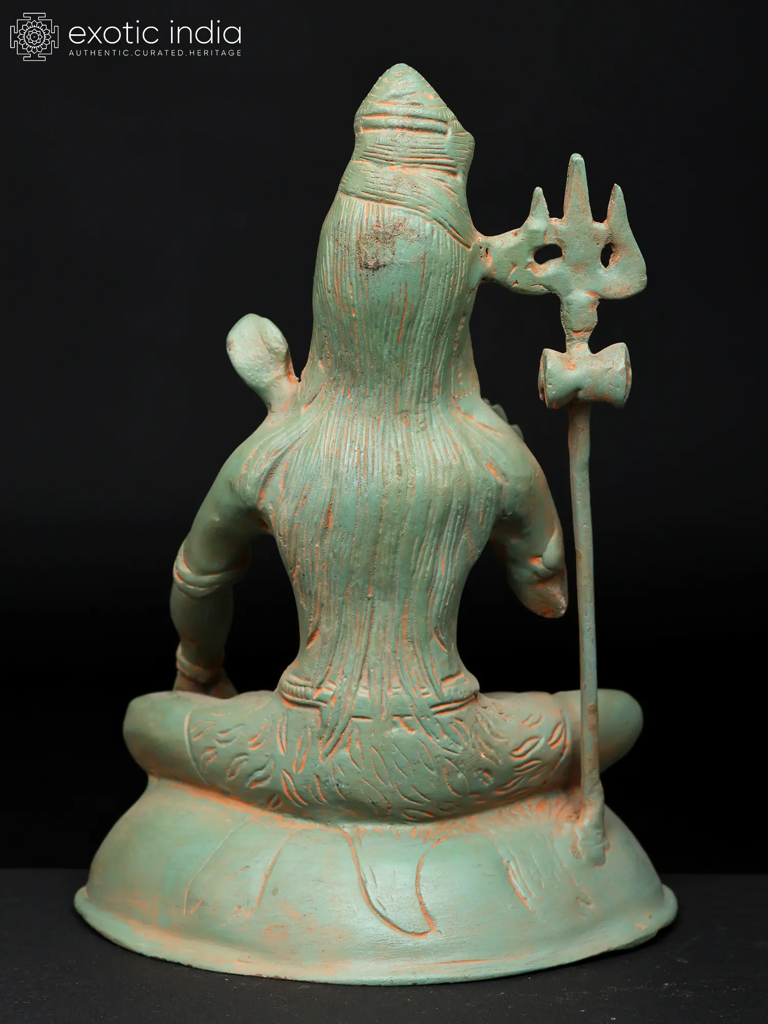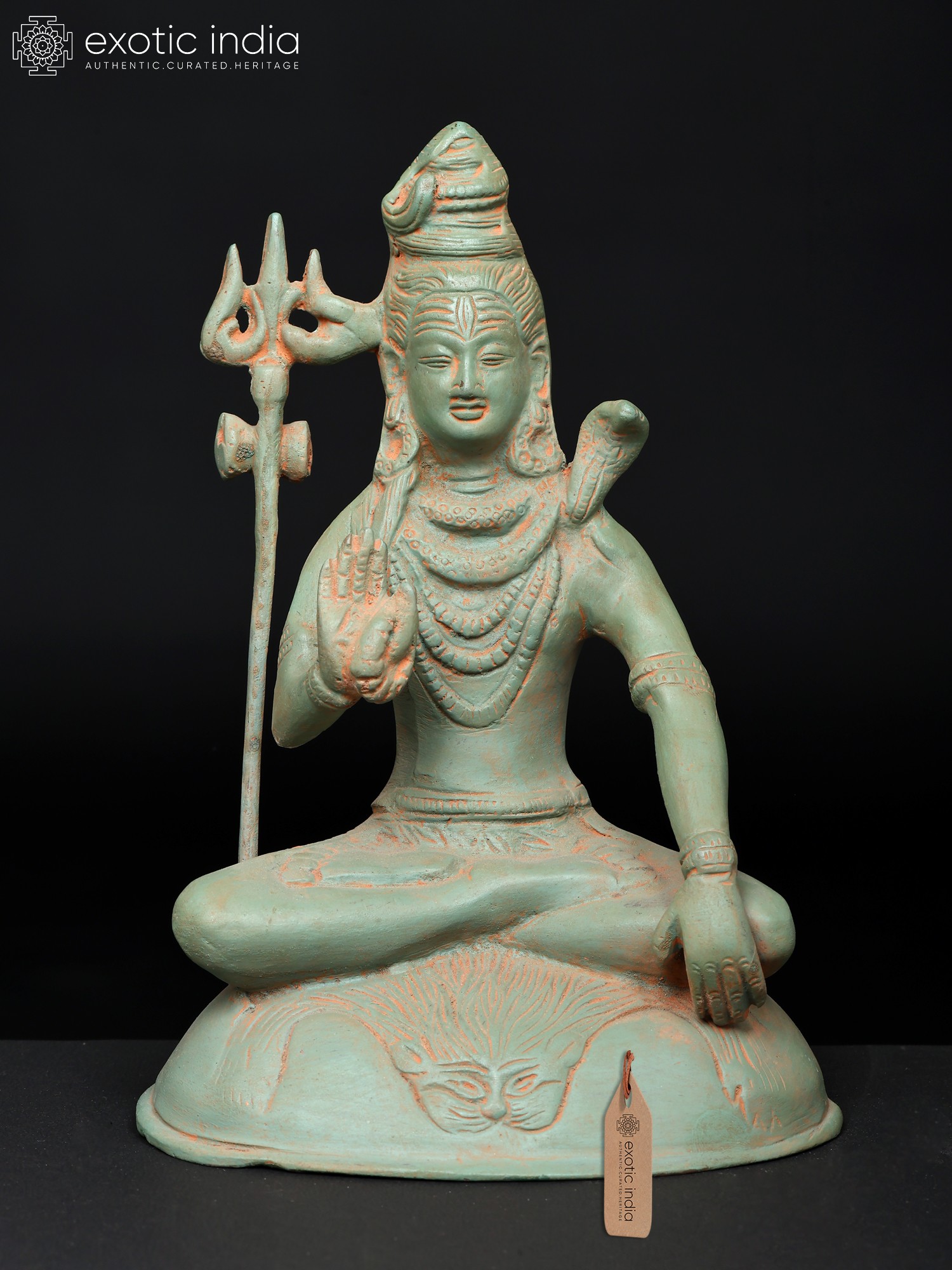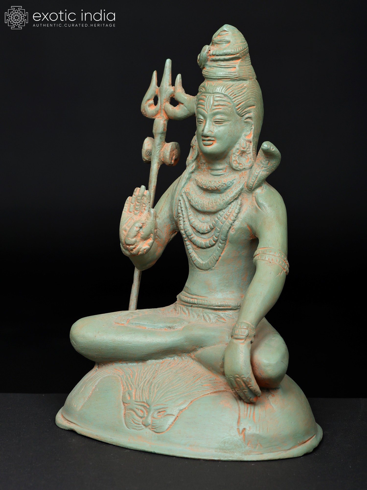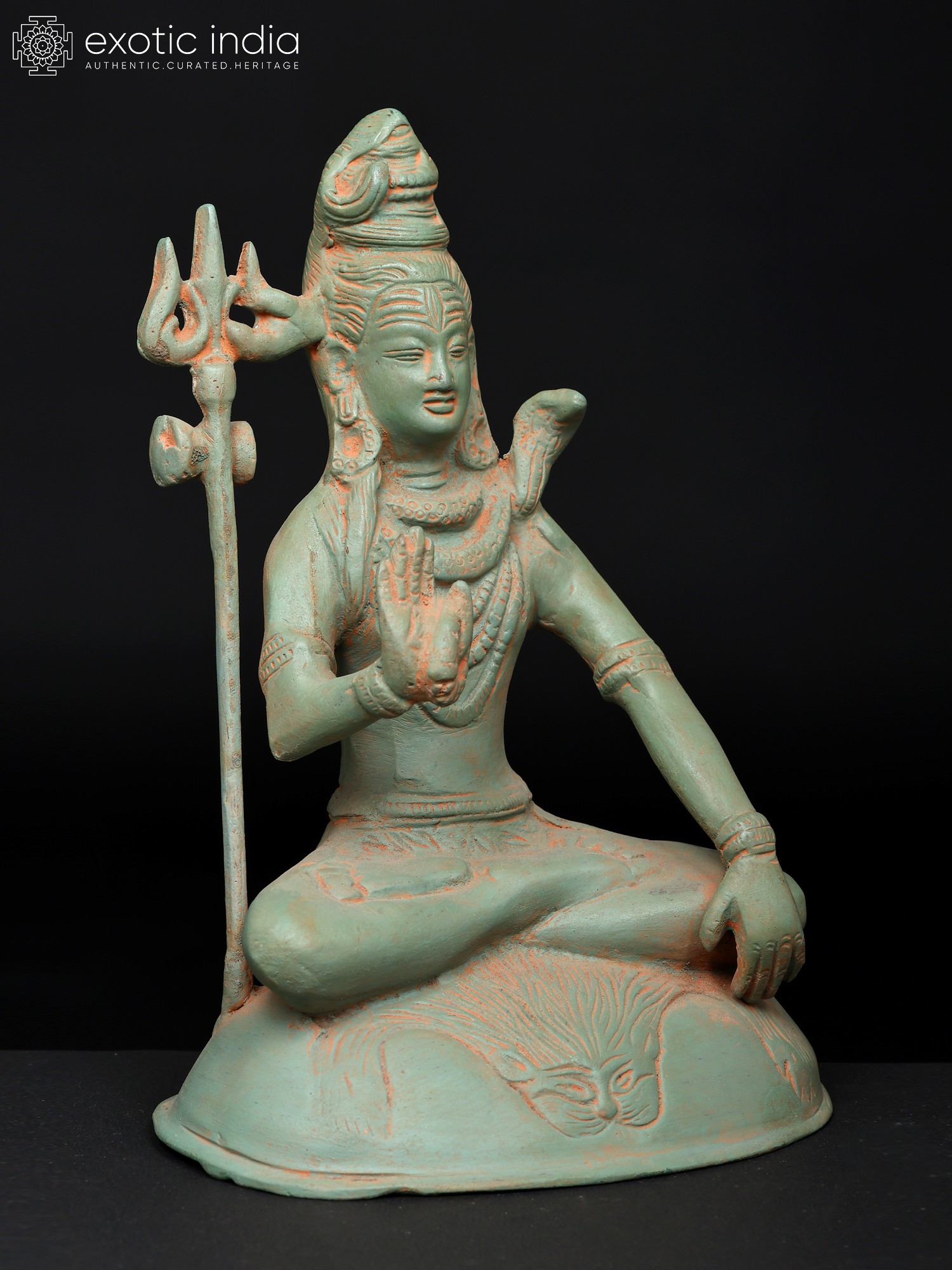 Observe the gentle serenity conveyed through the sculpted features, from the tranquil expression to the subtle rendering of adornments. The coiled serpent around the neck, a powerful symbol of cosmic energy, and the intricate layers of the mala around the chest speak volumes of spiritual significance. The benevolent gesture of blessing, with its open palm, radiates grace and protection, while the trident held aloft signifies Shiva's mastery over the three aspects of existence. The seated posture, upon a lotus base, further emphasizes purity and spiritual elevation, all rendered with an eye for exquisite detail.