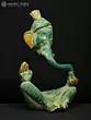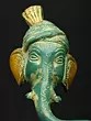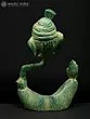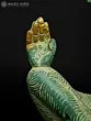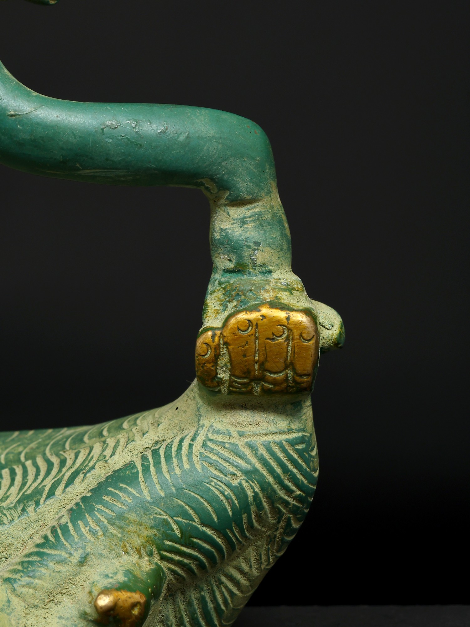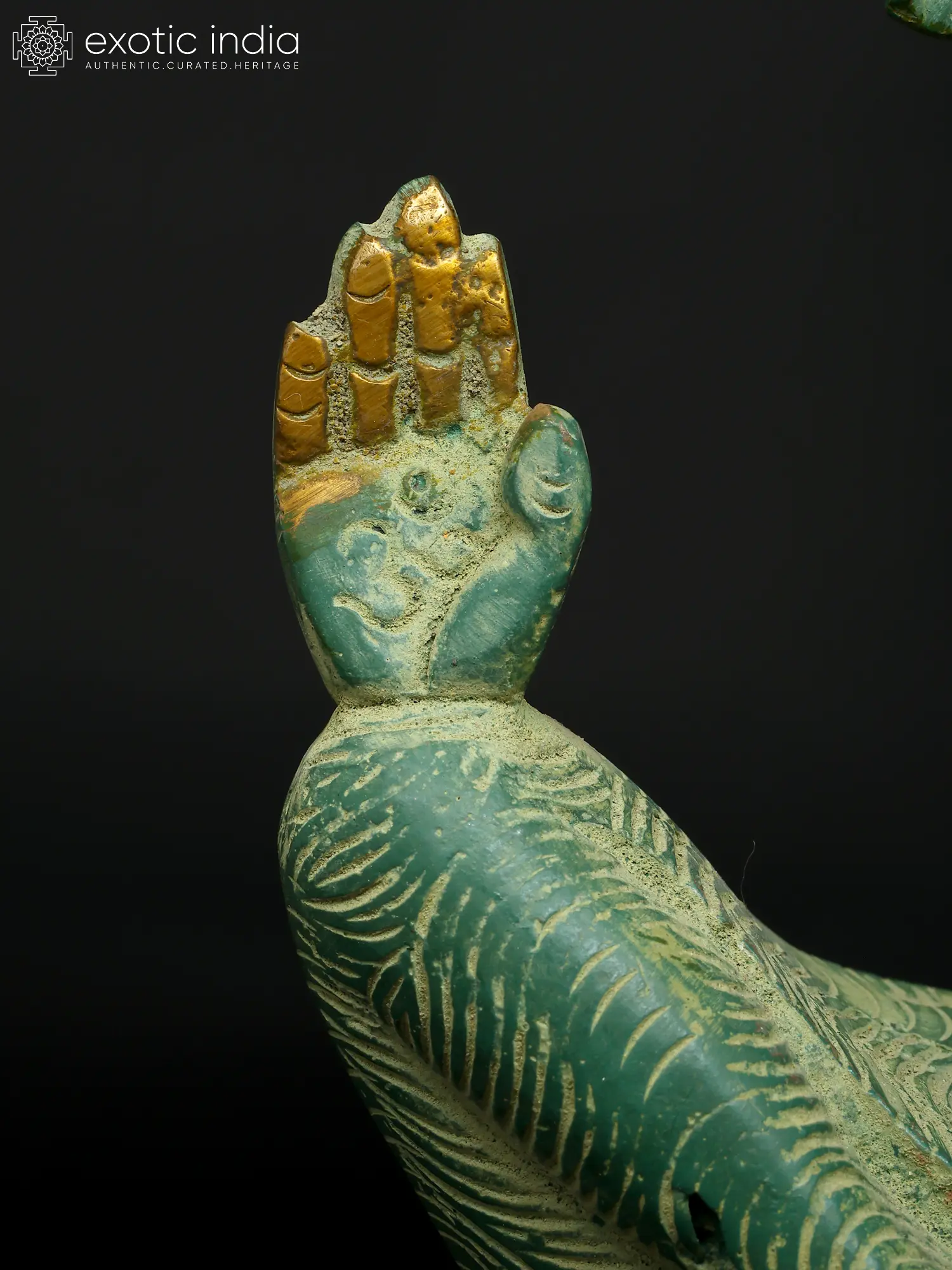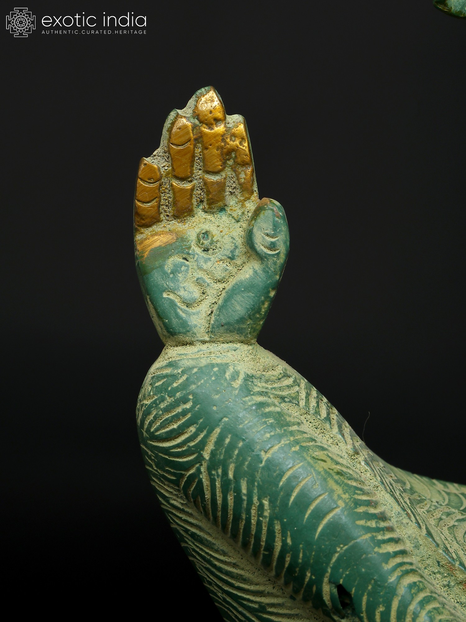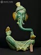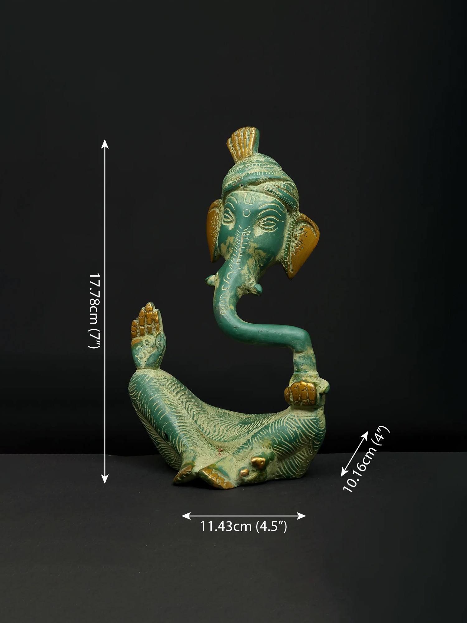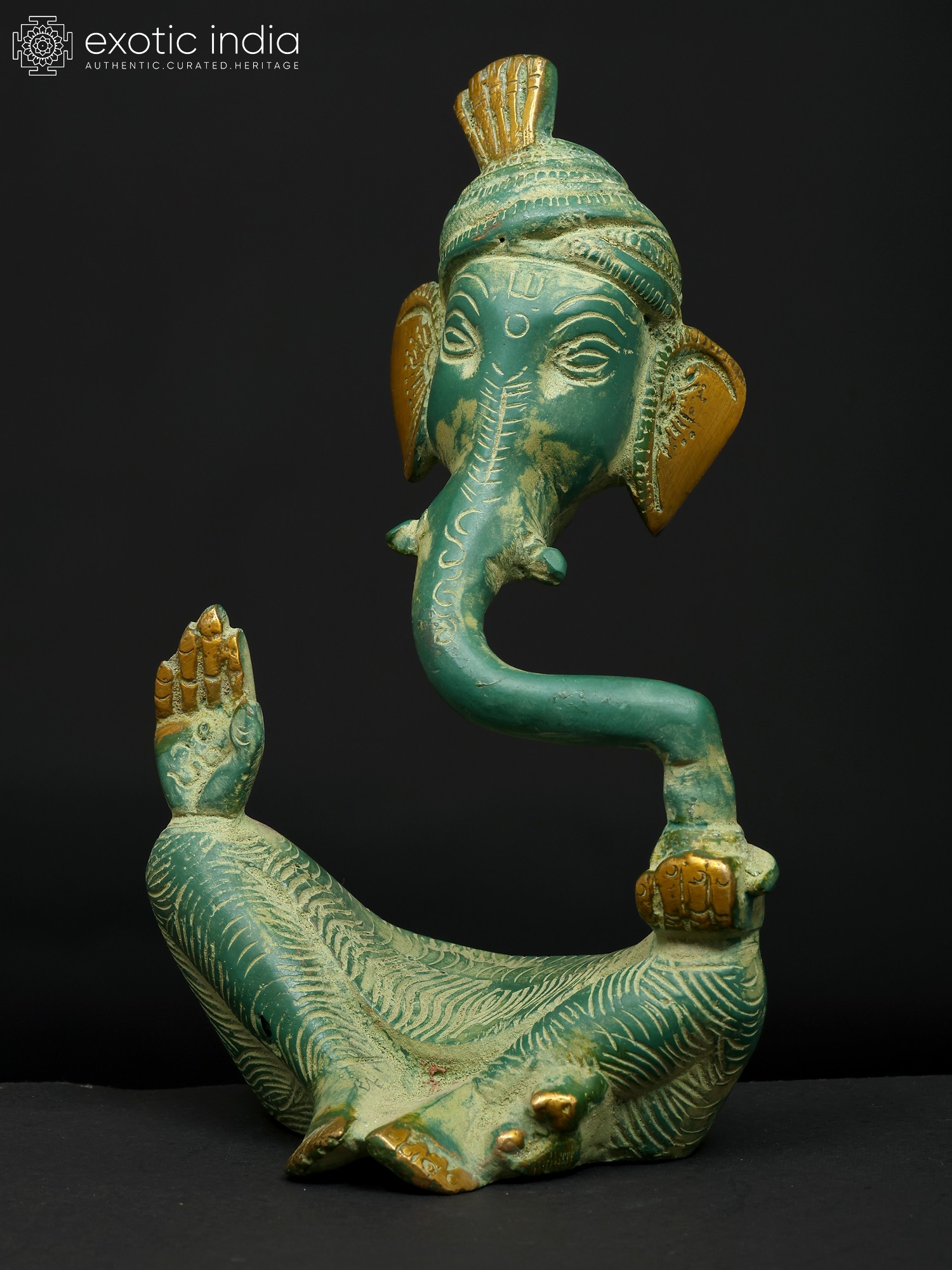 The divine form is rendered in a graceful, flowing posture, with Ganesha seated in a contemplative yet powerful stance. His trunk, elegantly curved, and his expressive eyes convey wisdom and serenity. The detailed ornamentation, particularly the traditional turban adorning his head and the delicate embellishments on his ears and hands, speaks to the meticulous attention to detail that defines Indian metalwork. The subtle contrast between the verdigris green finish and the gleam of polished brass highlights the craftsmanship and the inherent beauty of the material.