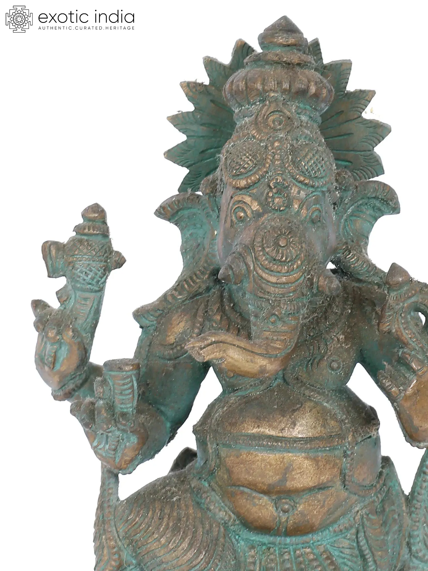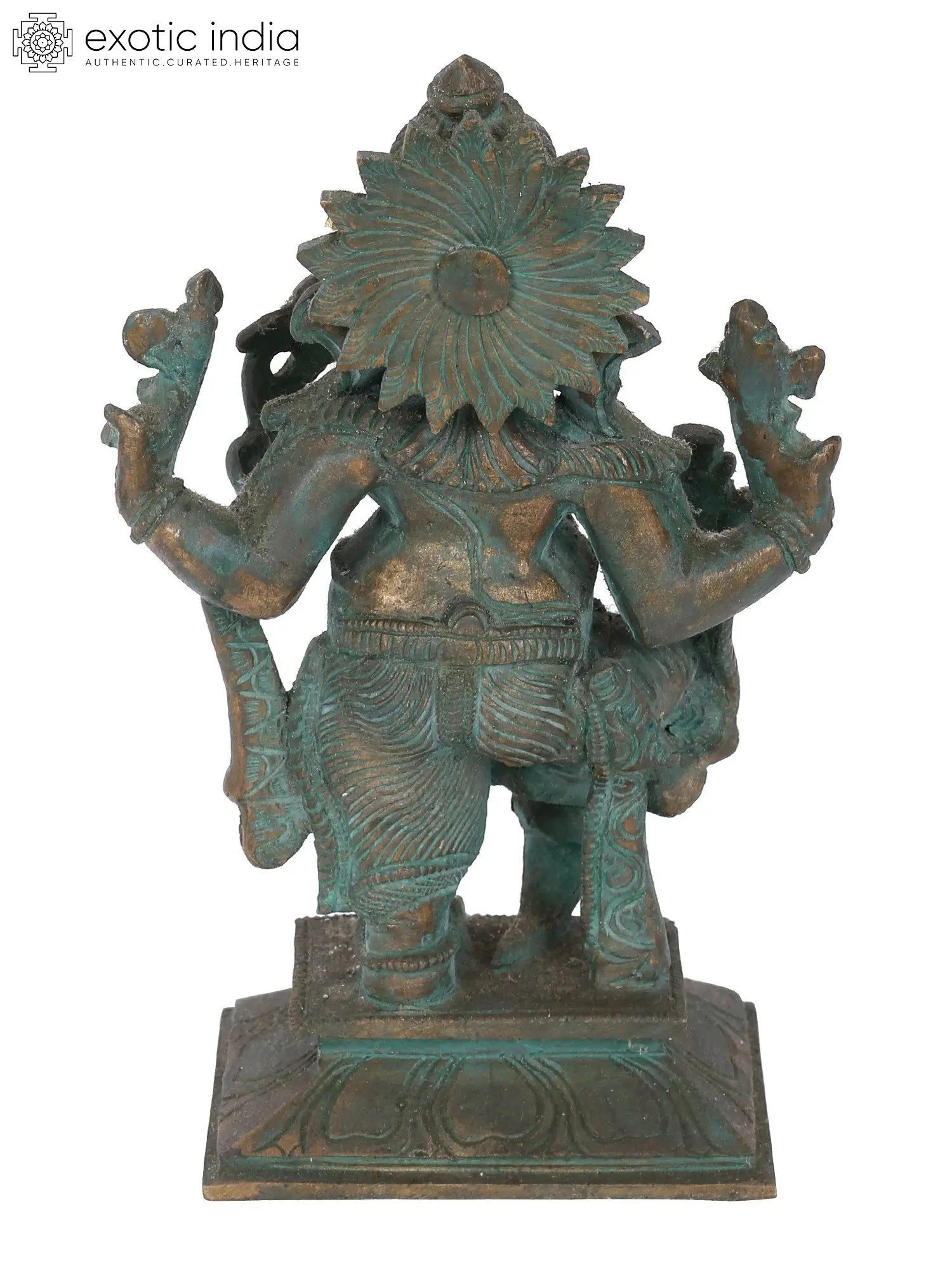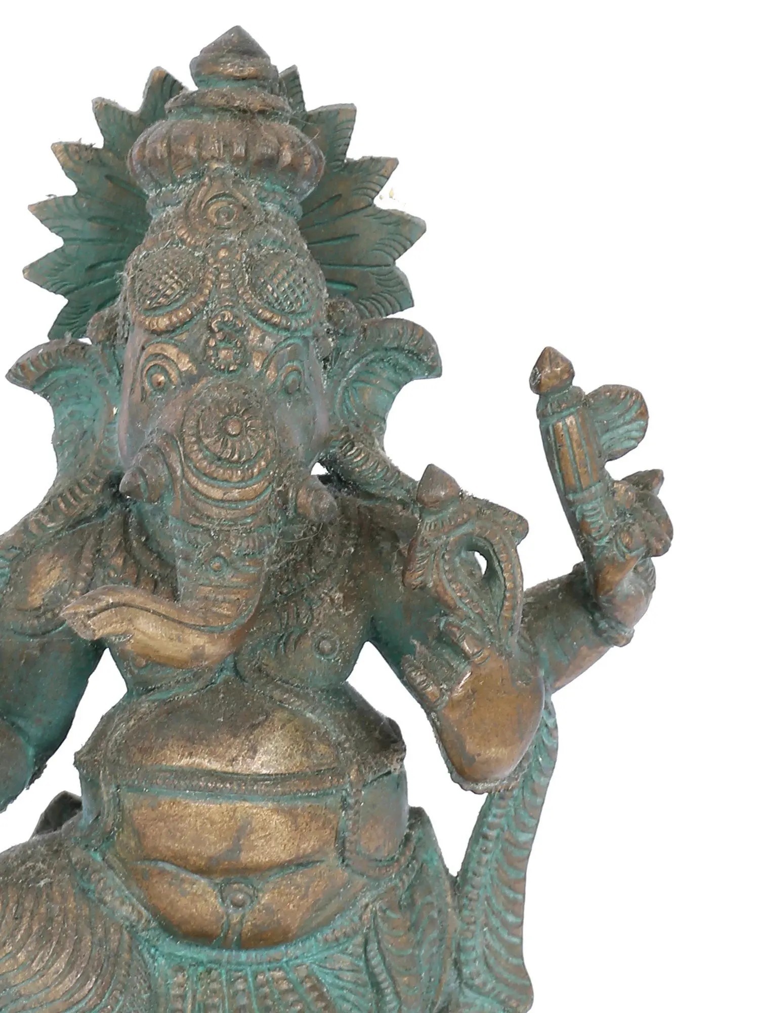 Who’s dance spills the stars into the universe - Immerse yourself in the divine dance of Nritya Ganapati, an enchanting sculpture meticulously crafted through Madhuchista Vidhana on the canvas of Panchaloha Bronze from Swamimalai. Of the thirty-two varieties of Ganapati, Nritya Ganapati is ranked fifteenth. The term "dance" is "Nritya" in Sanskrit. Since Nritya Ganapati is a dancer—or at least a joyful dancer—the name alludes to the carefree and joyful aspect of the Lord.