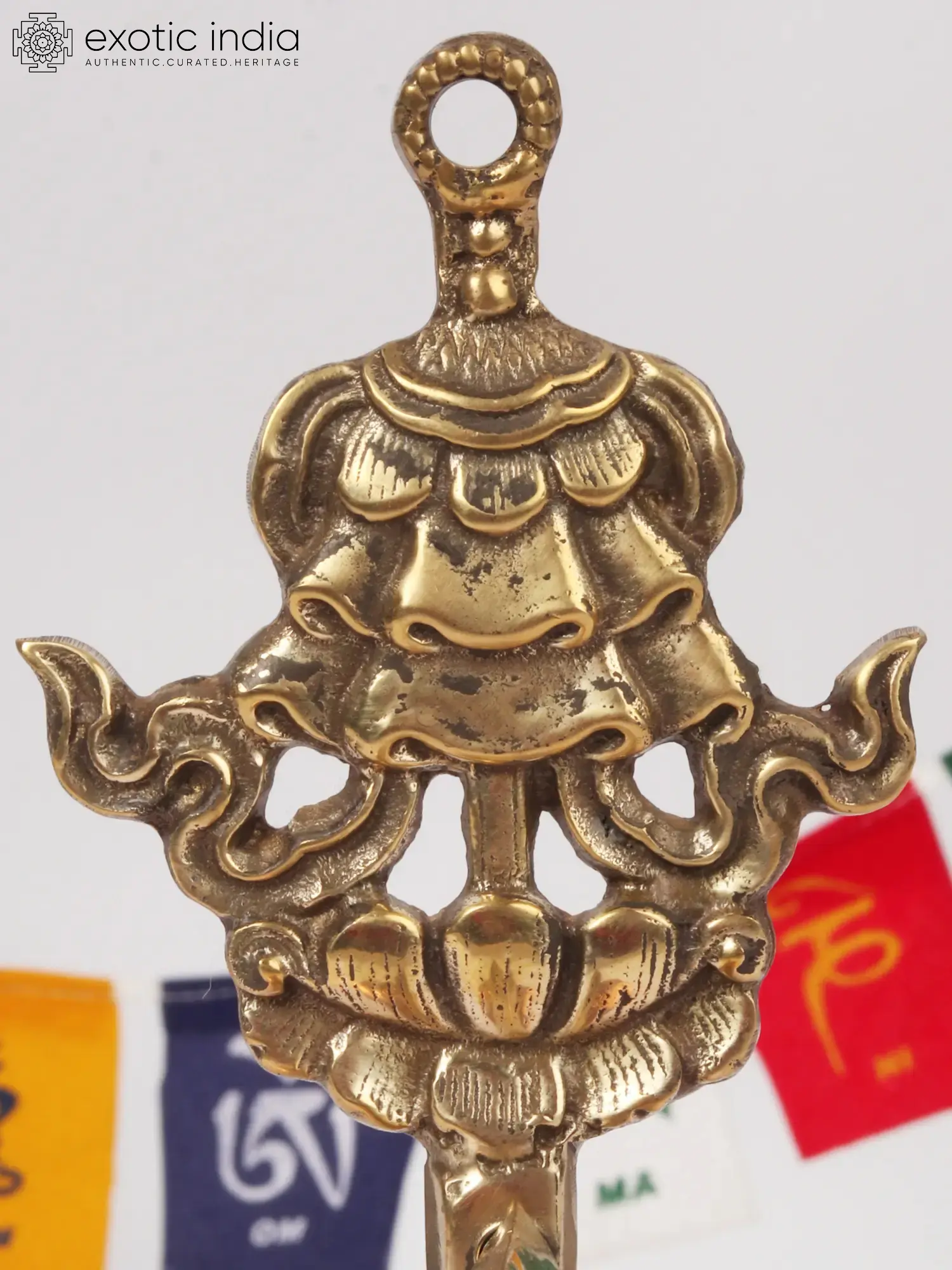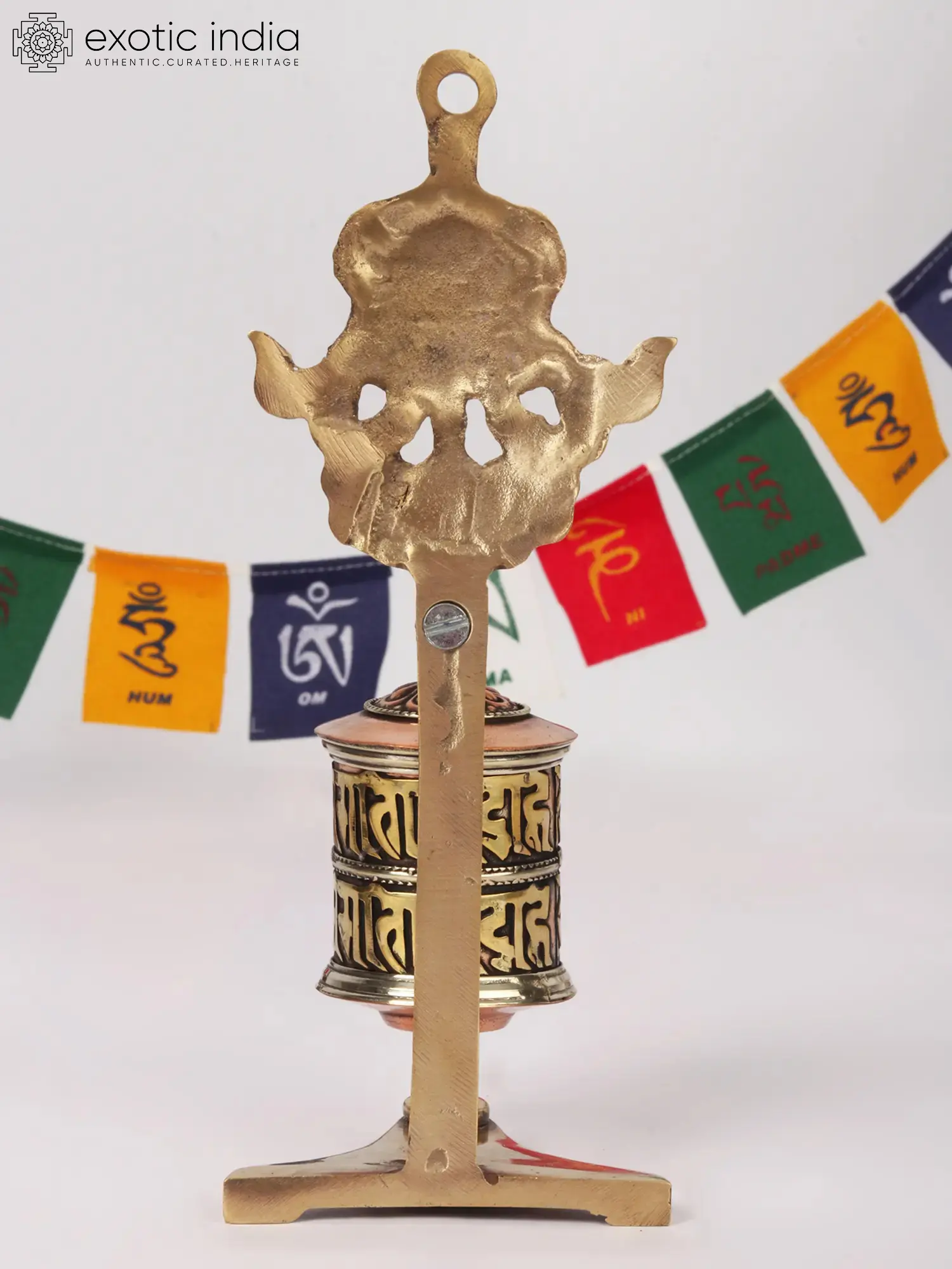 “Om Mani Padme Hum”- the most sacred chant for an initiate Buddhist has been etched on the powerful prayer wheel in this brass and copper composition, which is empowered by the ancient symbol of Parasol or chattra, which represents Buddha’s regal aura. Crafted with pure material, this artwork contains within itself the profound message of achieving universal sovereignty through a ceaseless focus on an enlightened state, through the path of mediation.