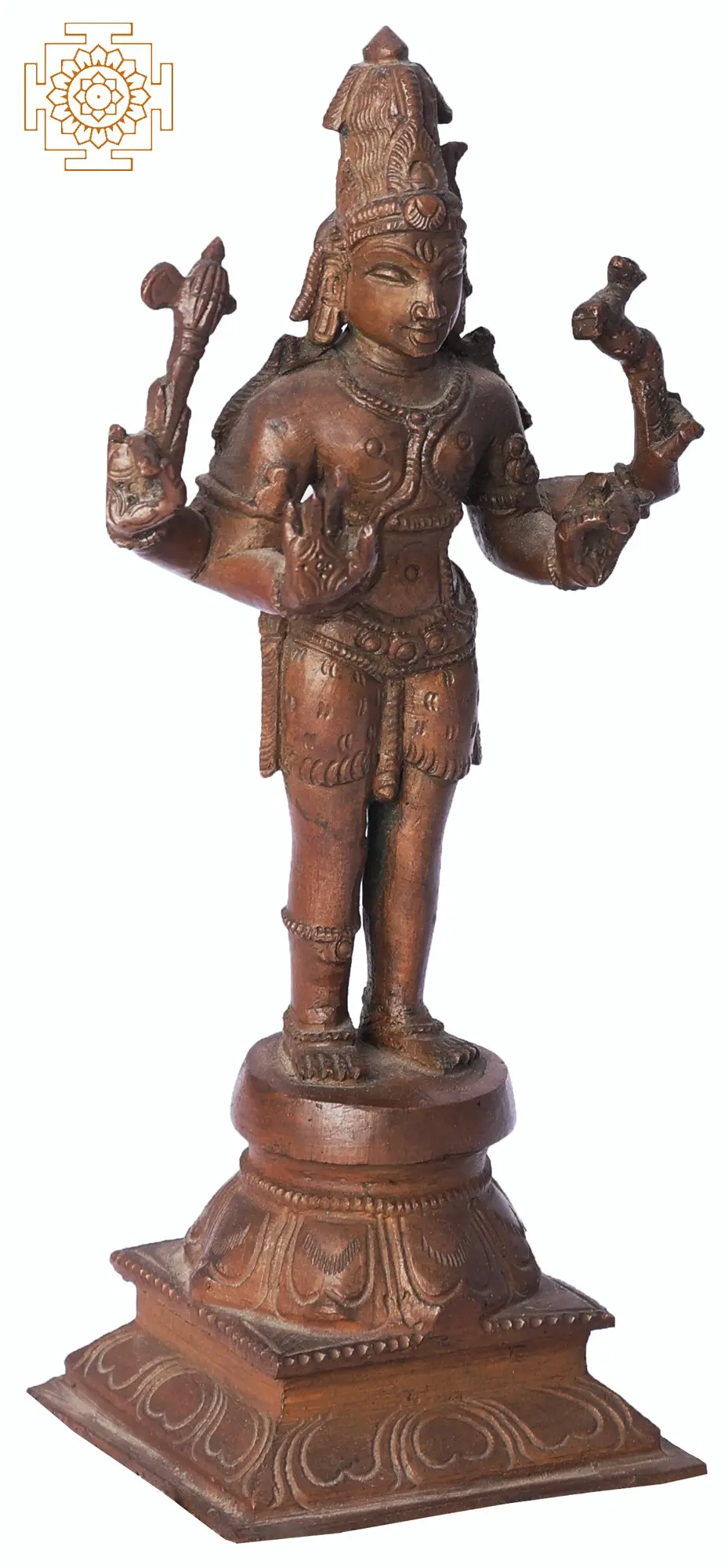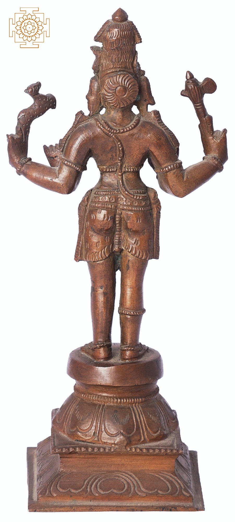 This exquisite bronze sculpture captures the awe-inspiring form of Pashupatinath, a manifestation of Lord Shiva, the protector of all beings. Crafted using the ancient Madhuchista Vidhana (lost-wax) technique by skilled artisans in Swamimalai, this piece is a testament to centuries-old artistic traditions. The sacred Panchaloha alloy, a blend of five metals including copper, tin, zinc, iron, and lead, imbues the statue with a unique luster and spiritual resonance, believed to bring good fortune and ward off negativity.