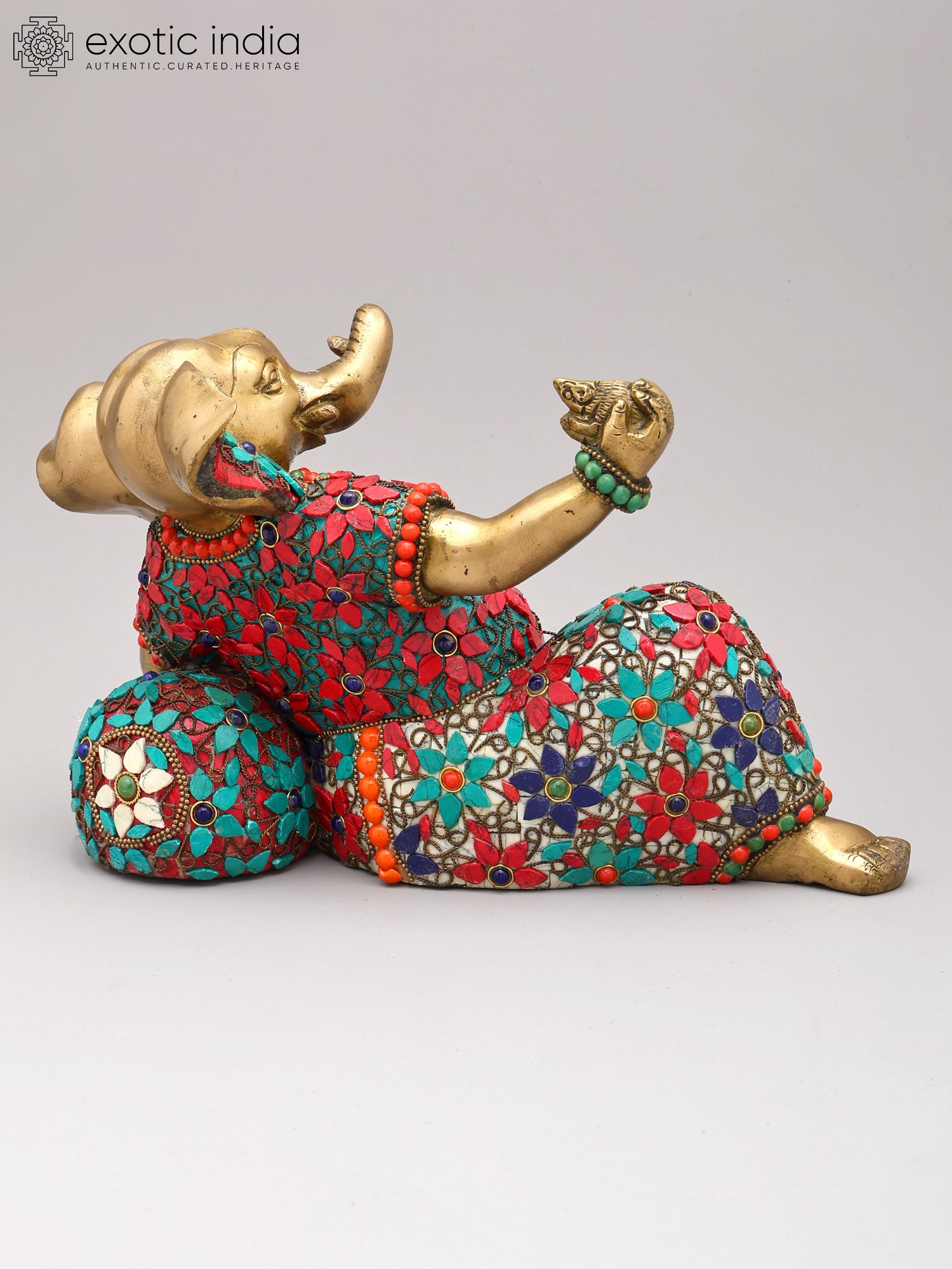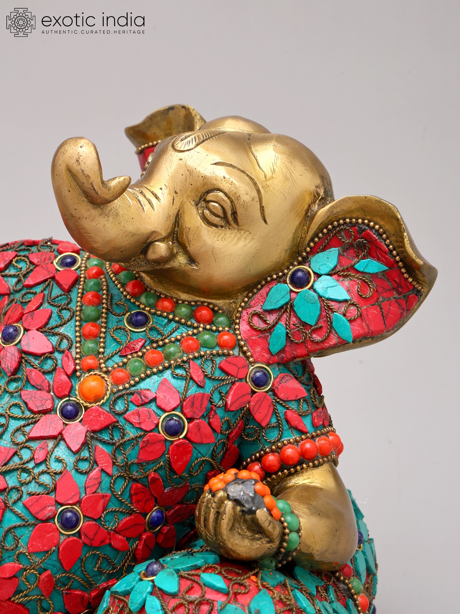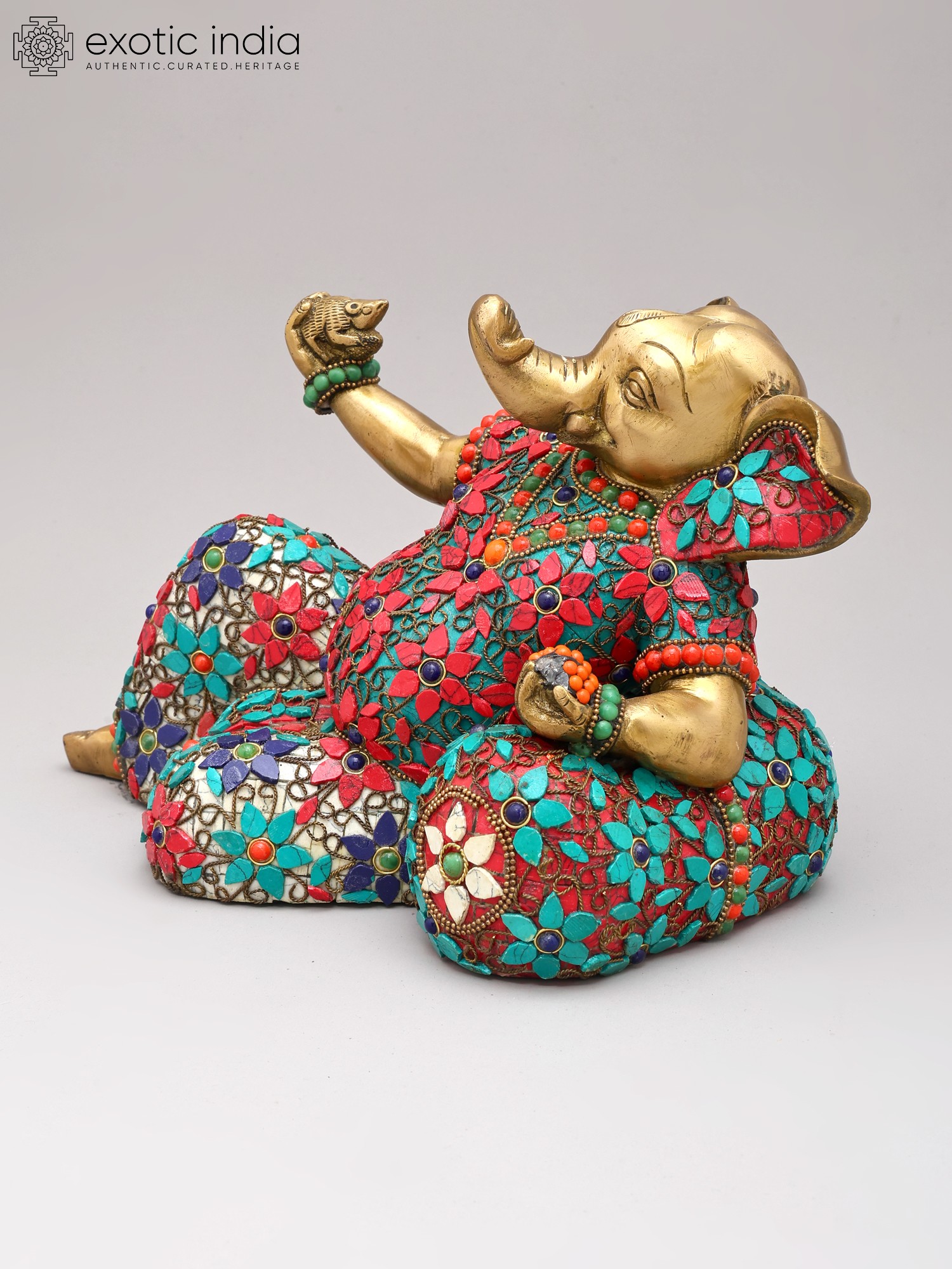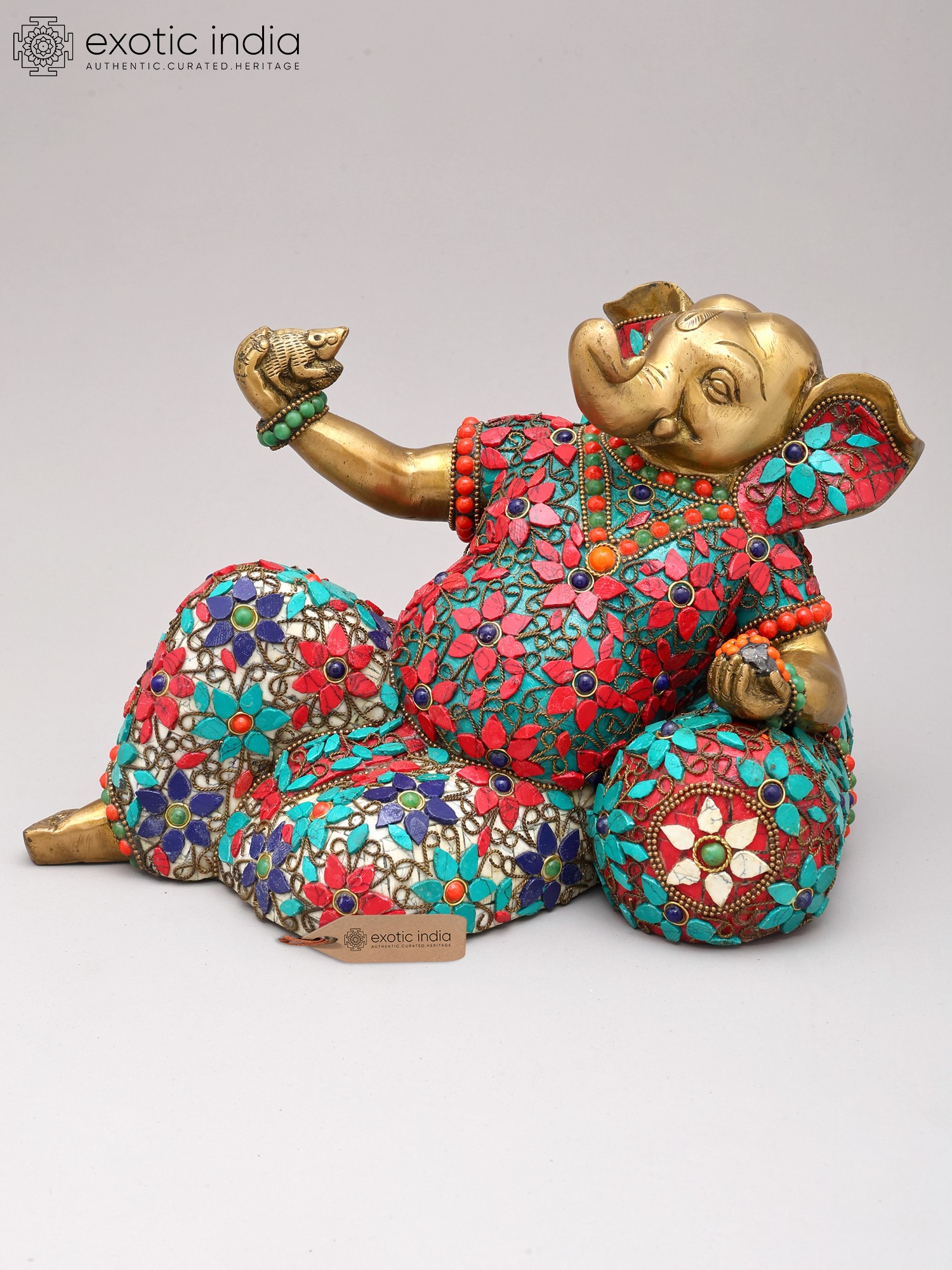A baby Ganesha sculpture is a representation of growth and fruitful opportunities; he is a child’s god that enhances good manners and good health to his devotees. The sculpture shown on this page is Lord Ganesha’s relaxing posture; he has his left hand leaned on the round booster such that it holds the weight of his entire body in the most comfortable posture and right hand is held high in air holding the Mooshakraj (Ganesha’s vahana, mouse). Bala Ganapati is often described to be golden in color representing the bright future prospects just as the one shown here. The child-like smile on his elephant headed face and trunk folded upwards in play-way highlights his act of playing and talking with the mouse. This baby Ganesha sculpture captivates the viewer’s hearts by its sweet and innocent face expressions and gestures.