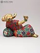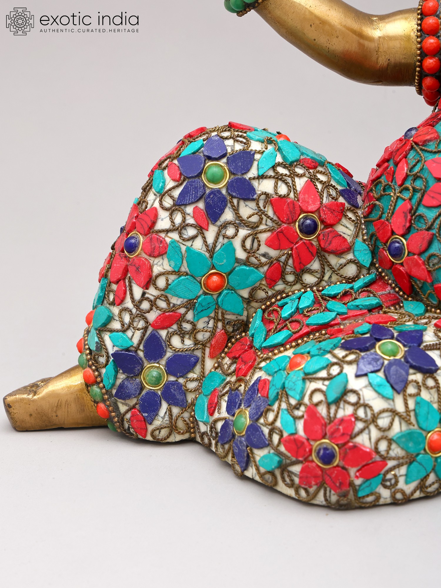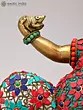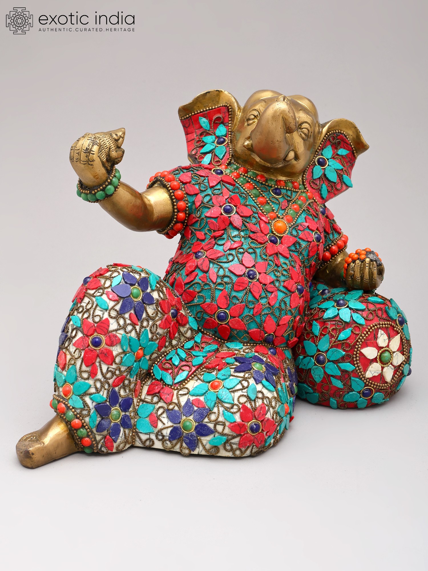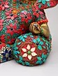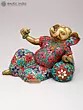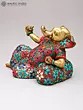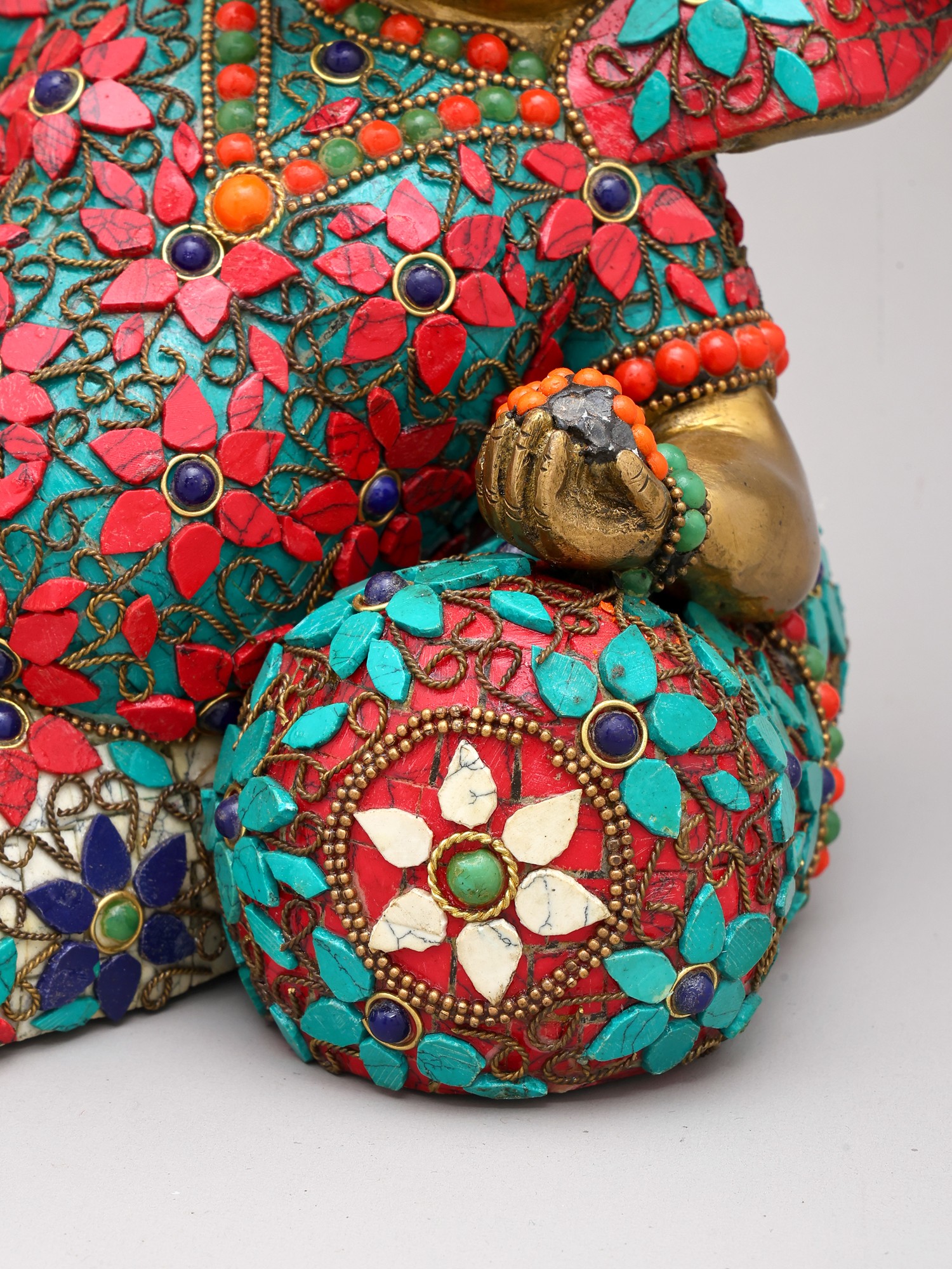 The most attractive part is his colorful robes; garbed in an inlayed turquoise colored half sleeve angarakha having a unique triangular neck design with orange beads and similar on sleeves along with a complementing white dhoti. All of his garbs are decorated with colorful reconstituted stones in interconnected flower patterns and a same kind can be observed in the designing of the booster and his large flappy ears. Have a careful look at the posture of his legs- left one is half hiding behind the other and right is folded up with the foot peeping out from its decorated hem.