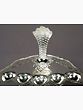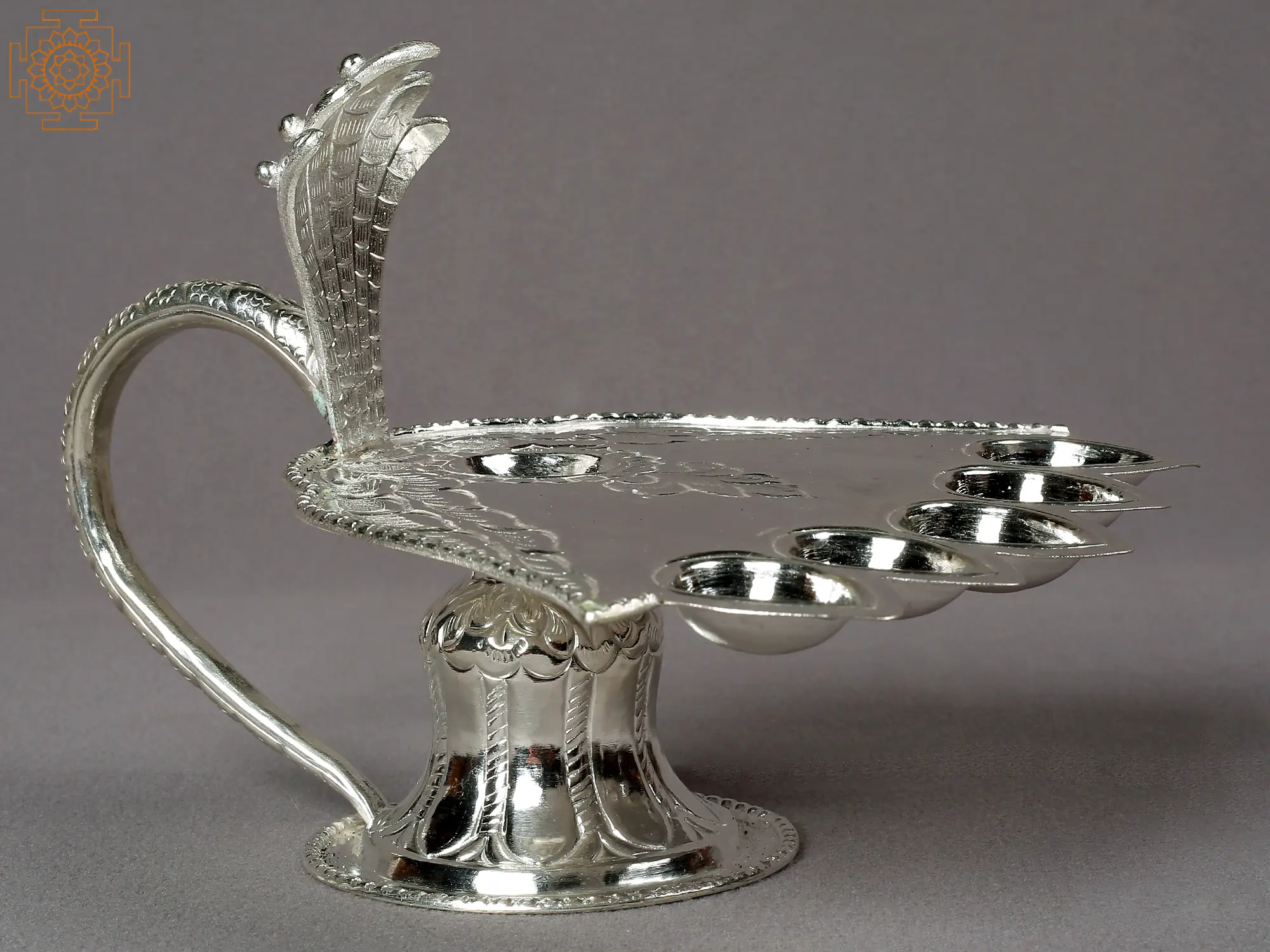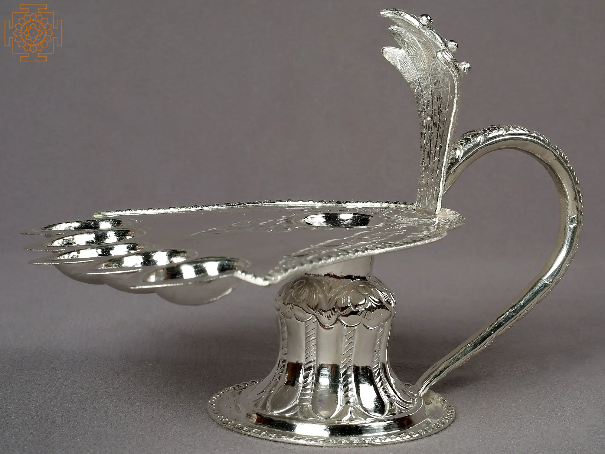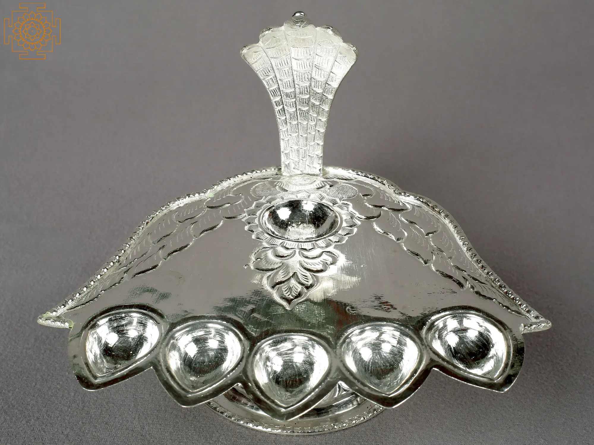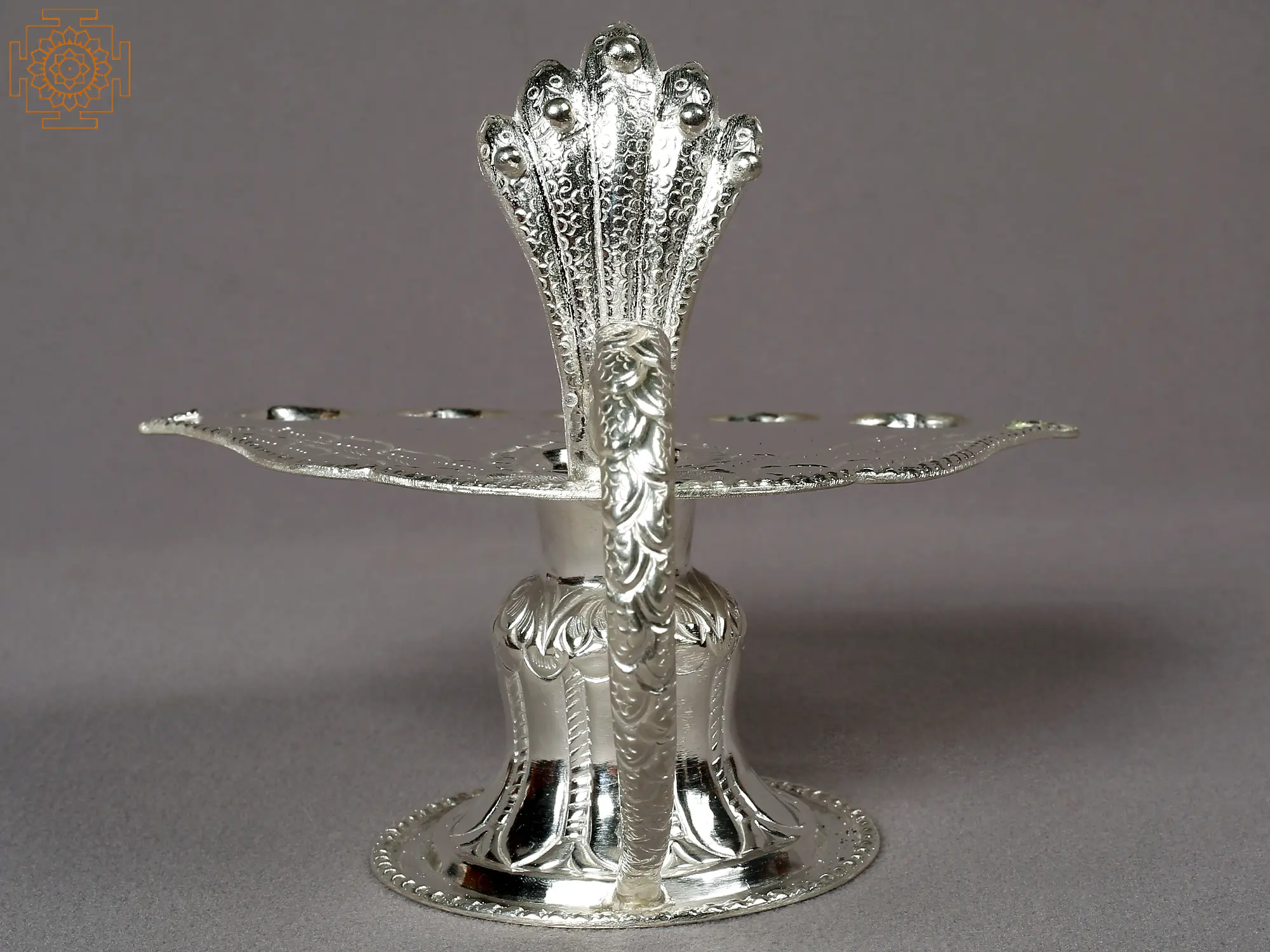 This silver portable Arti Diya Shesh Naag Pancha Deepam is a wonderful ritual object for personal worship areas, combining the ayurvedic benefits of silver metal with the ceremonial importance of giving Aarti to the almighty. In Hindu tradition, it is an auspicious ceremony to provide the deities with the warmth of Agni or sacred flame. When this lamp is lit and moved clockwise in front of the deities, the warmth hits the holy metal, reaches the idols, and is returned to the worshippers in the form of blessings. There is also a small stand for burning camphor in the middle of the lamp, to bring more divine energy into the rituals.