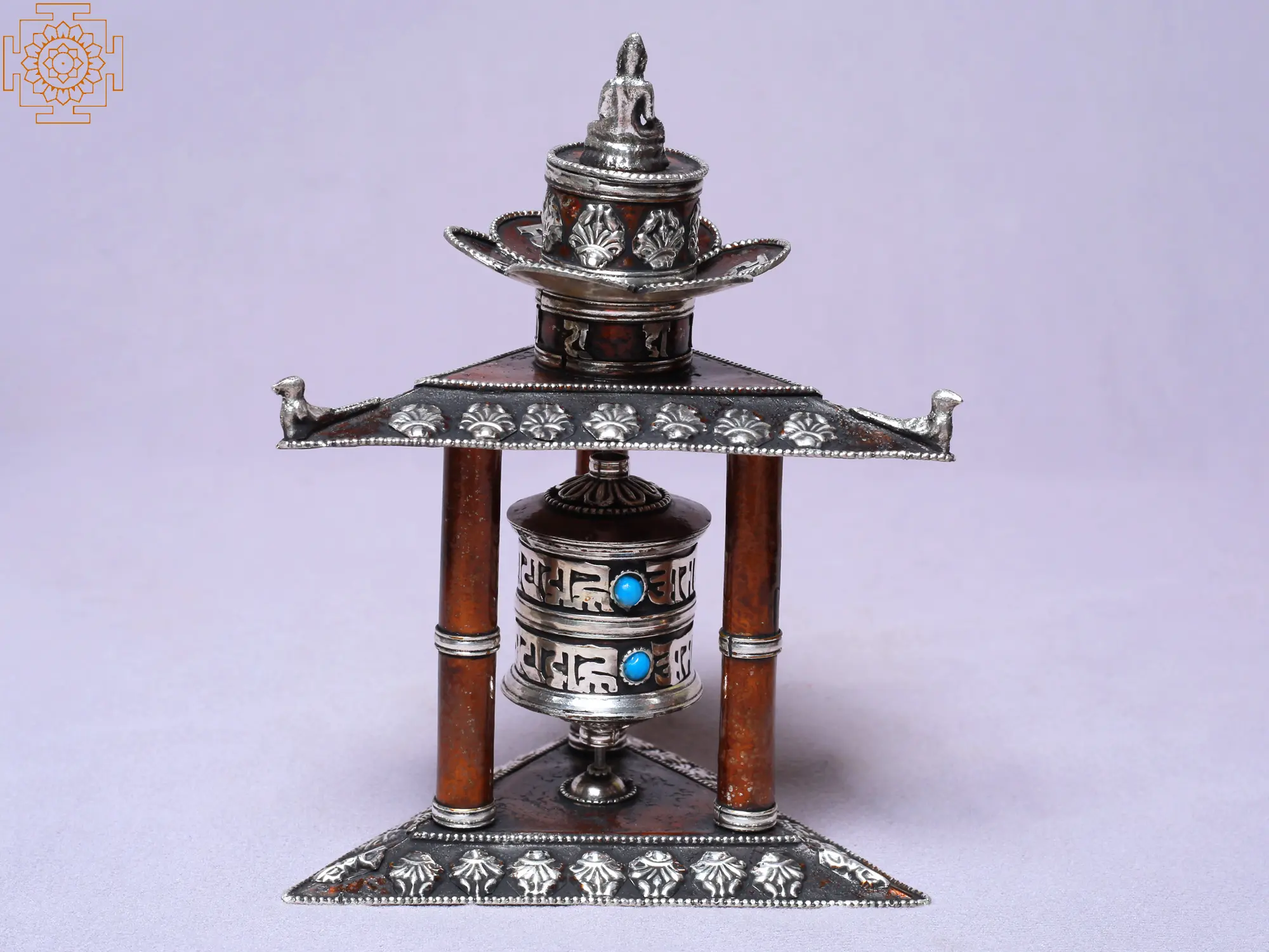 This Mane/Praying wheel is a divine creation reminiscent of a temple structure. This prayer wheel is crafted with copper and enhanced with silver plating, symbolizing virtue and divine radiance. It features three pillars that represent the foundational aspects and strength of spiritual practices. At the top of the prayer wheel rests a statue of Buddha, honoring his enlightened presence in those who engage themselves in meditative practices. The prayer wheel itself serves as a focal point for prayer and meditation in Buddhism. It is a revered tool for attaining spiritual enlightenment, following the path of the Bodhisattvas, and connecting with the wisdom and compassion of Lord Buddha.