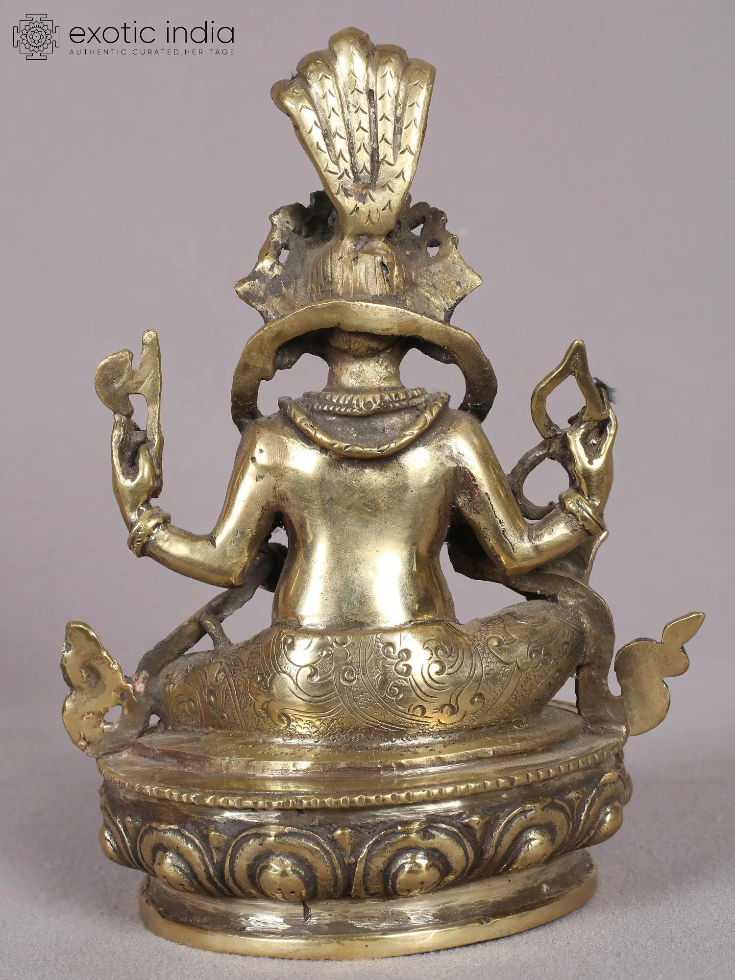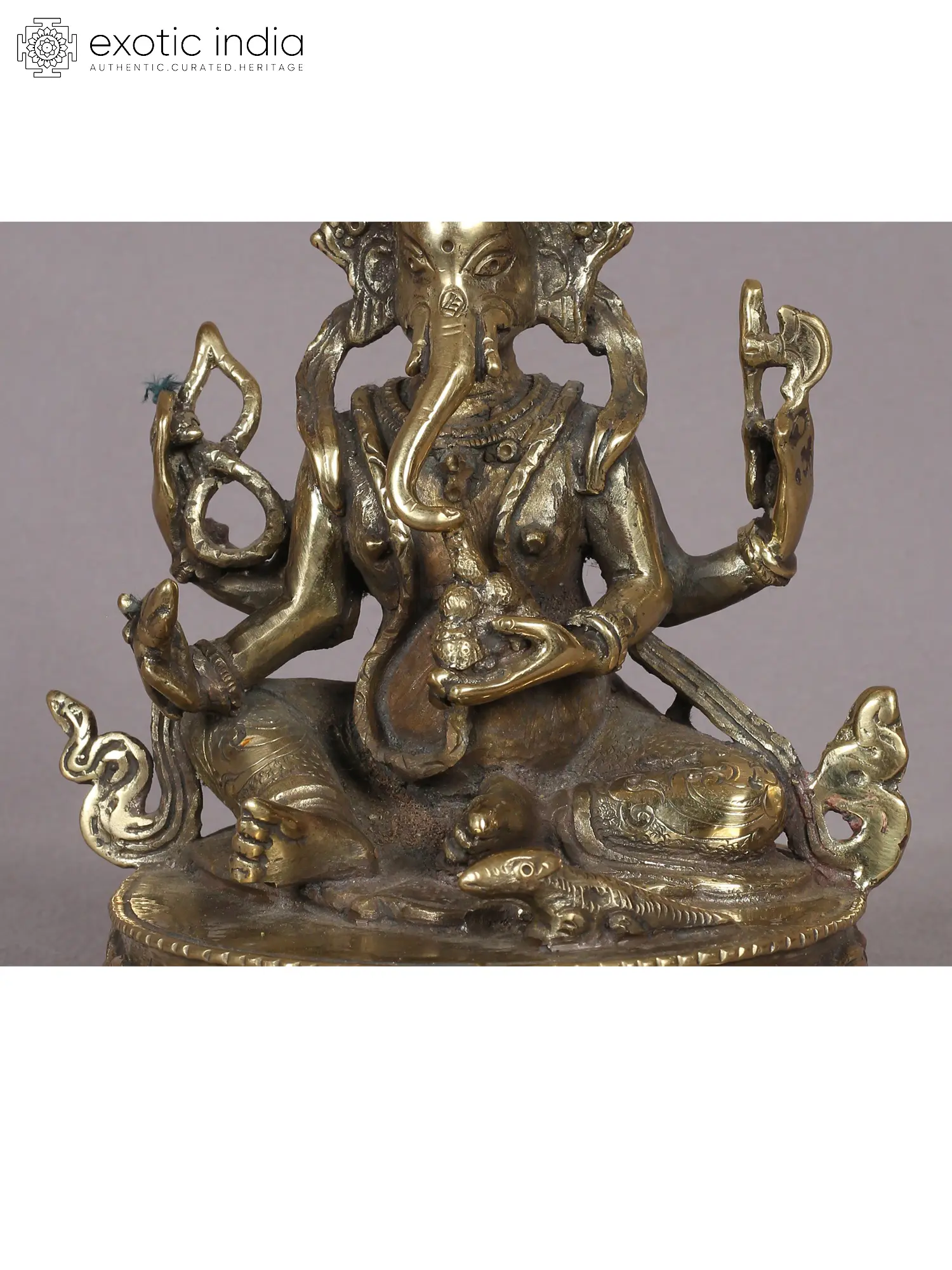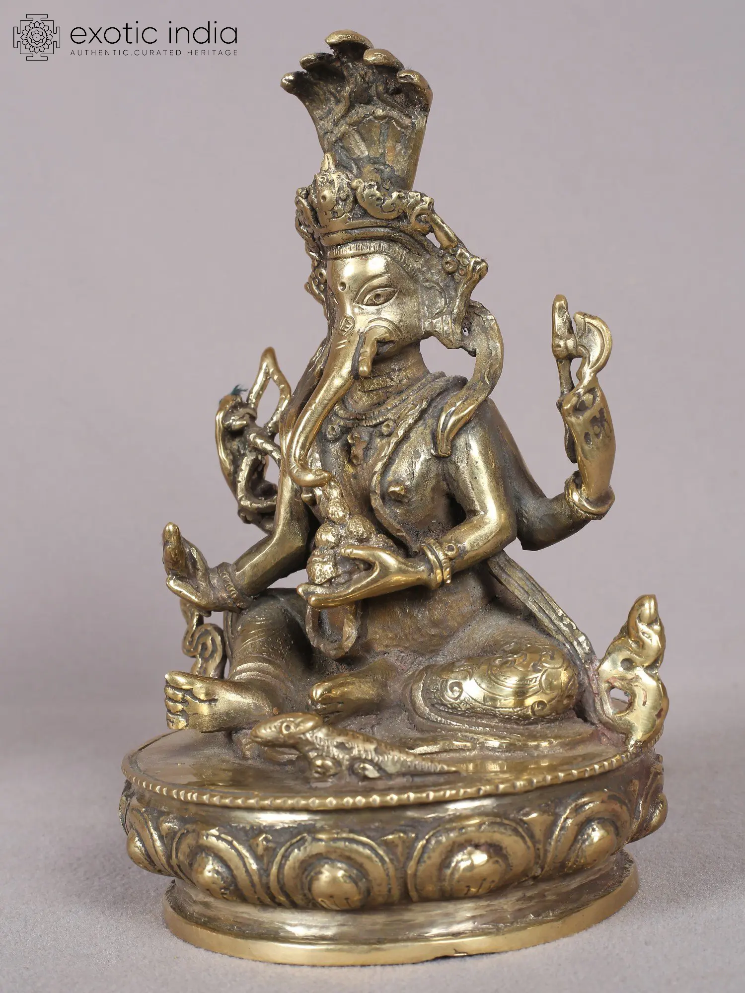 In the vast cosmos of spiritual reverence, Lord Ganesha stands as a universal beacon. This brass sculpture beautifully portrays the deity in sukhasana (seated pose), accompanied by his faithful vahana, Mushakaraj, positioned near his left leg.