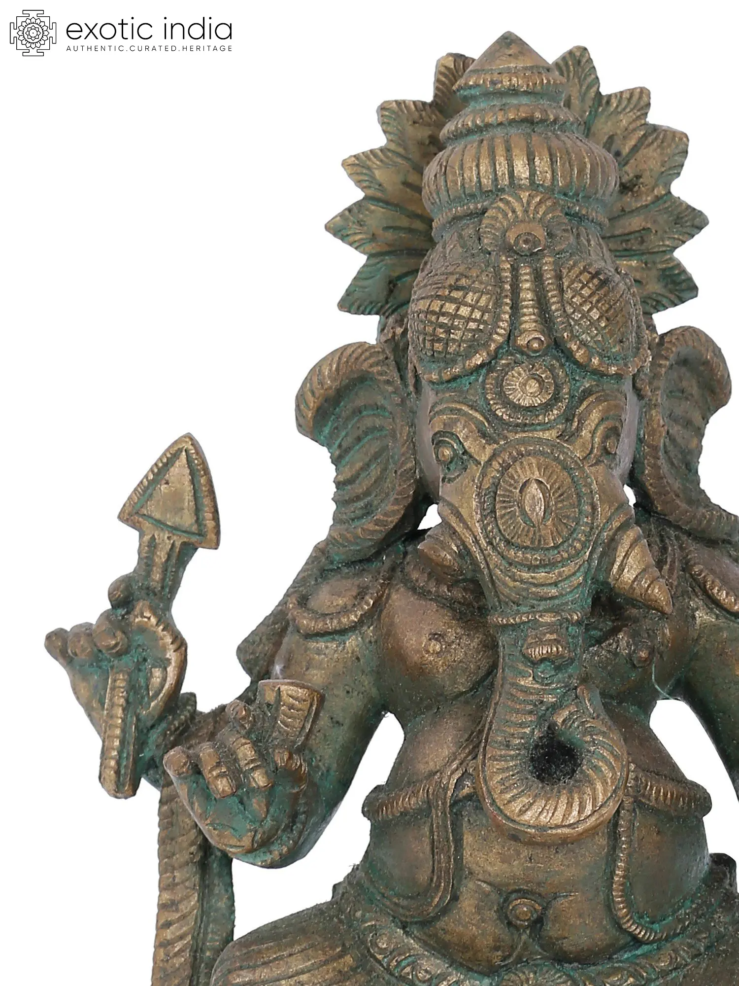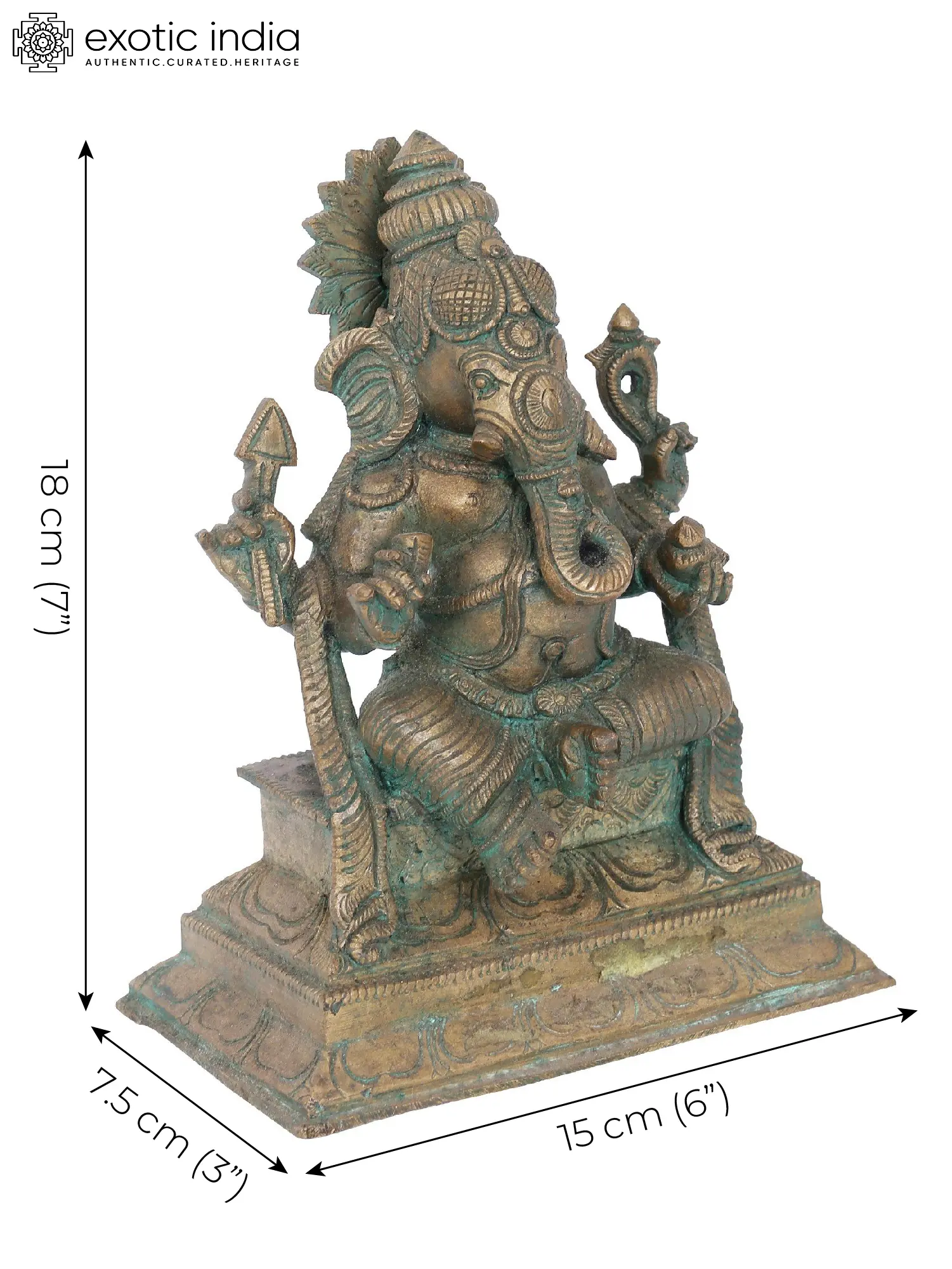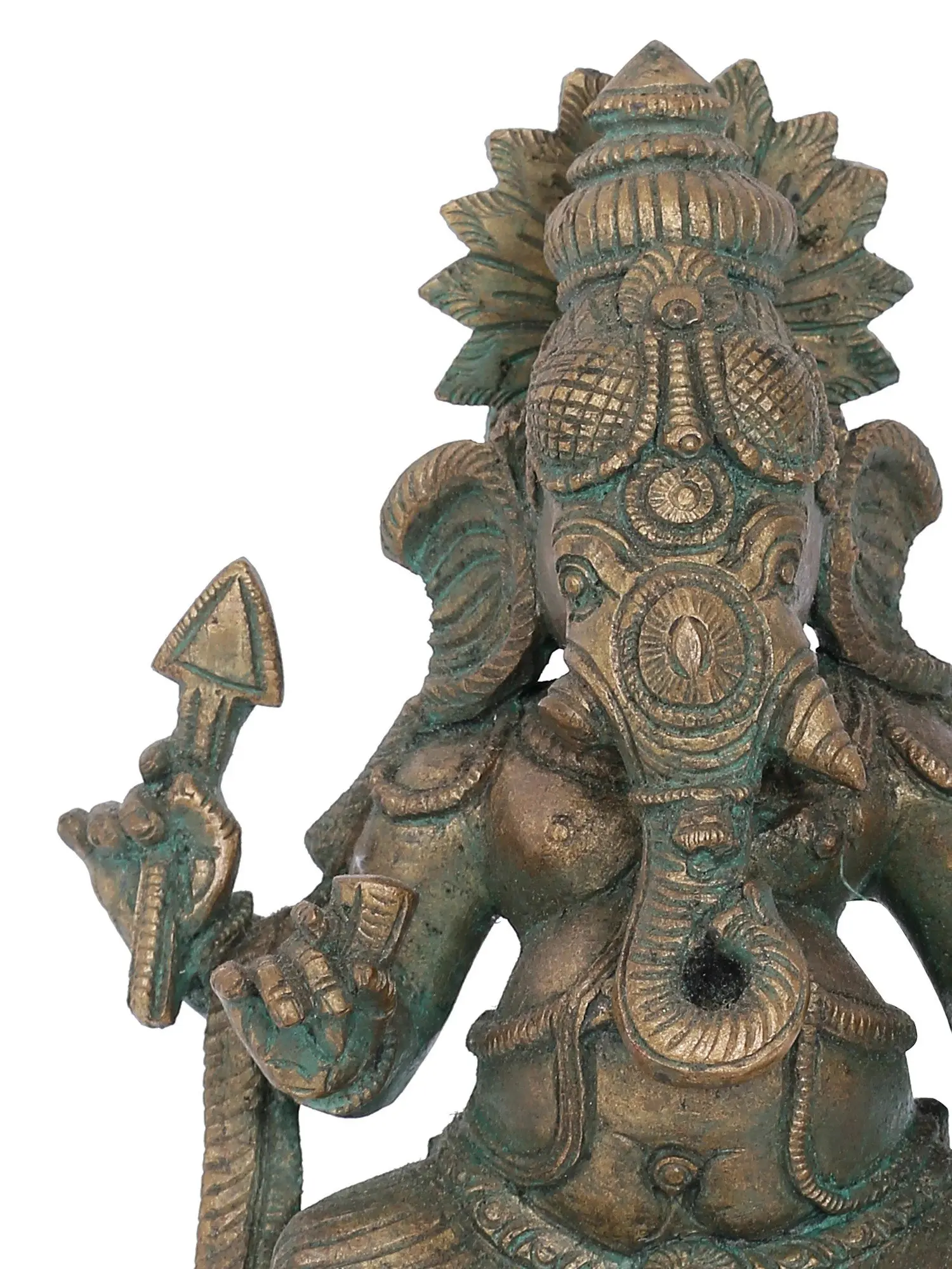 Bow before the regal presence of Raja Ganapathi, a majestic creation meticulously formed through Madhuchista Vidhana in Panchaloha Bronze from the sacred land of Swamimalai. Lord Ganesha reigns supreme as the royal sovereign, radiating benevolence and wisdom to those seeking divine guidance. Here, Lord Ganesha is depicted in all his regal charm. He holds a noose or Pasha in his upper left hand and a bowl of elixir in his lower left hand. His two right hands hold an arrow and a broken tusk, respectively. This form of Lord Ganesha sits on a lotus podium, signifying his patronage of the virtues of wisdom. Every detail of this sculpture serves as a visual ode to the regality and magnificence of Raja Ganapathi, inviting devotees to witness the divine ruler in all his majestic glory.