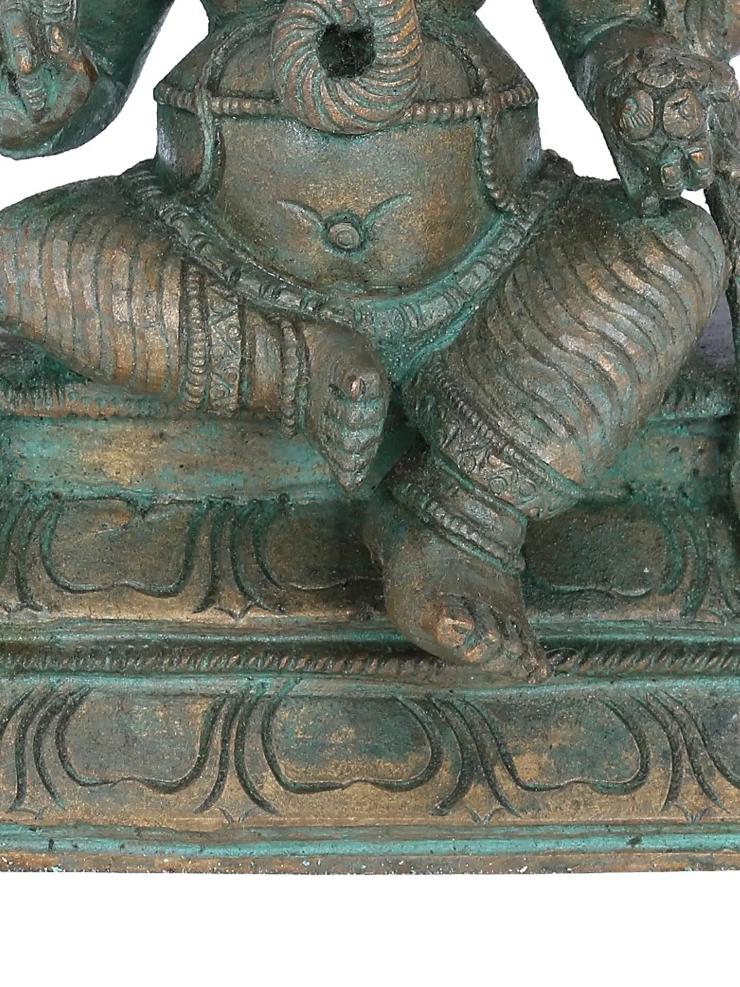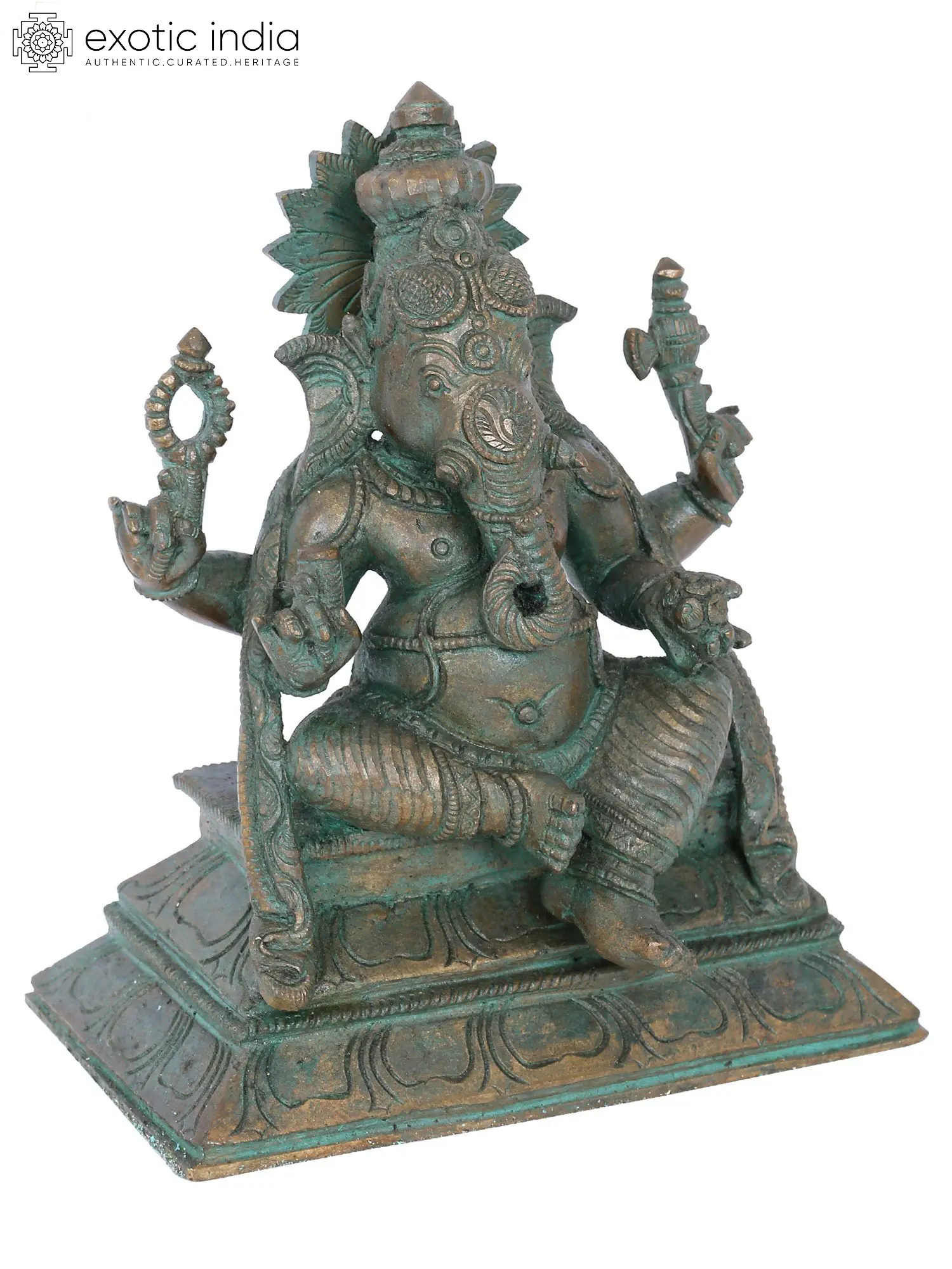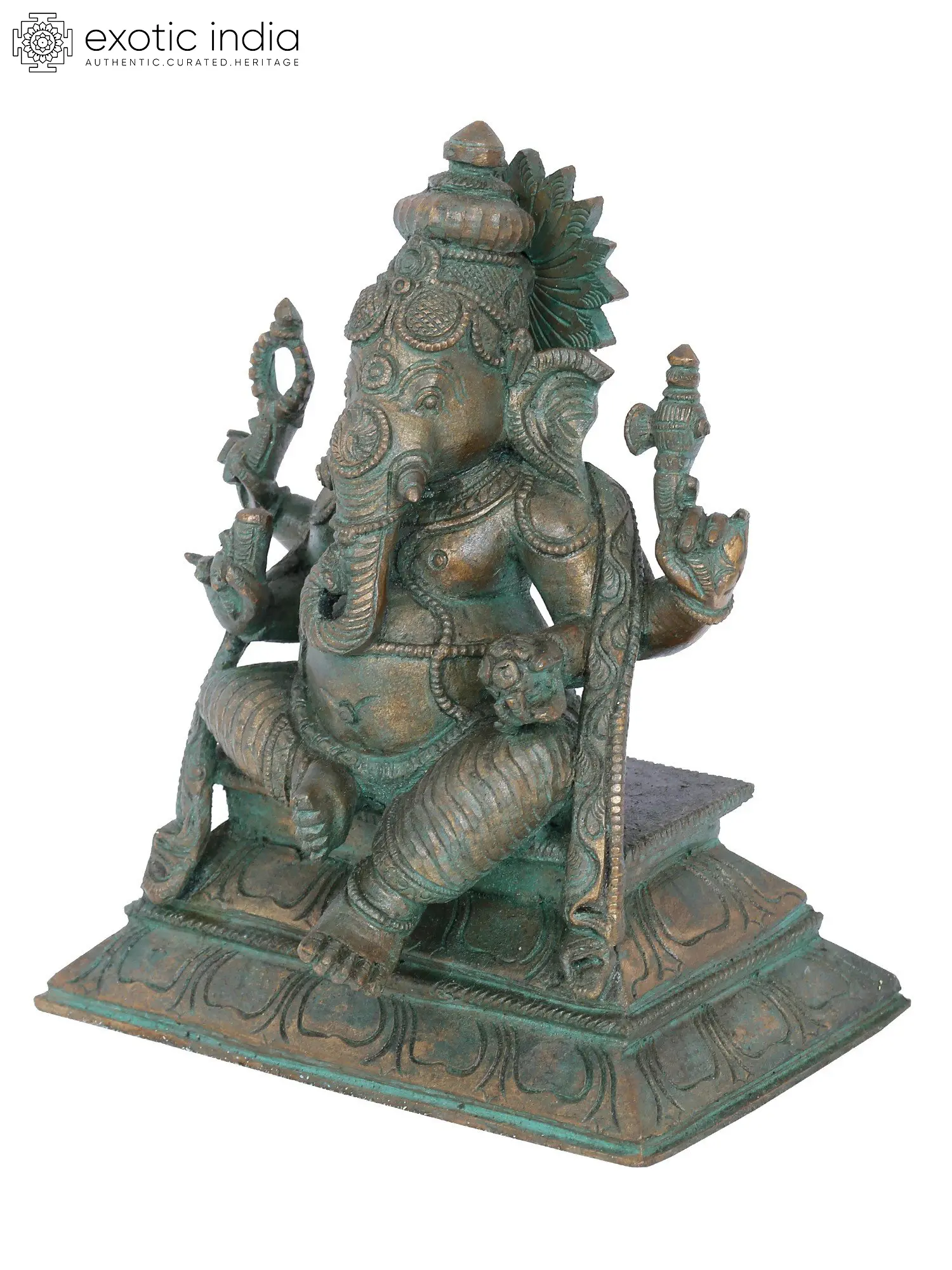 Lord Ganesha sits in the Lalit asana posture and holds the Goad and Noose in his upper hands. He holds a broken tusk and a Modak in his lower hands. The lotus podium has been chosen as his seat due to his patronage of the virtue of wisdom. His robe falls from both sides of his shoulder, presenting a view that resembles fantasy. Here, Lord Ganesha is ornamented with various jewels and wears a Kirat Mukuta, a regal stature symbol. This bronze statue is a tribute to the most loved deity of the Hindu pantheon and justifies his regal status.