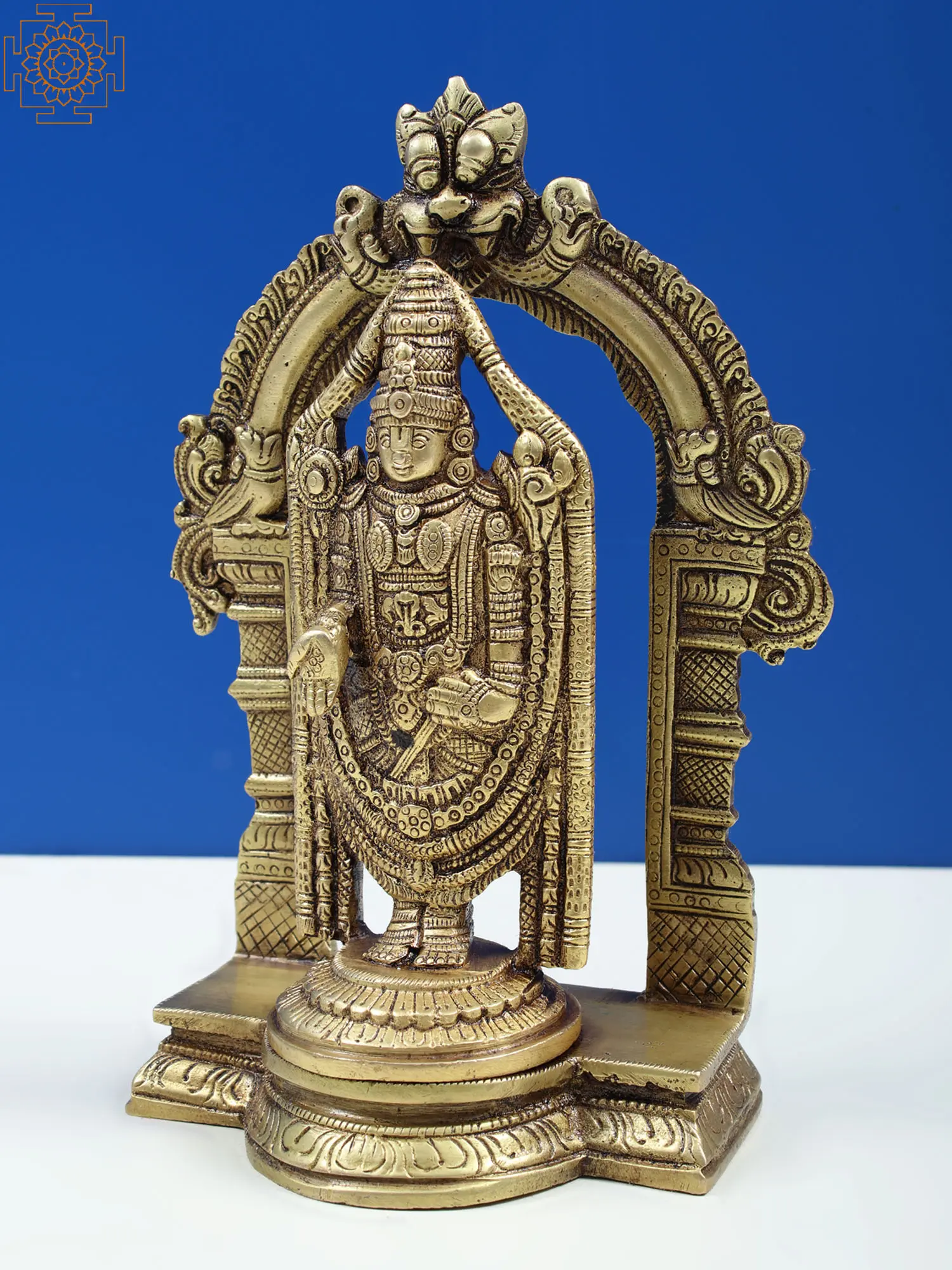 The brass sculpture of Lord Venkateshvara at Tirupati showcases a divine invitation. Venkateshvara, known as Balaji, is a symbol of unconditional grace and love. He stands with his hand raised, offering blessings to all who seek his presence. This sculpture personalizes the warmth and acceptance found at the sacred hills of Tirupati, reminding us that the divine is accessible to all. The raised hand signifies an invitation to receive grace and love, making it an embodiment of the boundless love and blessings found in the holy abode of Lord Venkateshvara.