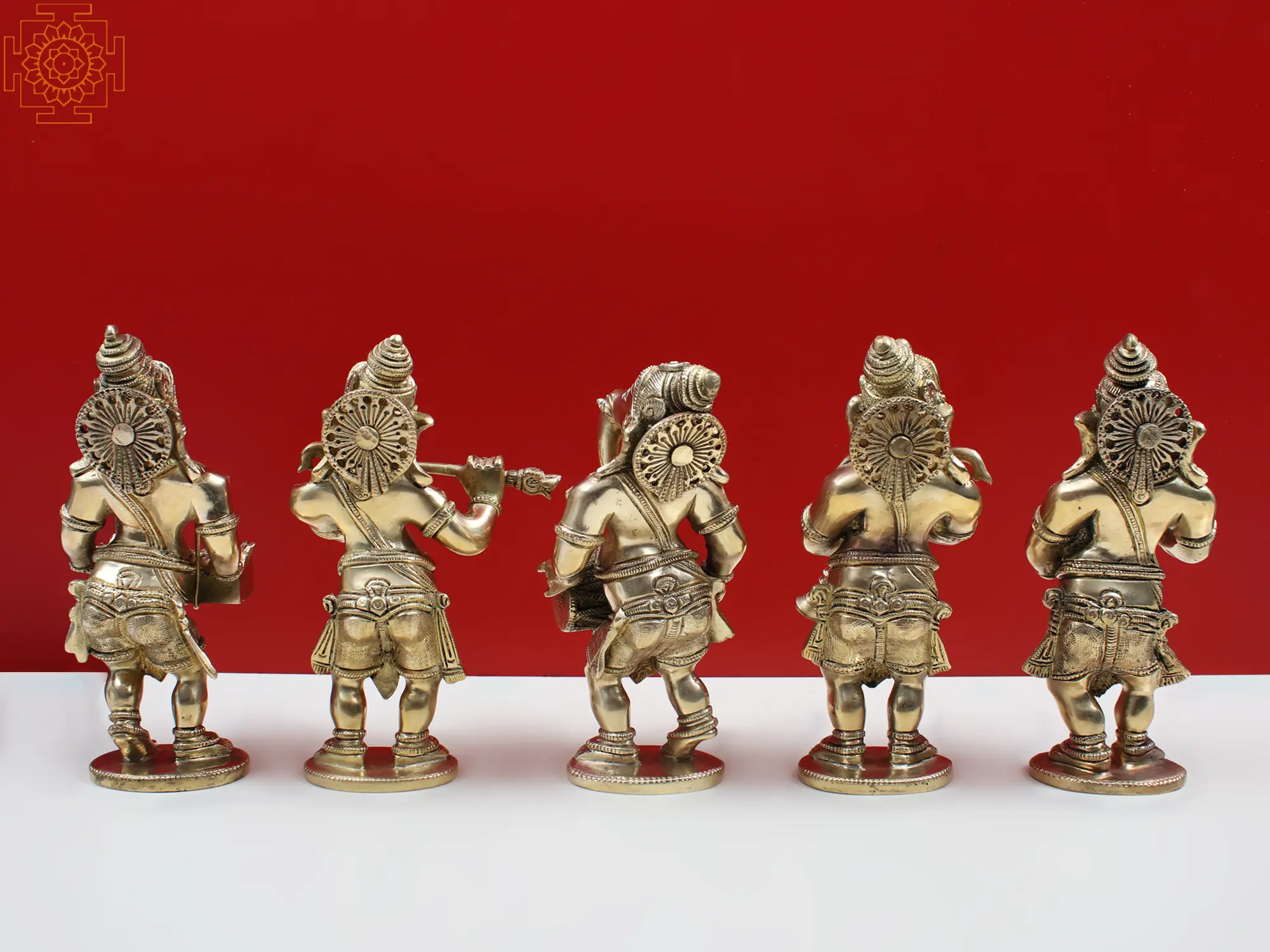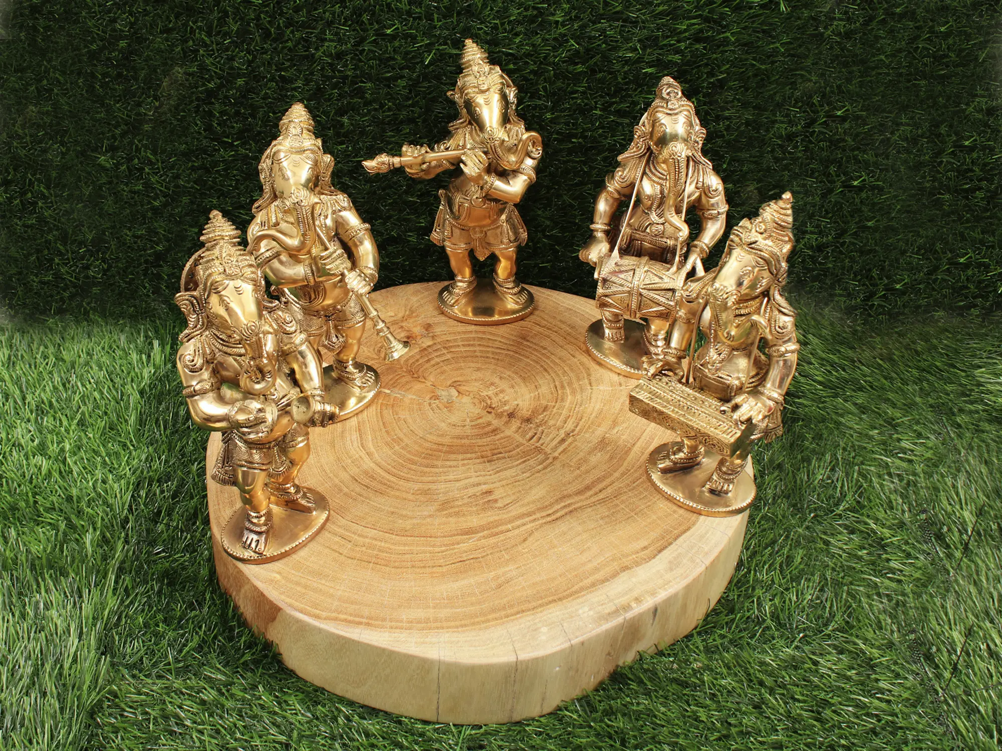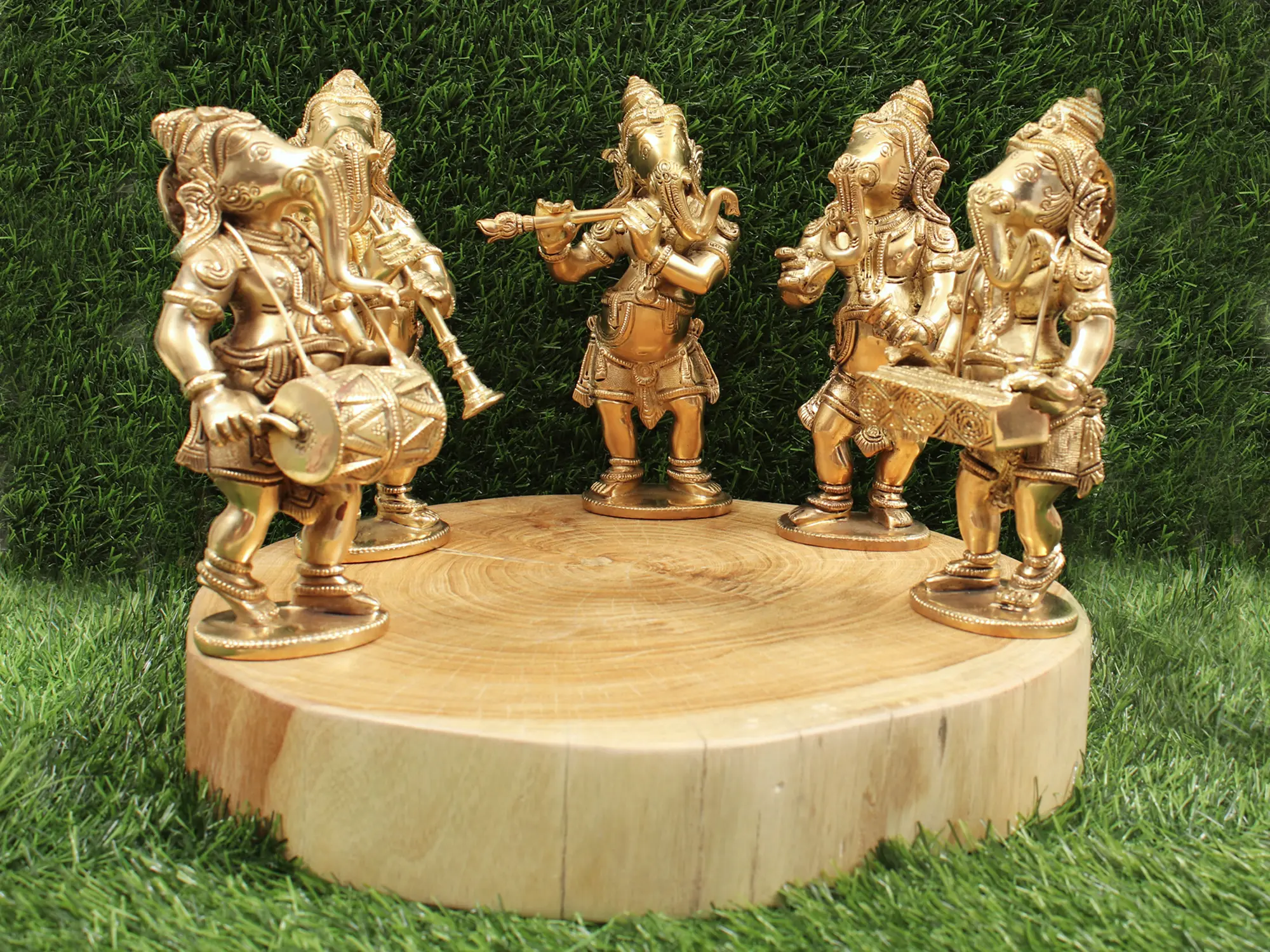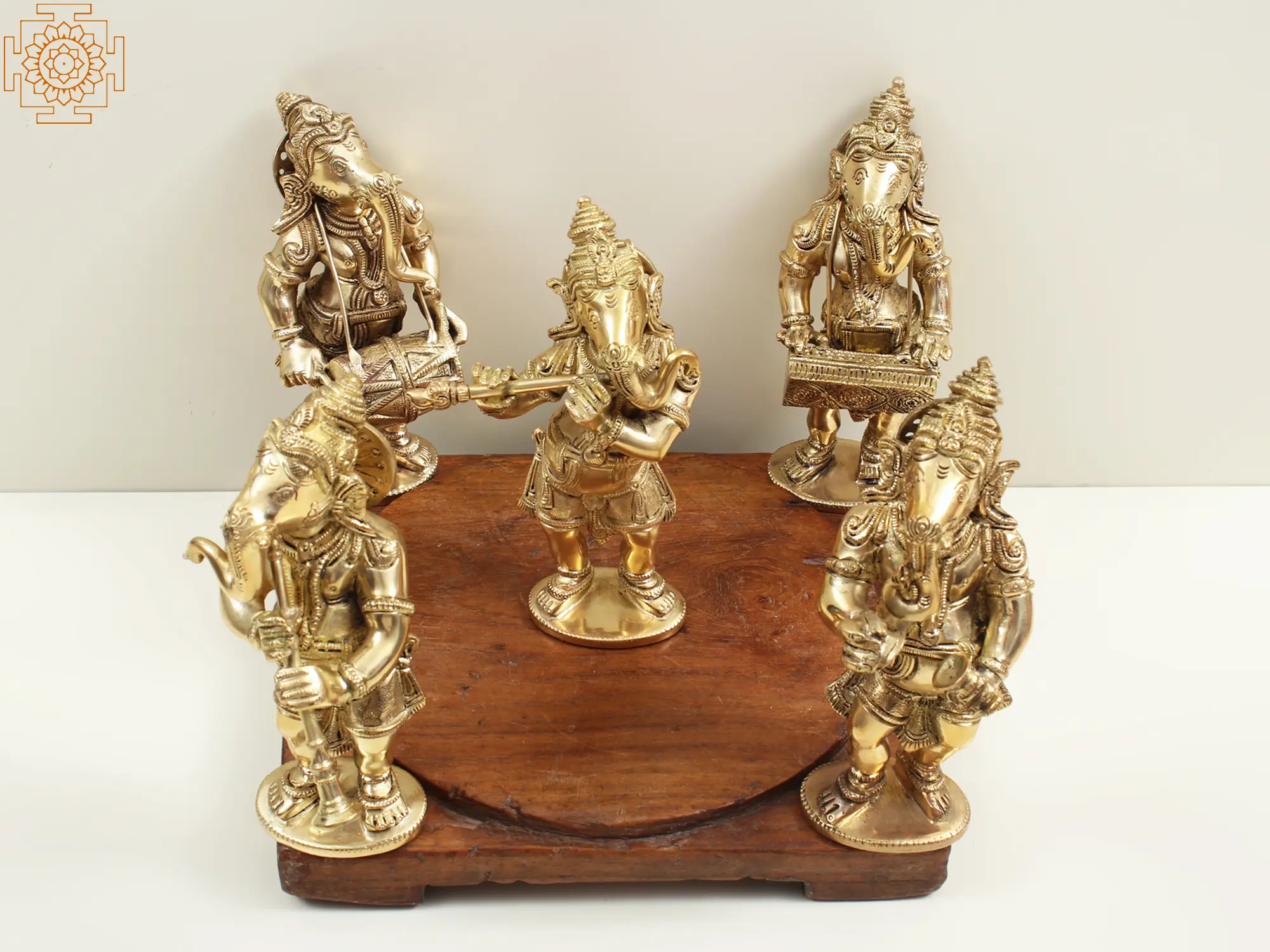 Invite the benevolent presence of Lord Ganesha into your home with this exquisite set of five brass sculptures. Each piece, meticulously crafted from lustrous brass, depicts the beloved elephant-headed deity in a unique musical pose, celebrating the joy and harmony that Ganesha represents. Standing at a modest 7 inches, these statues are perfectly proportioned to grace any shelf, altar, or tabletop, adding a touch of divine artistry and spiritual significance to your living space.