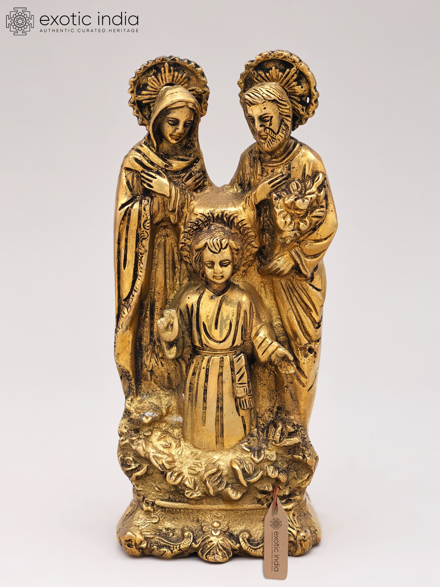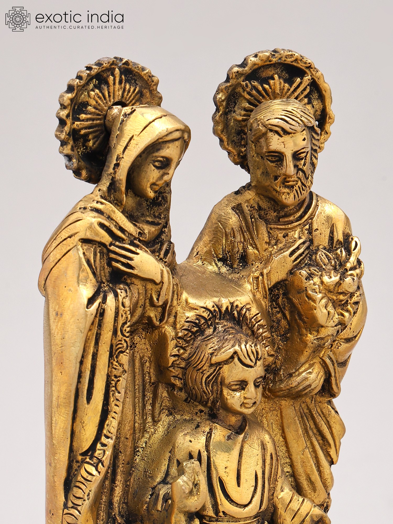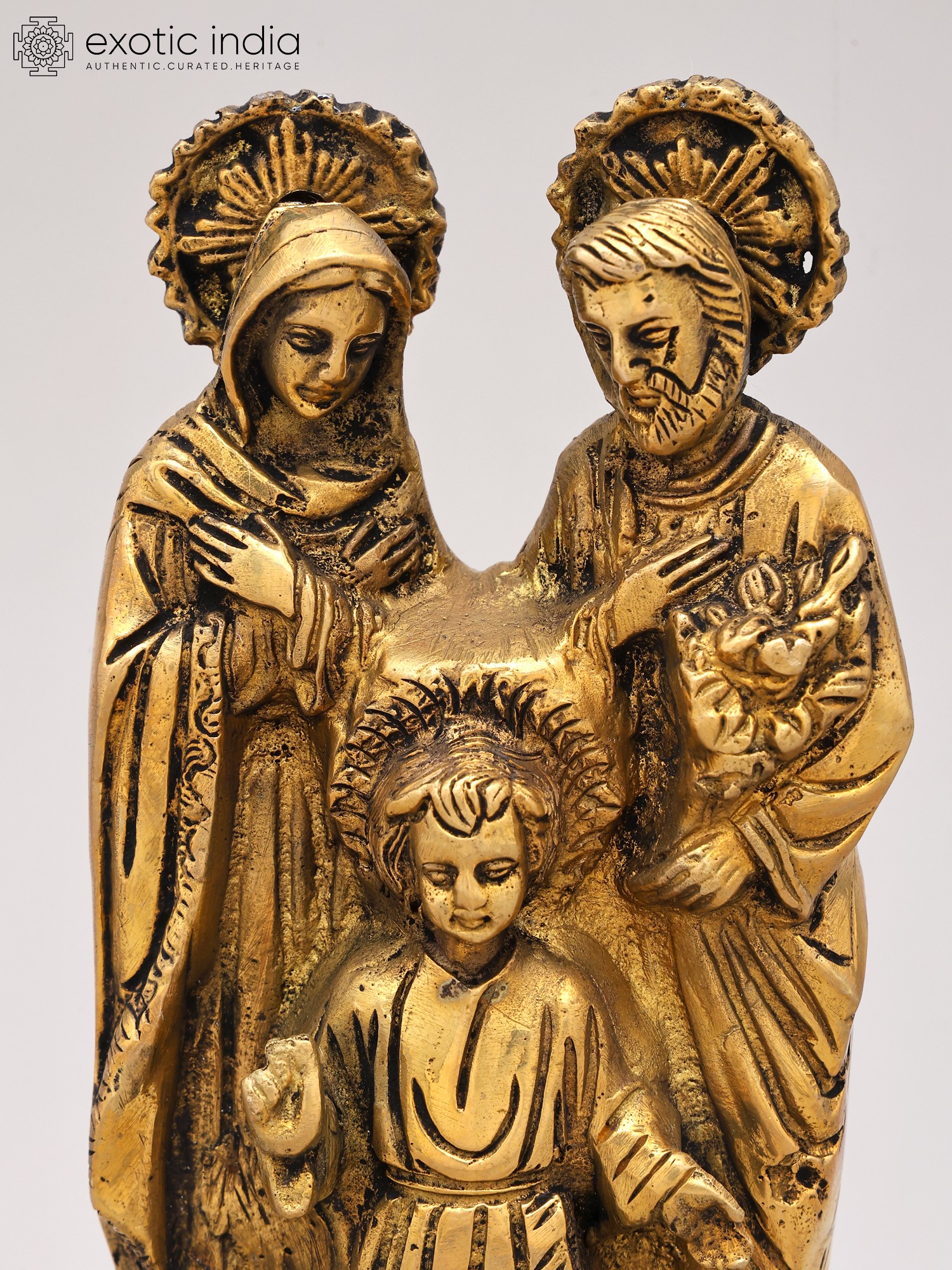 Each element of this handmade brass statue speaks to a rich tradition of artistic dedication. The intricate detailing on the robes, the delicate features of the faces, and the ornate halos all contribute to the profound spiritual resonance of the piece. The base, adorned with floral motifs, further enhances the visual appeal and symbolizes the flourishing of faith and life. Brass, a material known for its durability and inherent beauty, is perfectly suited to immortalize such a revered subject. In many cultures, brass is associated with purity, prosperity, and auspicious beginnings, making it an ideal medium for a religious artifact. The iconography of the Holy Family has deep roots in Christian art and theology. Their story, beginning with the Annunciation and culminating in the flight to Egypt and their humble life in Nazareth, is a narrative of divine intervention, unwavering faith, and profound love. Saint Joseph, in particular, is often revered as the patron saint of workers, fathers, and the universal Church, a figure of silent strength and righteous action. This sculpture serves as a tangible reminder of these spiritual figures and their significant roles in the salvation history.