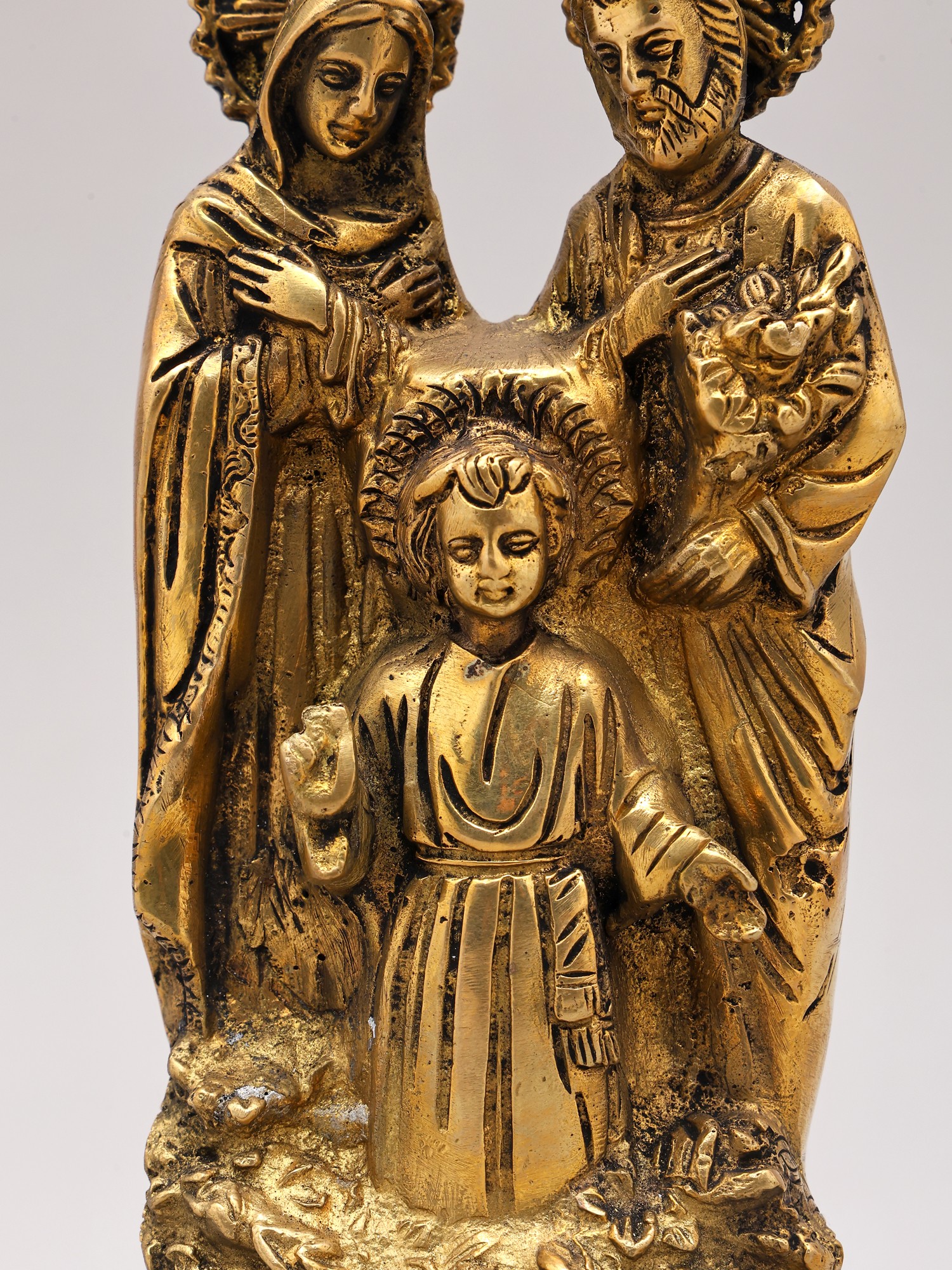 This exquisite brass sculpture captures the profound essence of the Holy Family – Mother Mary, Saint Joseph, and the infant Jesus. Rendered with masterful detail, the figures stand as a testament to the enduring power of faith, love, and familial bonds. The warm, lustrous finish of the brass imbues the sculpture with a sacred aura, making it a captivating centerpiece for any devotional space or a cherished heirloom for generations to come. The Holy Family represents an ideal of sanctity within the Christian tradition. Mary, the Virgin Mother, is often depicted with a serene expression, a symbol of her purity and maternal devotion. Joseph, her chaste husband and guardian, is portrayed with a posture of protection and gentle strength, embodying his role as the earthly father and protector of Jesus. The Christ Child, the divine infant, radiates innocence and the promise of salvation, often shown with a gesture of blessing or engagement with his earthly parents. Together, they form a tableau of divine grace and human tenderness, a beacon of hope and a reminder of the sacredness of family life.