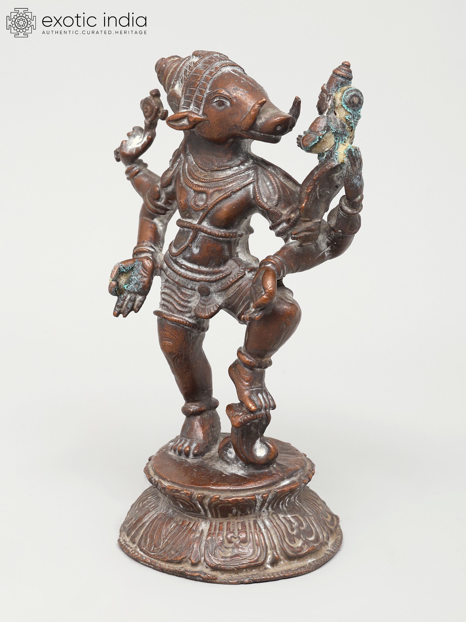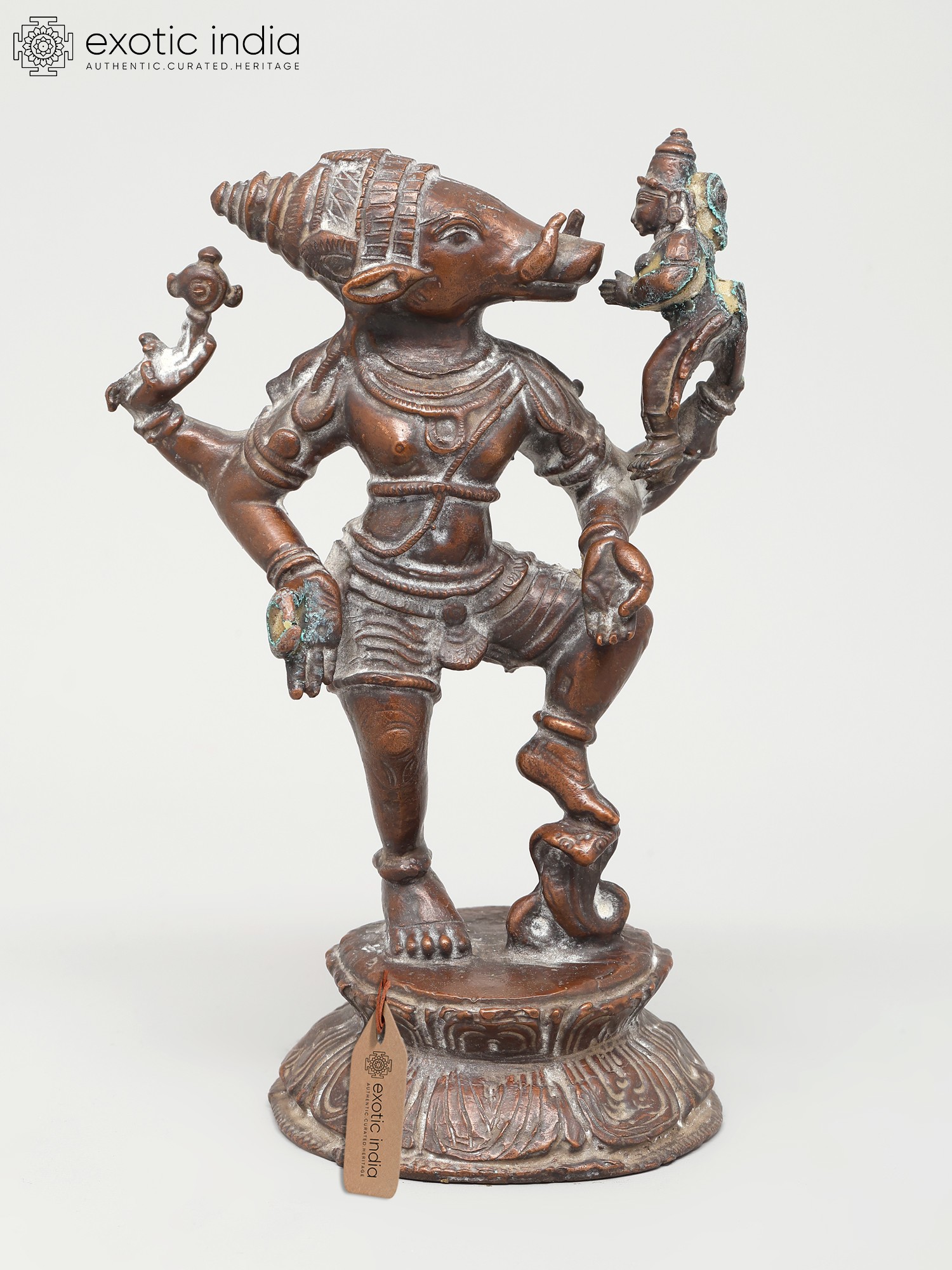 6" Small Standing Lord Varaha with Protecting Naag | Copper Statue