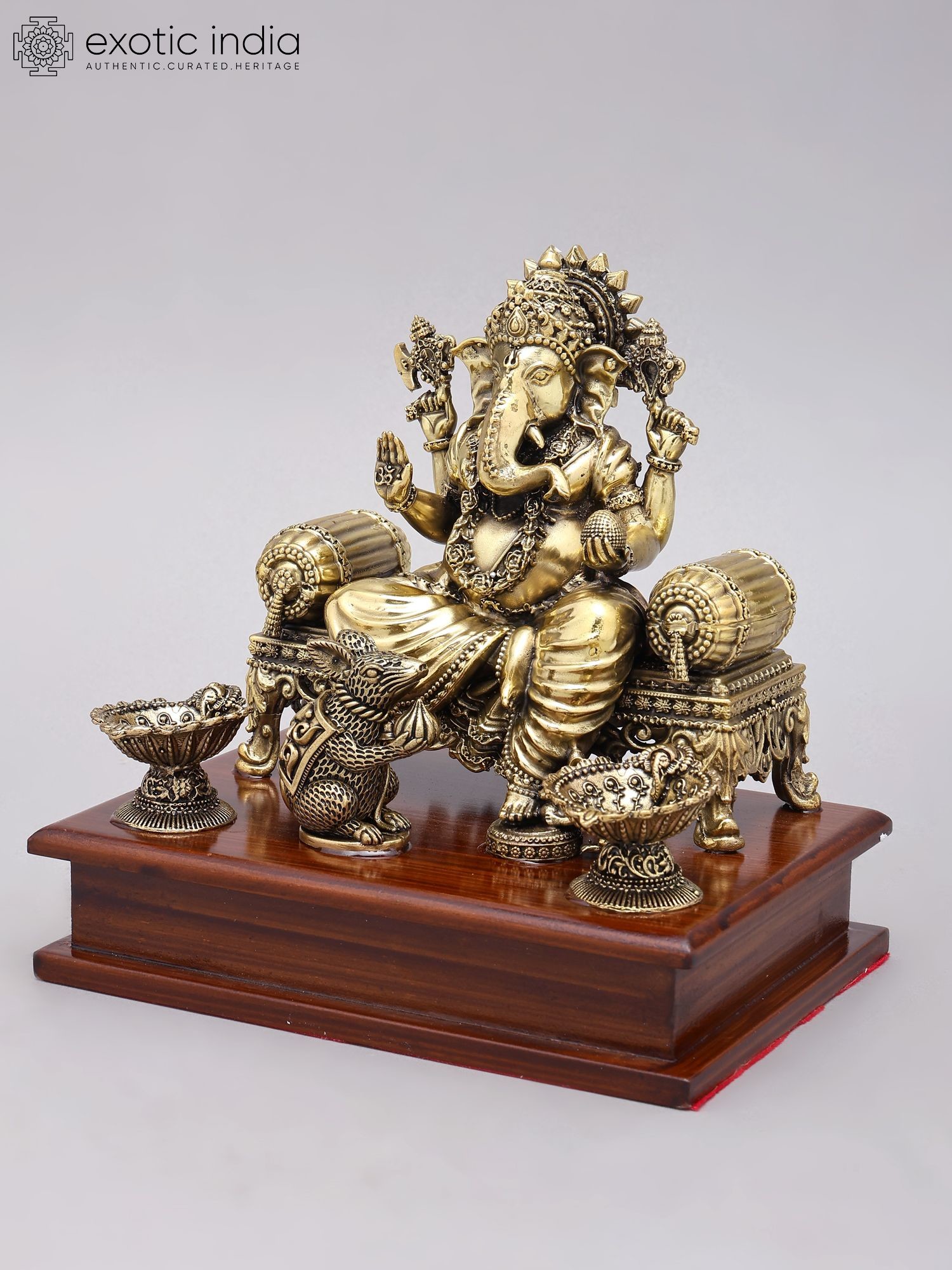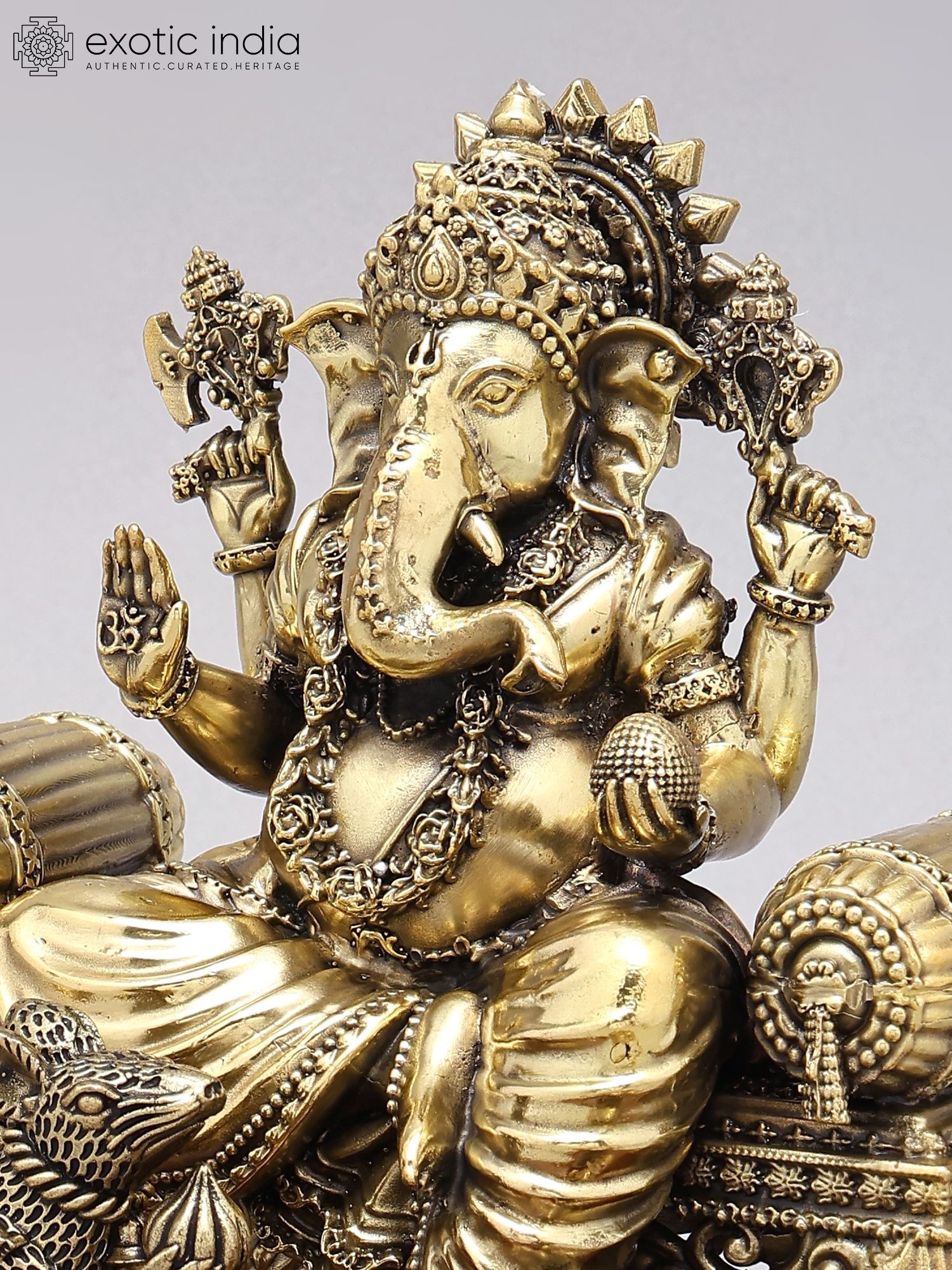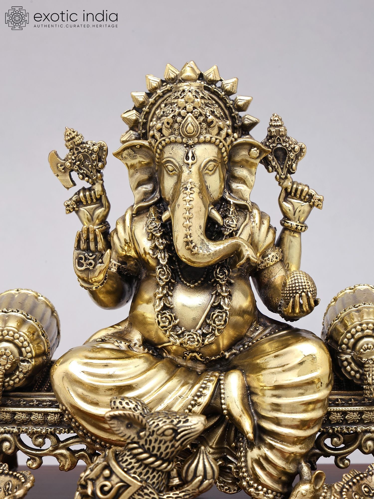 Adorned with traditional iconography, including his vahana (vehicle), the mouse.