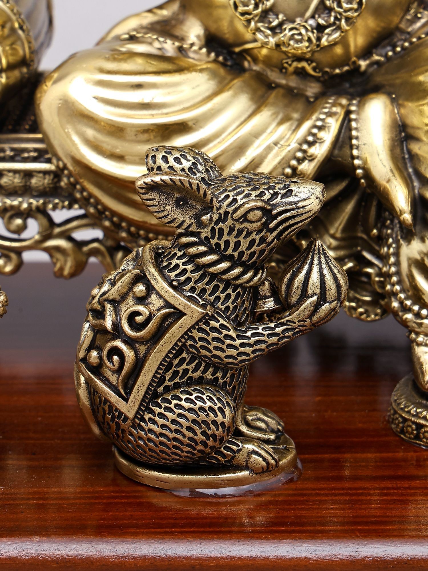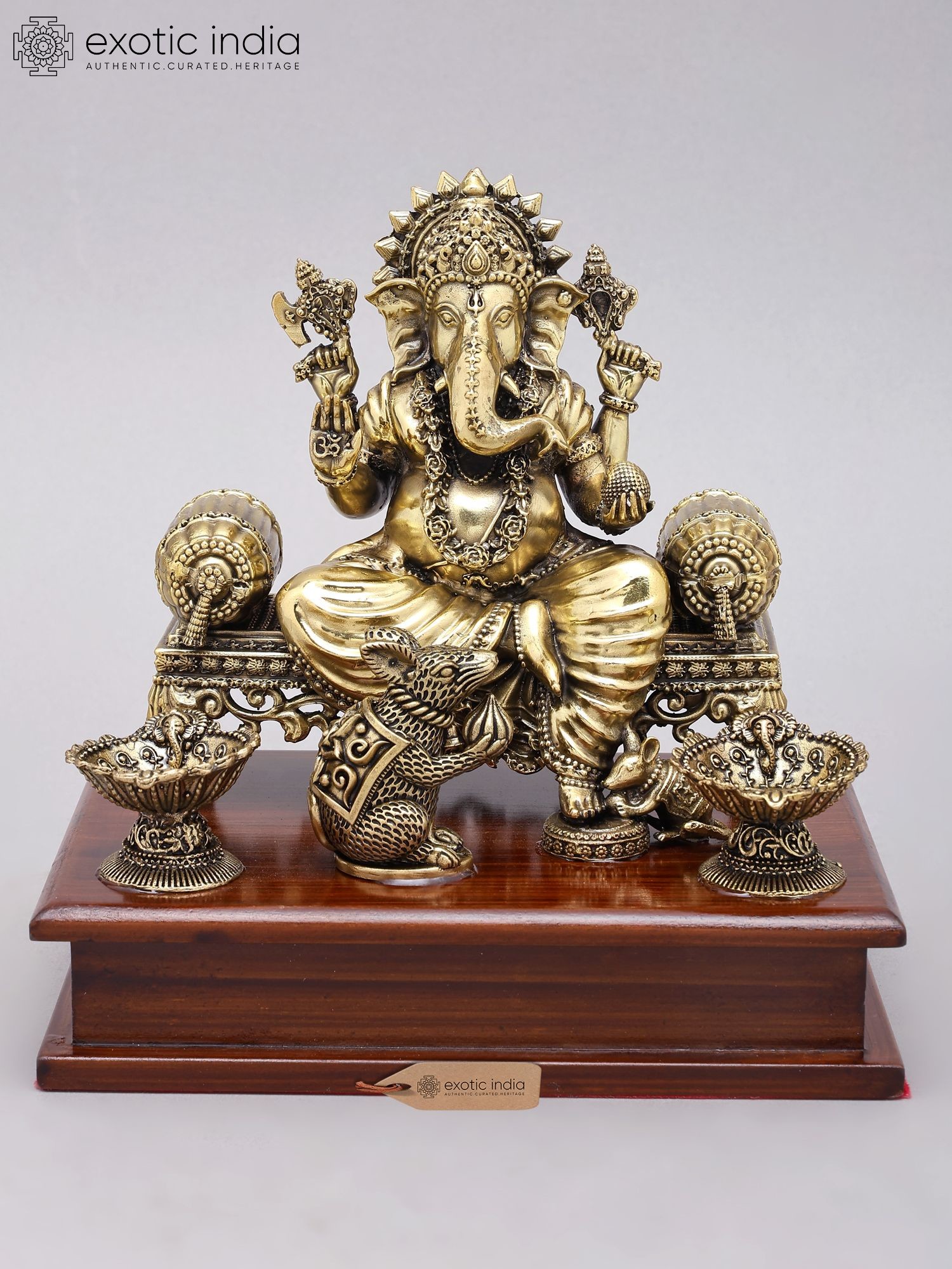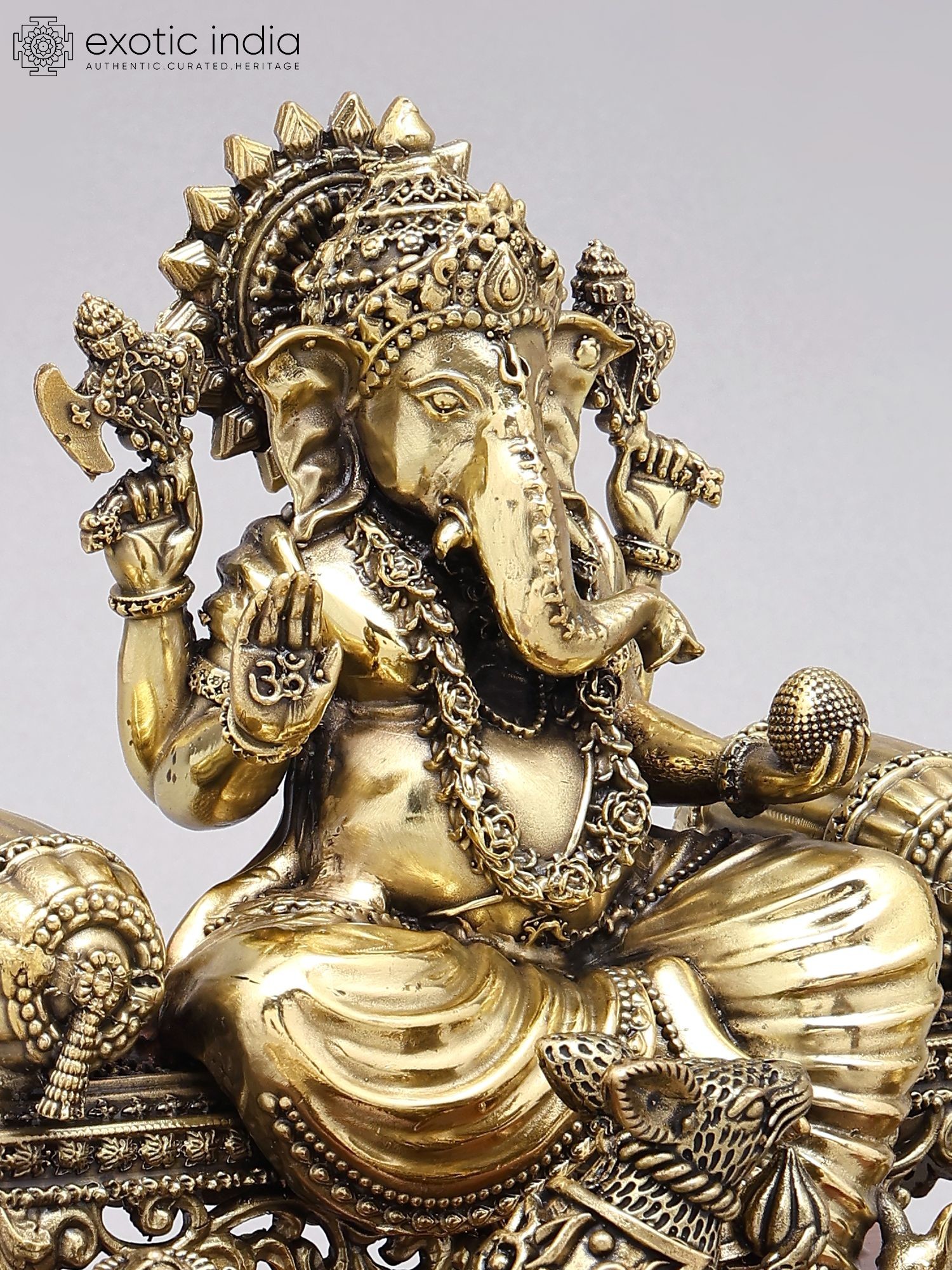 Adorned with traditional iconography, including his vahana (vehicle), the mouse.