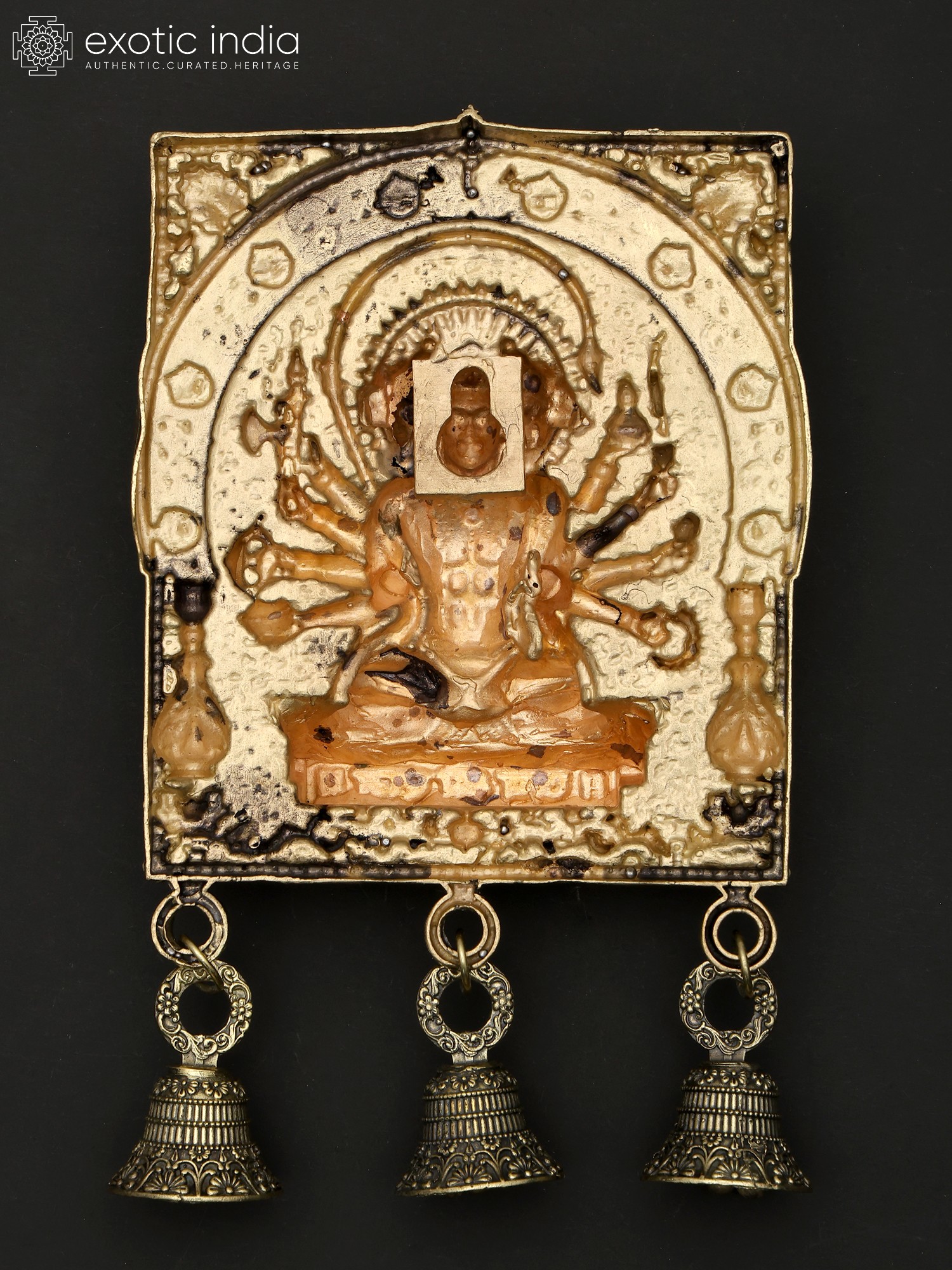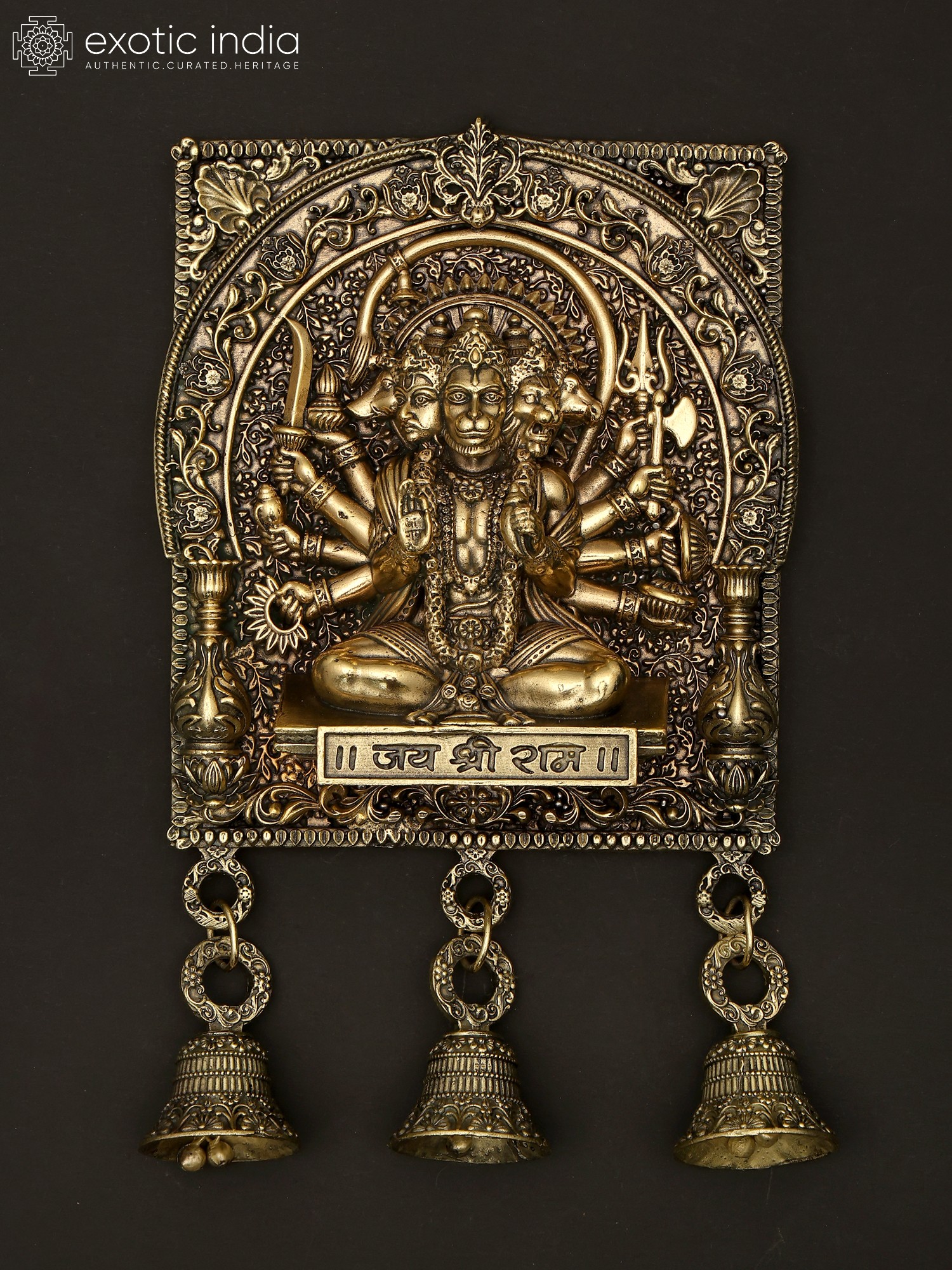 7" Superfine Ten Armed Panchamukhi Hanuman Seated on Wood Base | Brass Sculpture