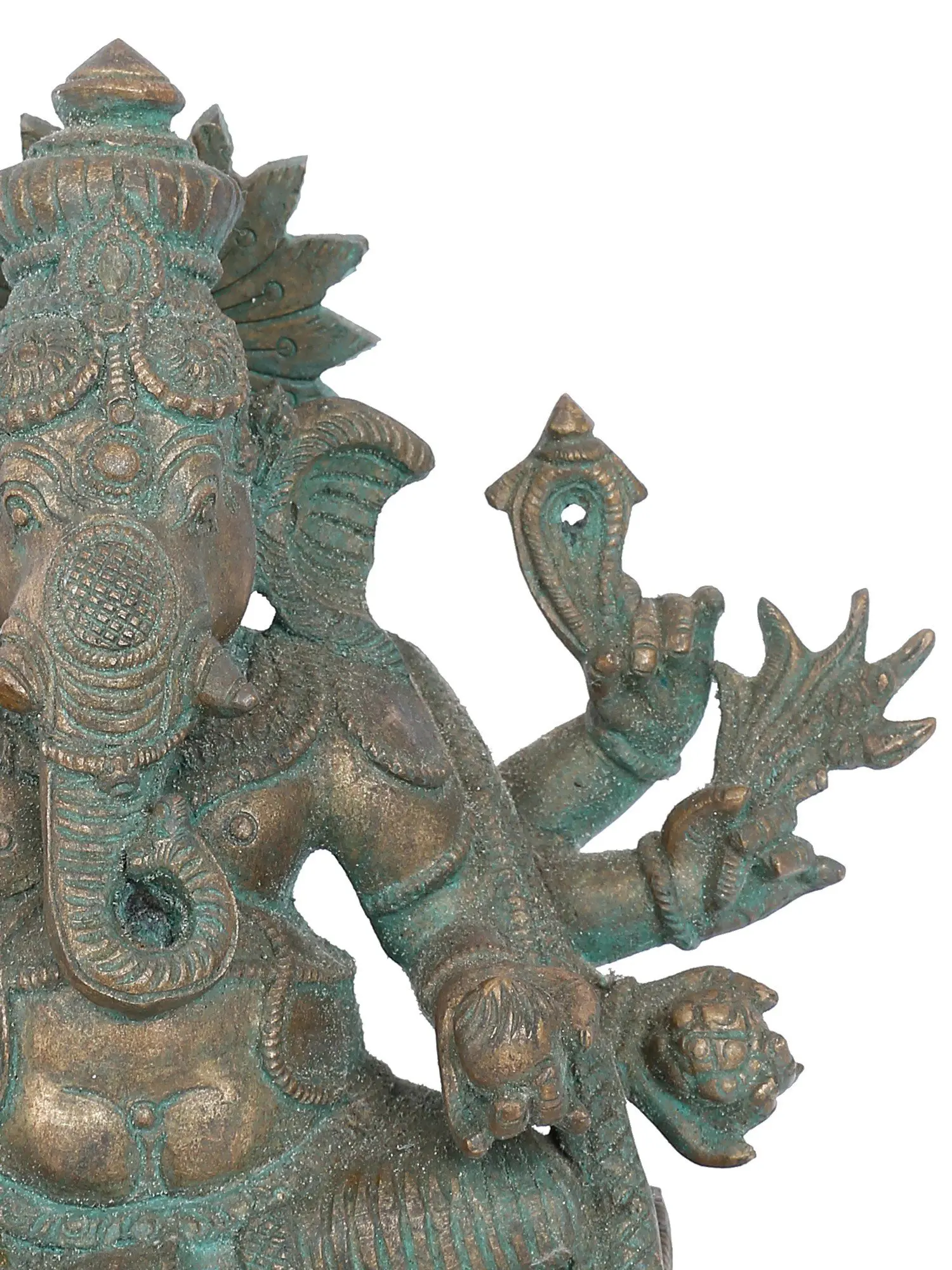 While his right-hand carries a broken tusk, an elephant goad, a sugarcane stalk, and a rose apple fruit, his left hand holds a noose, his favorite Modak (dumpling), a wood apple fruit, and a sprig of paddy. The eight arms symbolize cosmic power, and each gesture carries profound spiritual significance, inviting devotees to connect with the myriad facets of the divine. This sculpture serves as a visual hymn to the infinite capabilities and cosmic energies embodied by Lord Ganesha.