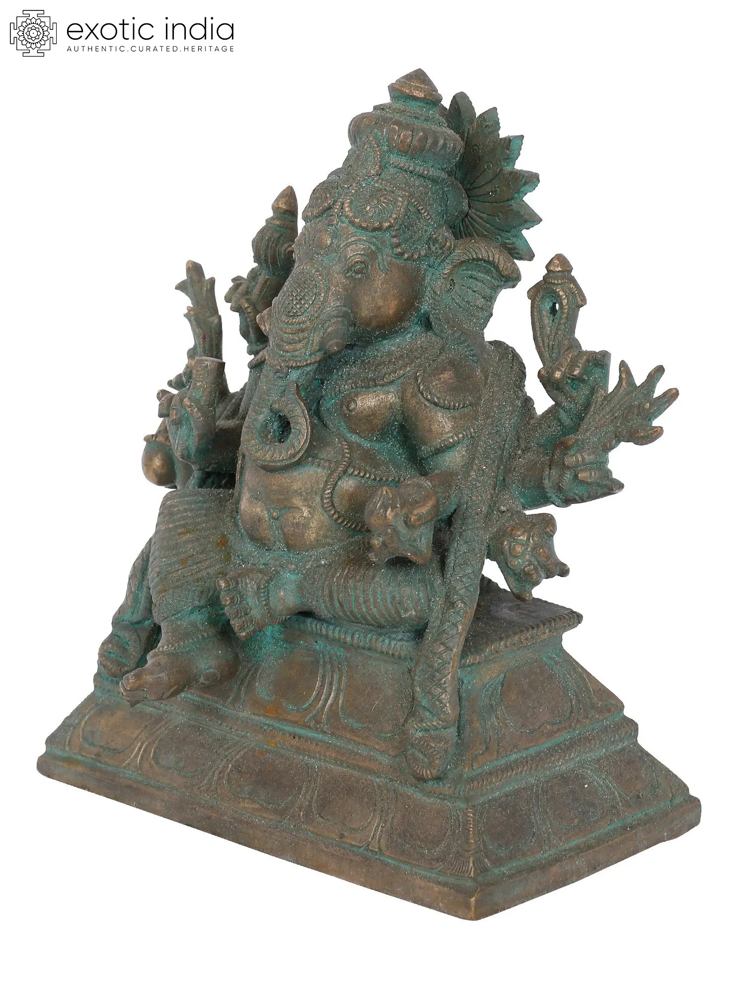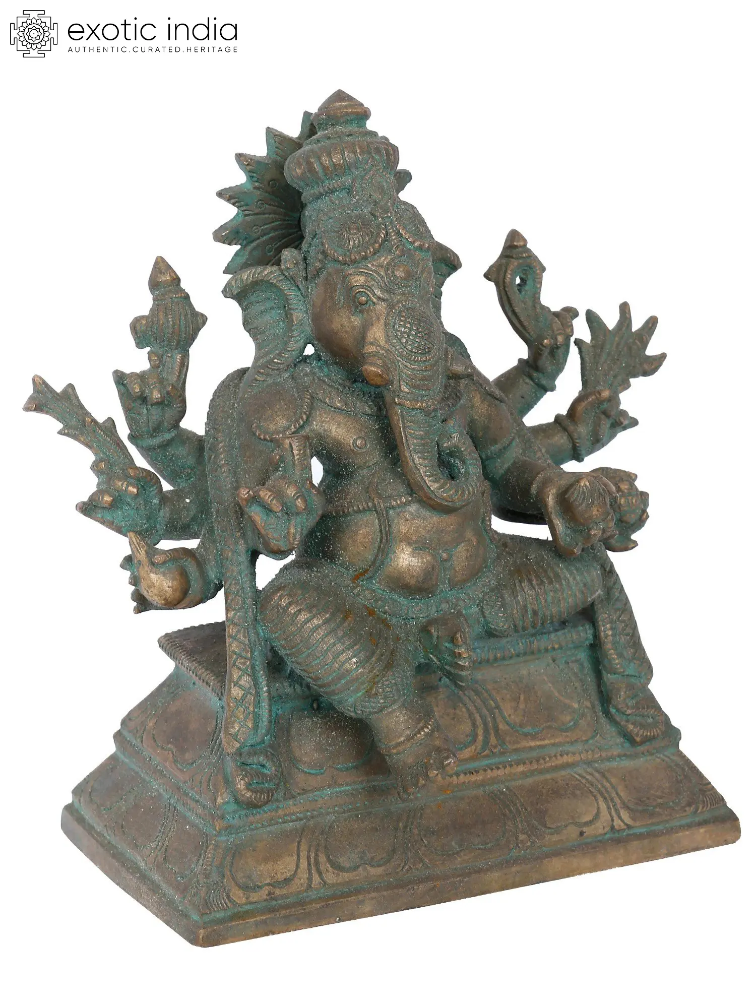 Adorn your sacred space with the divine presence of Ashtabhuja Lord Ganesha, cast through Madhuchista Vidhana on the canvas of Panchaloha Bronze from Swamimalai. This form of Lord Ganesha is referred to as the Taruna Ganapati. Taruna Ganapati is the second of the 32 various types of Ganapati. 'Taruna' denotes a young person. He is generally depicted as having a red complexion, signifying the glory of his youthfulness. He has eight hands and a caring face.