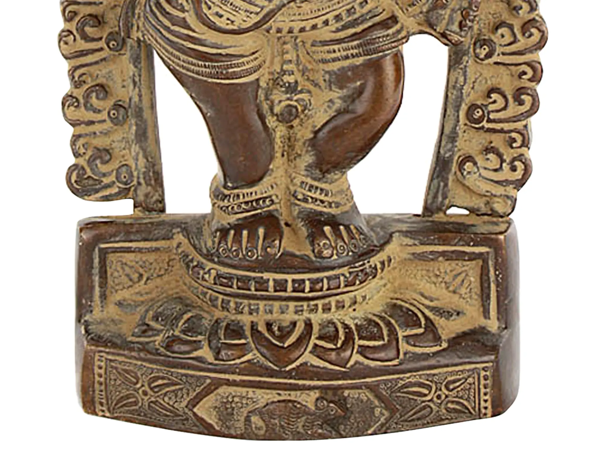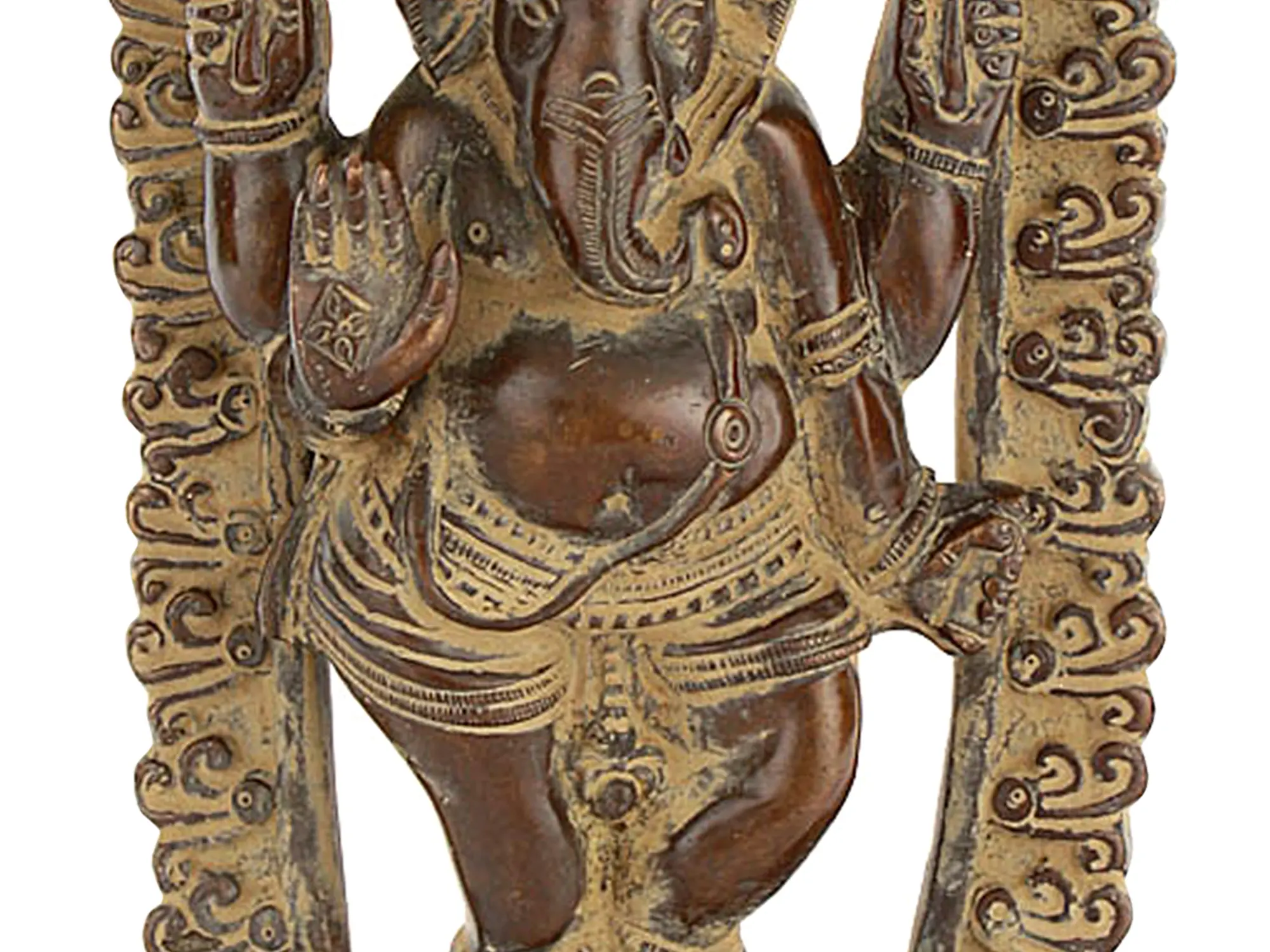 In the enchanting realm of divine artistry, Ganesha, “also known as Vighaneshwara”, stands as a mesmerizing embodiment of grace and power. This brass statue depicts Lord Ganesha in a captivating “Tribhanga posture”, where He elegantly tilts his form within an ornate arch. Adorned in regal attire, Ganesha wears a majestic “Karanda Mukut”, symbolizing his divine sovereignty. In his hands, He holds a noose and a discus, instruments of control and protection. His right hand is poised in the “Abhaya Mudra”, bestowing fearlessness and blessings upon his devotees. The sacred thread “Yajnopavita” adorns his form, signifying his sacred essence. This artwork symbolizes Ganesha ‘s omnipotence and his role as the remover of obstacles, granting us the courage to navigate life’s intricate journey.