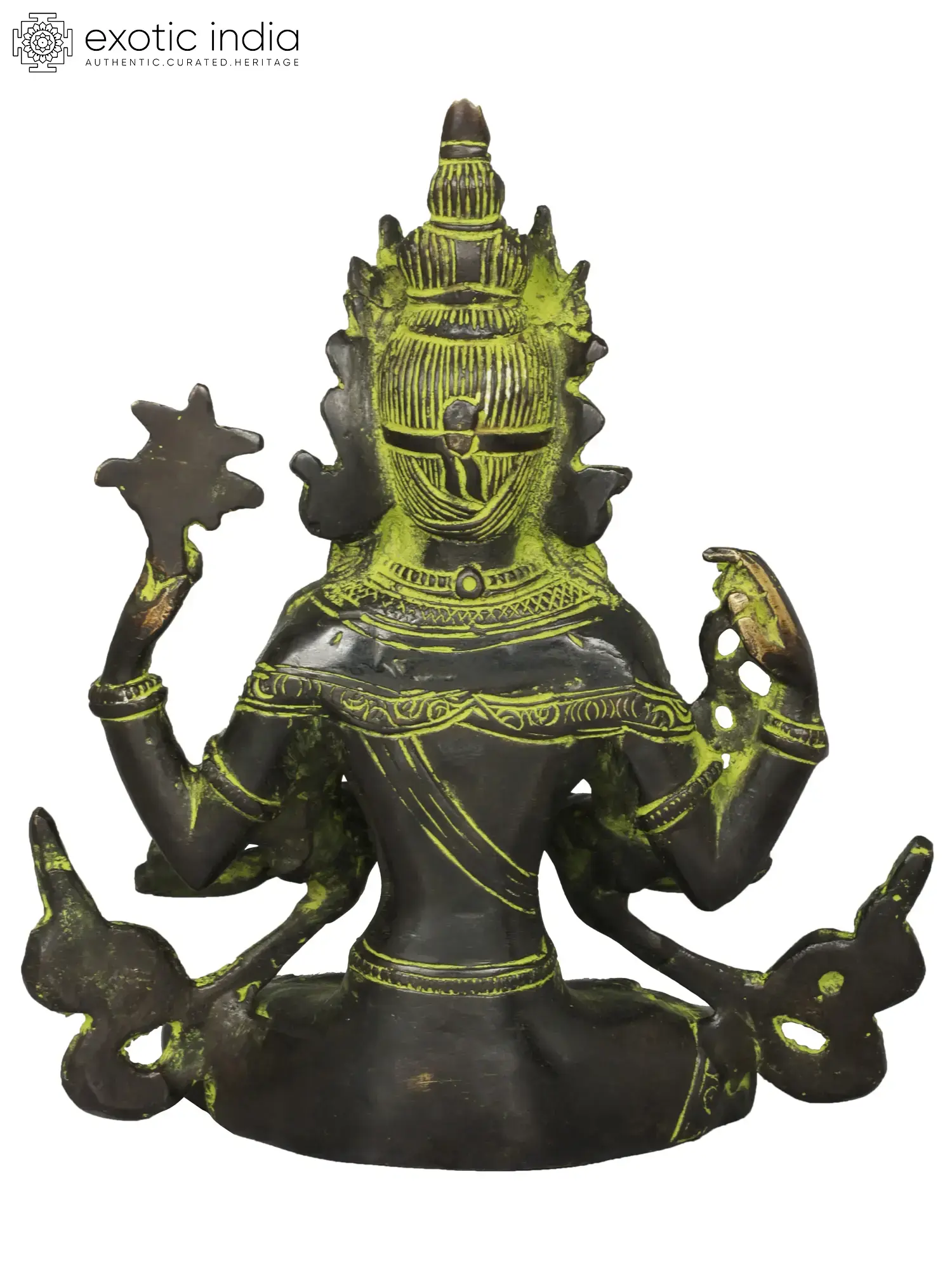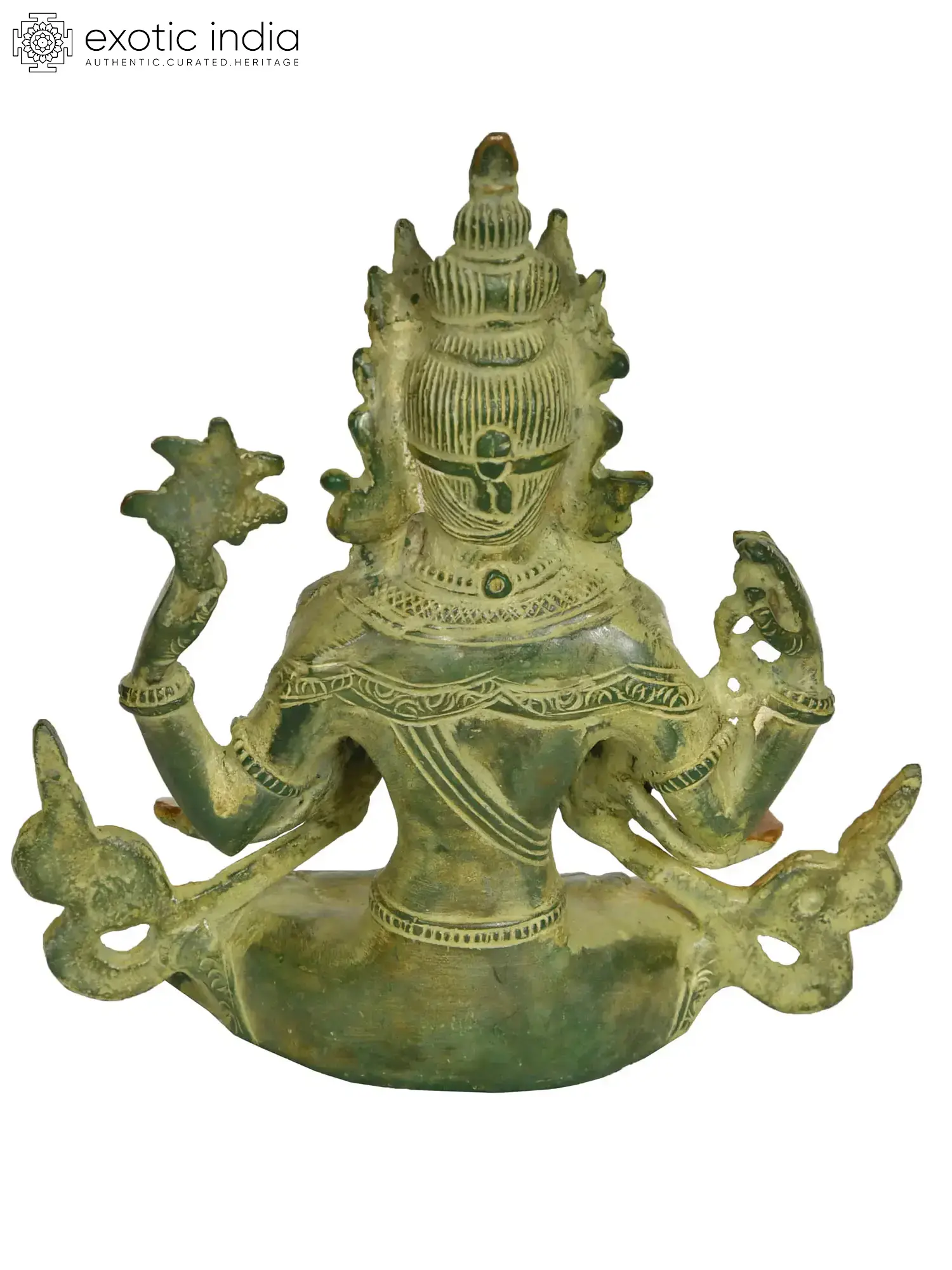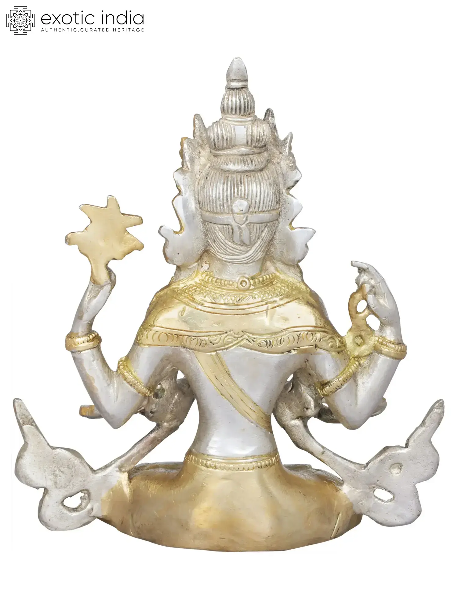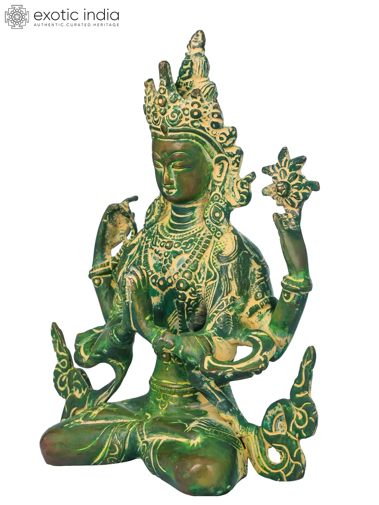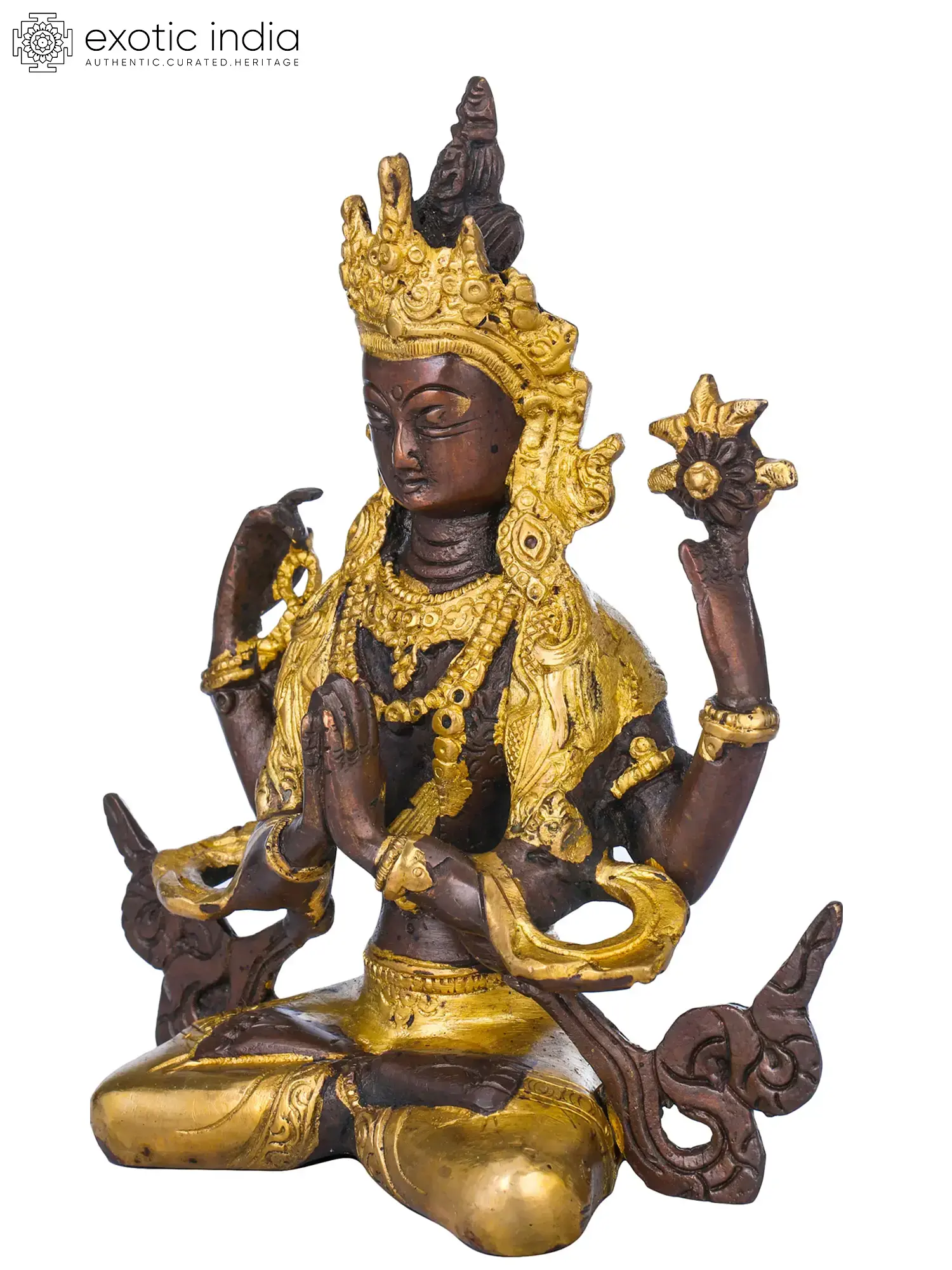 The brass sculpture embodies Chenrezig, the embodiment of compassion. With a thousand arms symbolizing boundless care, his four hands hold a rosary, lotus, crystal mala, and wish-fulfilling jewel, signifying devotion, purity, and granting of wishes. His eyes, gazing in all directions, mirror his awareness of beings' suffering. Chenrezig's compassion extends to all, offering a refuge for those lost in the samsaric sea. This artwork captures the divine empathy that guides beings towards enlightenment and liberation.