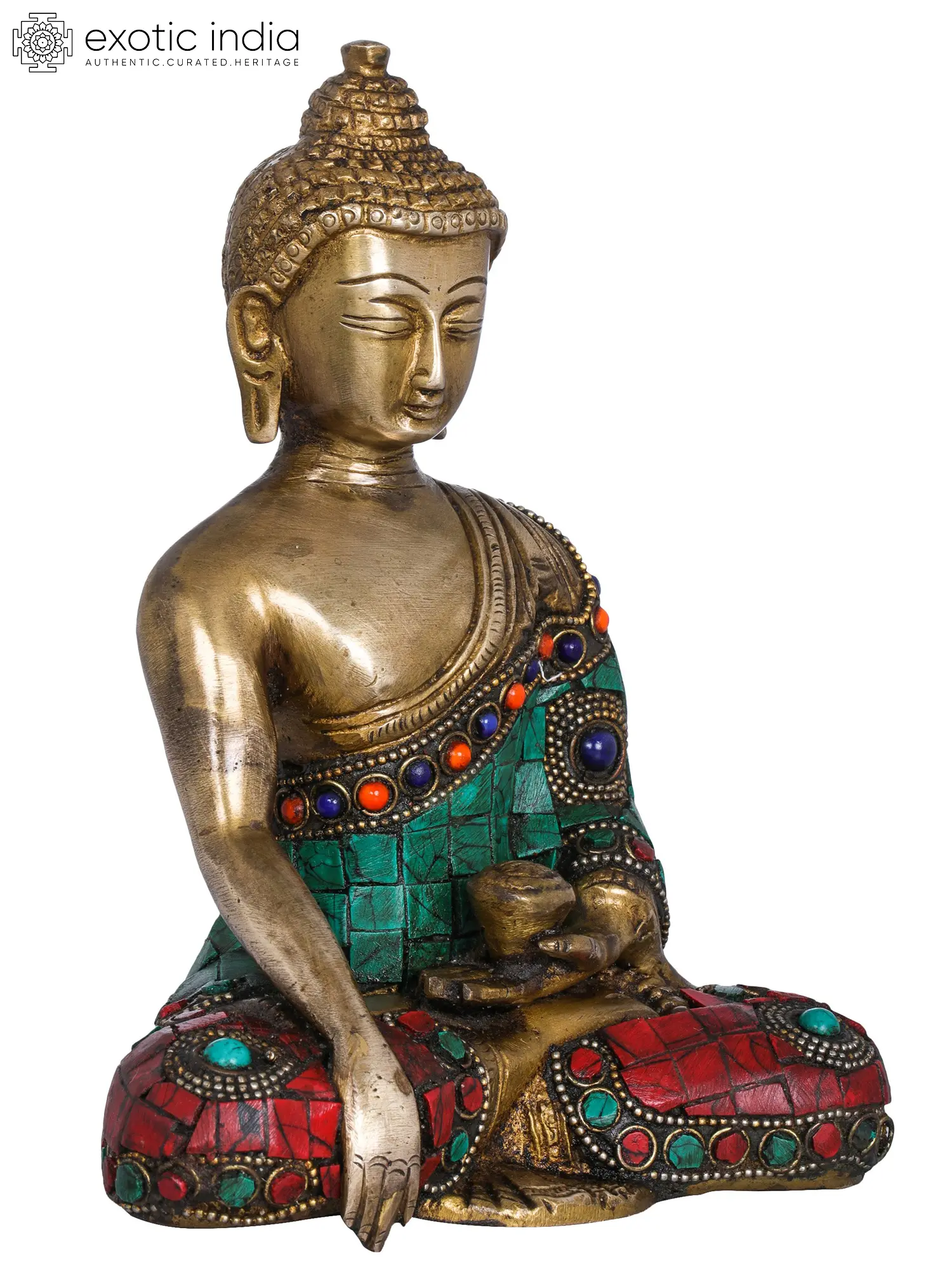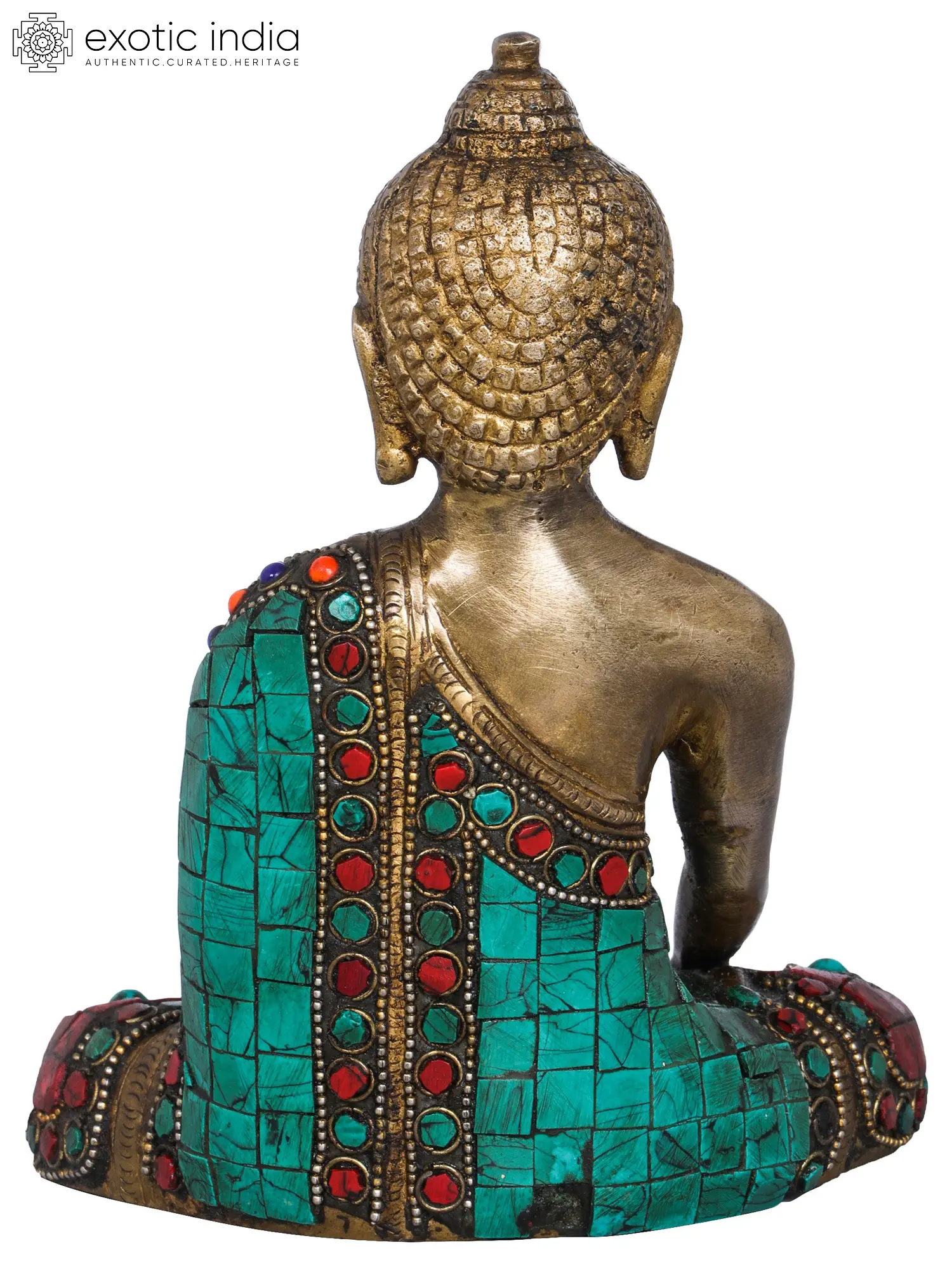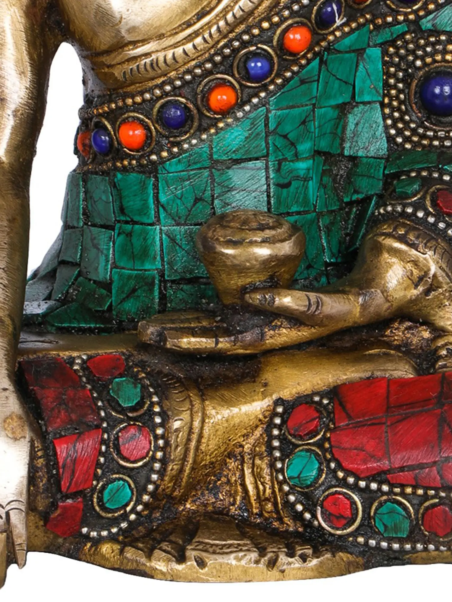 Crafted with meticulous detail by skilled artisans in India, this statue is a testament to traditional craftsmanship. The inherent warmth and malleability of brass allow for the nuanced rendering of Buddha's serene expression, the gentle folds of his robes, and the tranquil posture. The statue is further enhanced by a stunning inlay of vibrant colored stones. Emerald-like green hues adorn his monastic robe, interspersed with striking coral red and deep sapphire blue stones. The base on which he sits is similarly embellished, creating a rich tapestry of color and texture that draws the eye and elevates the devotional significance of the piece. Each stone is carefully placed, showcasing the dedication and artistic vision involved in its creation.