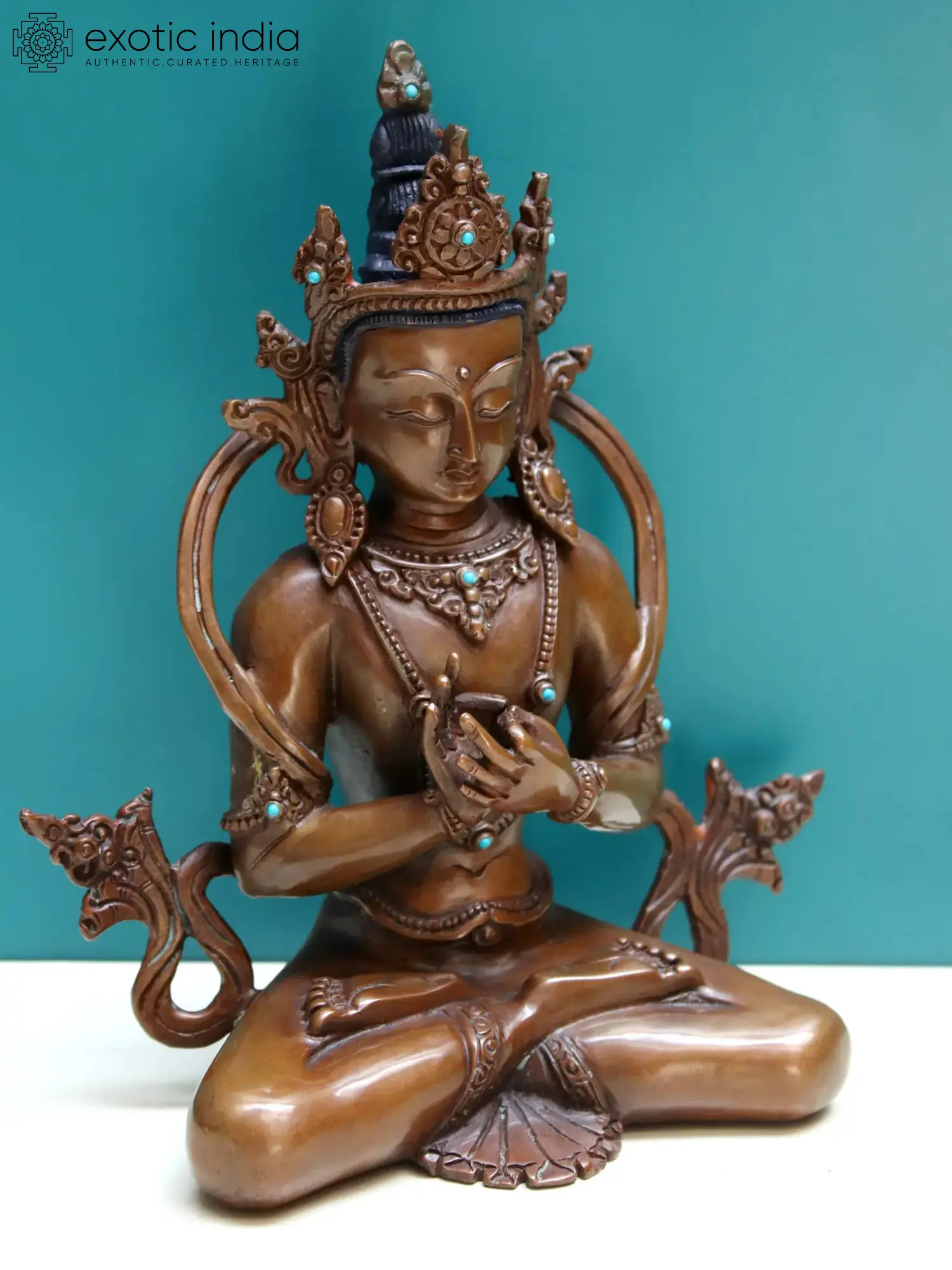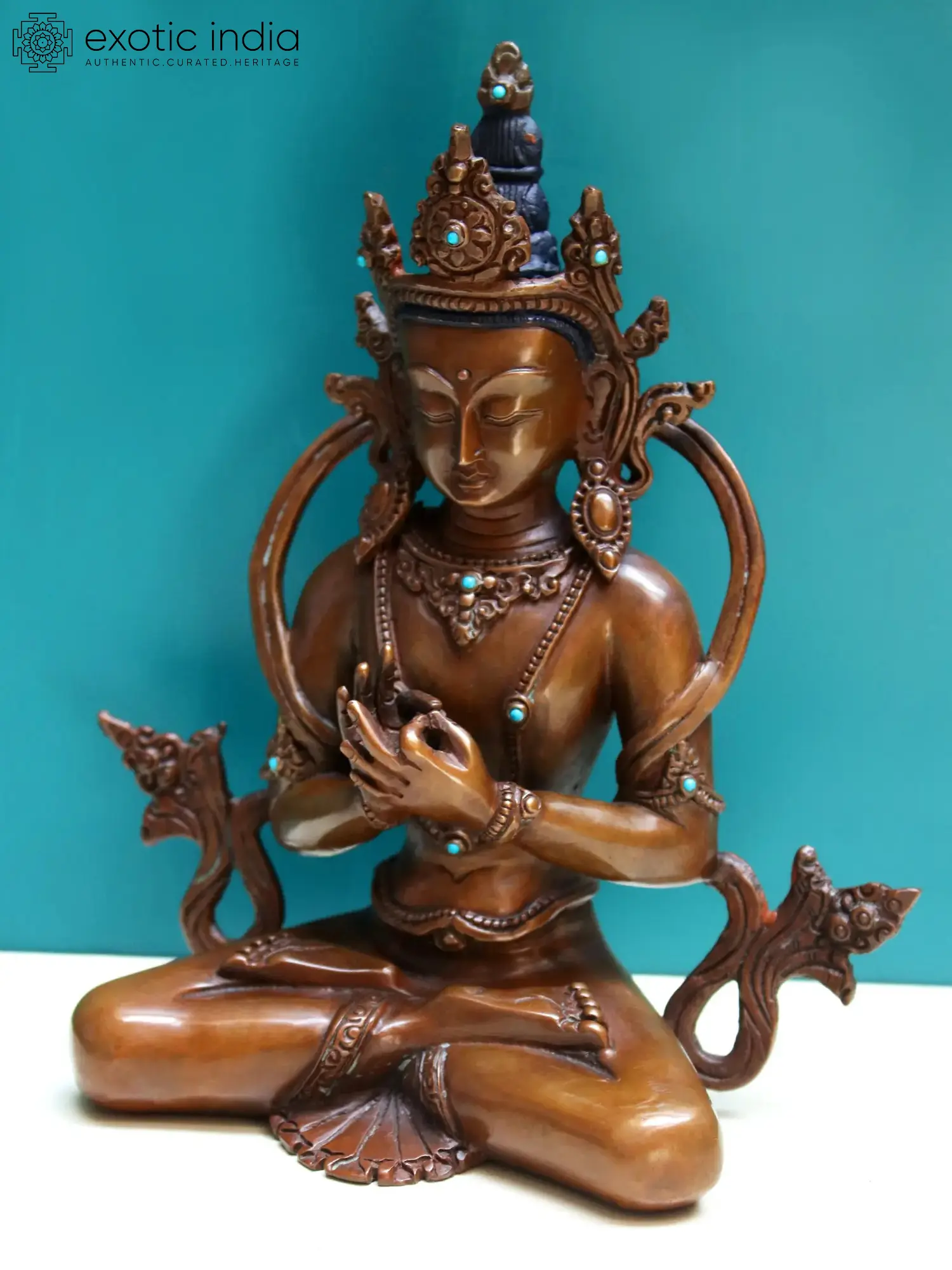 Vairochana- one of the Five Dhyani Buddhas in Vajrayana Buddhism is revered as “he who has a divine brilliance”. He is often presented as an aspect of the historical Shakyamuni Buddha and a representation of the philosophy of Shunyata or nothingness. Wrapped in an air of spiritual wisdom and symbolism, Vairochana is a celestial presence in Buddhism, depicted in this beautiful copper statue from Nepal in regal iconography.