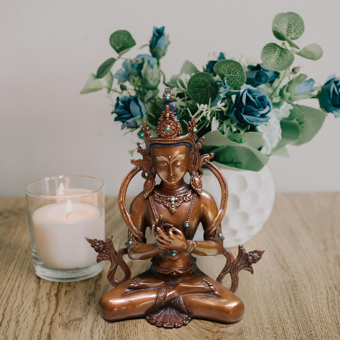 Sitting in Padmasana or lotus pose, Vairochana has his hair in a traditional updo, adorned by a stunning Nepalese crown, brocaded scarf, and dhoti, along with necklaces studded with lovely gemstones. A pristine polish on the icon accompanied by the stylized flow of the scarf forming an aureole around the icon adds an aesthetic richness to the statue.