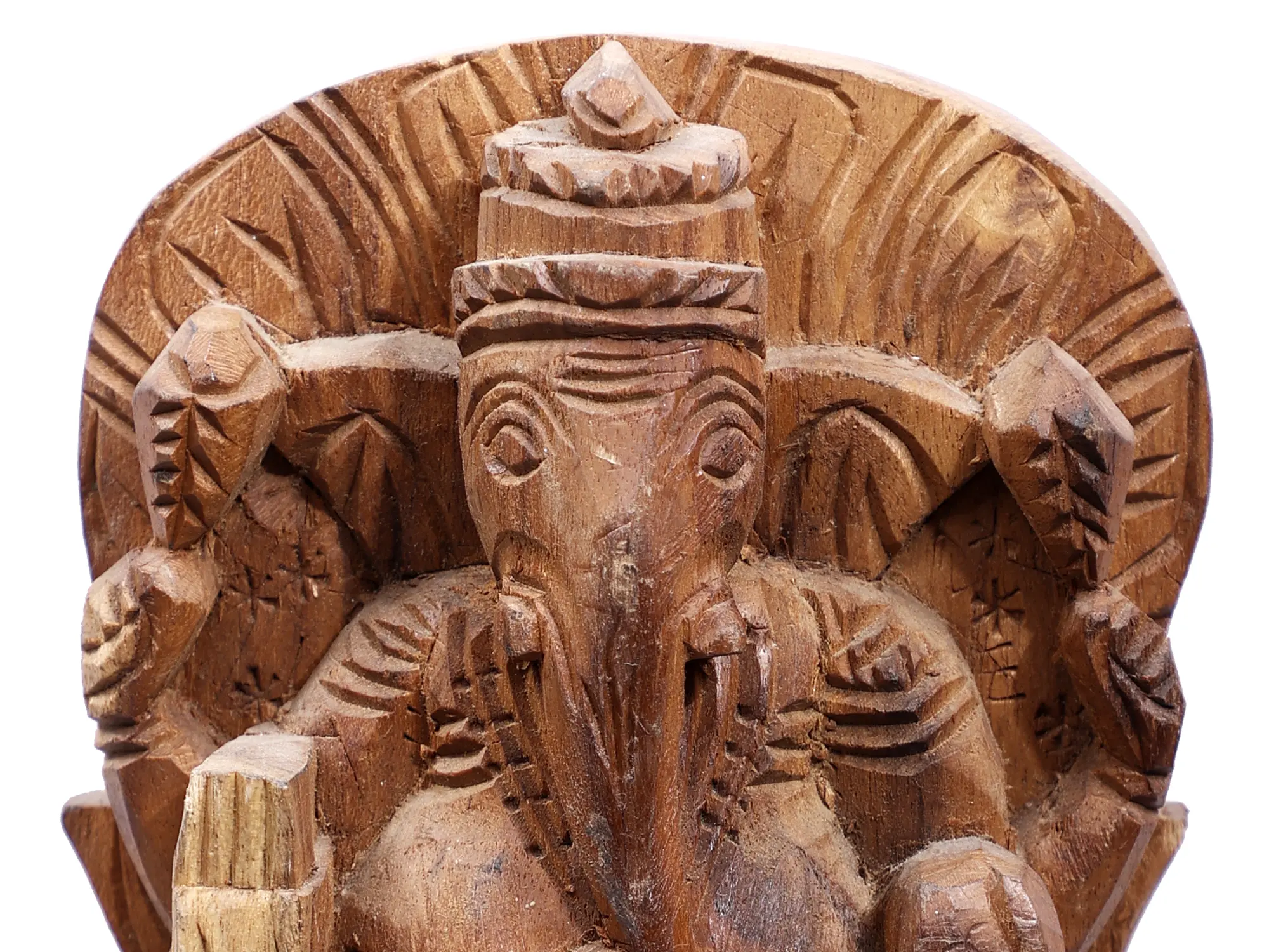 Lord Ganesha, the beloved elephant-headed god, is revered as the Vighnaharta, the remover of obstacles, and the patron of arts and sciences. His worship is considered auspicious before embarking on any new venture, be it a journey, a project, or a life transition. Tales abound of his intelligence and wit, most famously his victory in a race around the world, circling his parents Shiva and Parvati, demonstrating that true wisdom lies not in speed, but in understanding and devotion. This wooden depiction captures his serene yet powerful presence, embodying his role as the ultimate guide and protector.