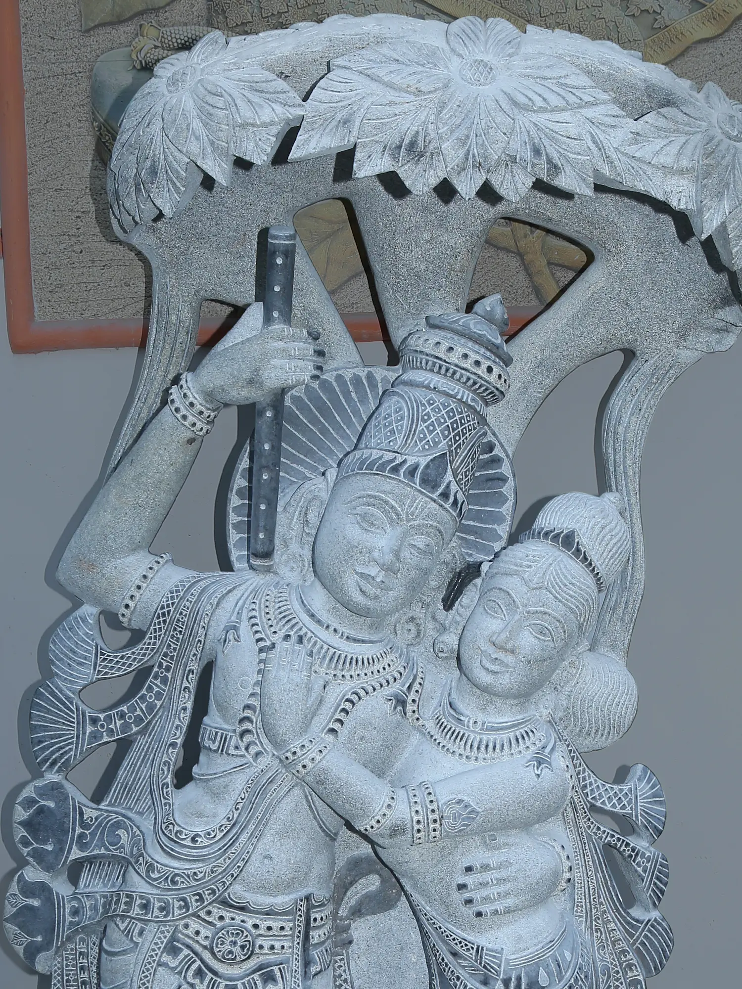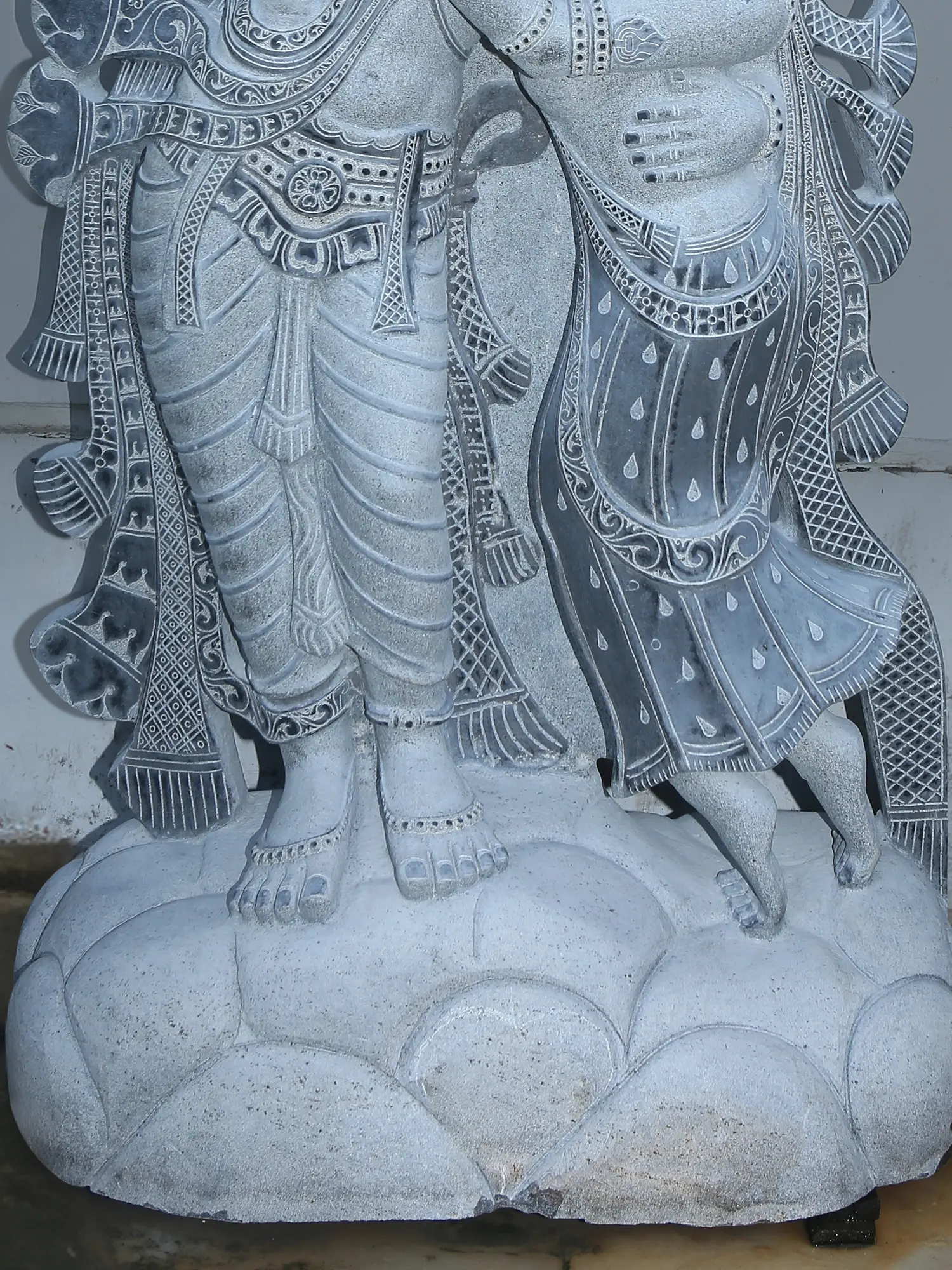 In this sculpture, Krishna is depicted standing elegantly, with a flute in hand, embodying his role as the divine musician whose melodies enchant the hearts of all beings.