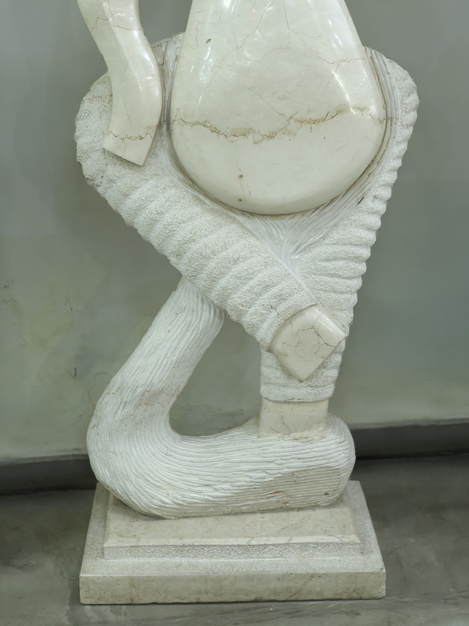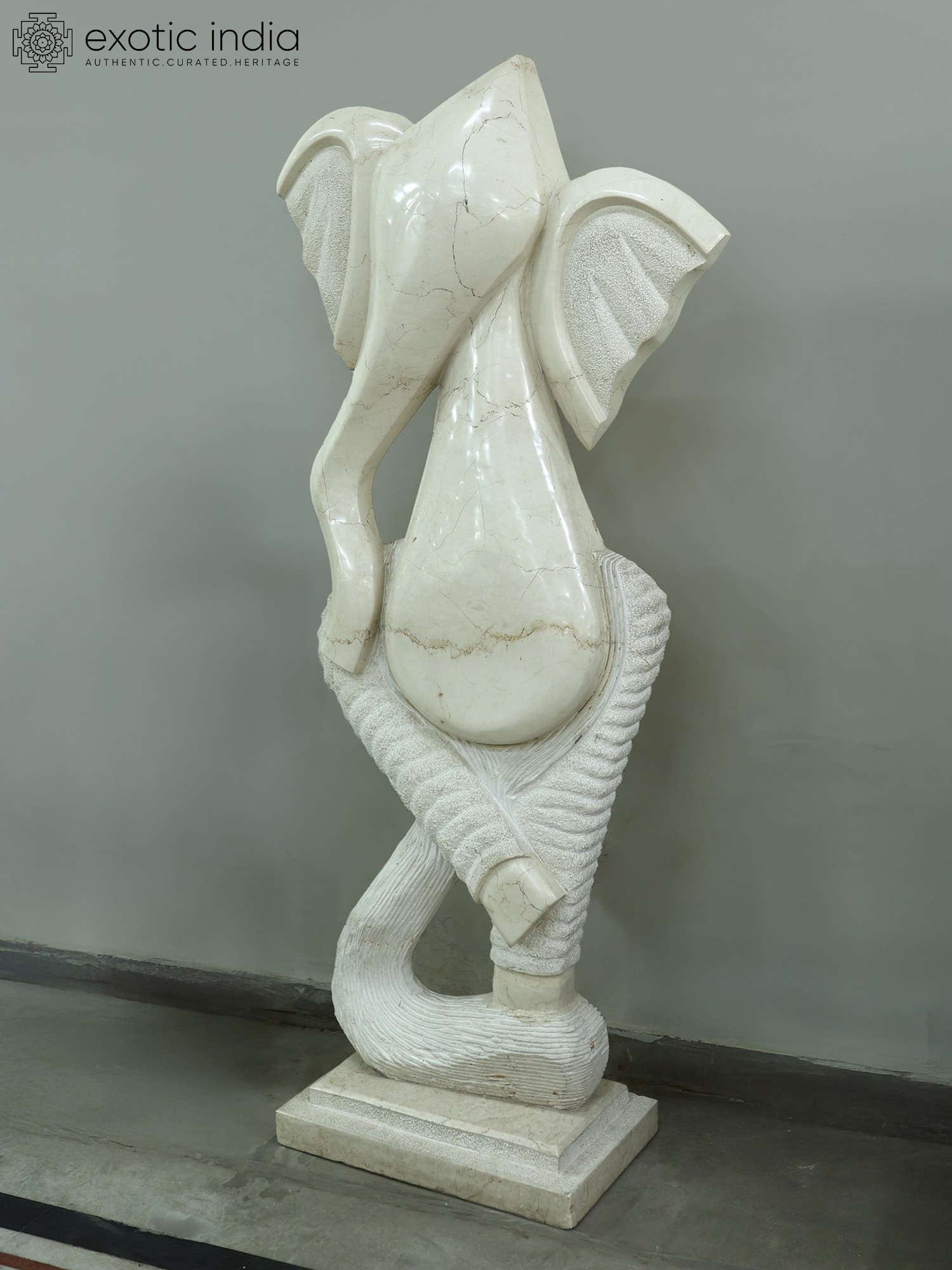 This magnificent sculpture presents Lord Ganesha, the beloved elephant-headed deity, through a distinctly modern artistic lens. Crafted from exquisite natural marble, its imposing seventy-inch height commands attention, making it a striking centerpiece for any discerning collector or spiritual seeker. The artist has masterfully interpreted the divine form, transcending traditional iconography to create a piece that speaks to contemporary aesthetics while retaining the profound essence of Ganesha's divinity. The purity of the white marble, with its subtle veining, lends an aura of ethereal grace, enhancing the sculpture's spiritual resonance.