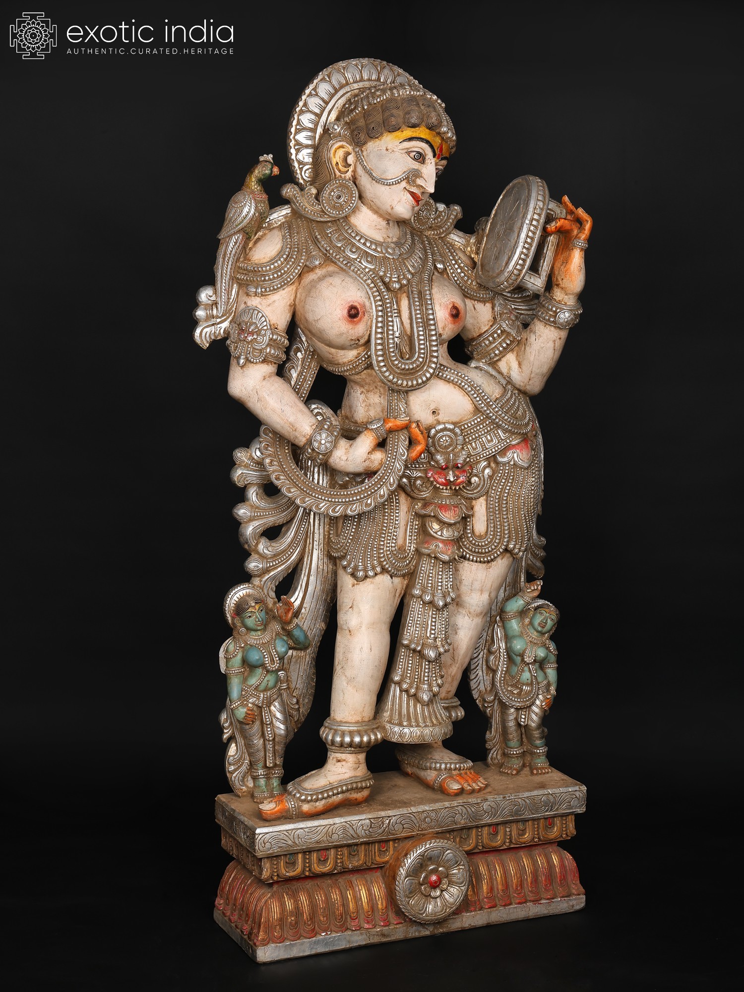 Standing at an impressive seven feet tall, this Apsara commands attention with her statuesque form. The carving masterfully renders flowing silks, intricate jewelry, and a regal headdress that signifies her celestial status. The inclusion of attendant figures and a delicate bird perched on her shoulder adds layers of narrative and visual interest. You'll appreciate the dynamic pose, suggesting movement and grace, a hallmark of classical South Asian sculpture.