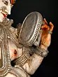 Apsaras are depicted in Hindu and Buddhist mythology as divine nymphs, celestial dancers, and singers who entertain the gods and inhabit the heavens. They are often associated with beauty, fertility, and the arts, embodying the divine feminine. This particular rendition may draw inspiration from classical sculptural traditions, reflecting a deep understanding of aesthetic principles and spiritual symbolism. The figure holds a circular object, perhaps a mirror or a musical instrument, further enriching her divine persona.