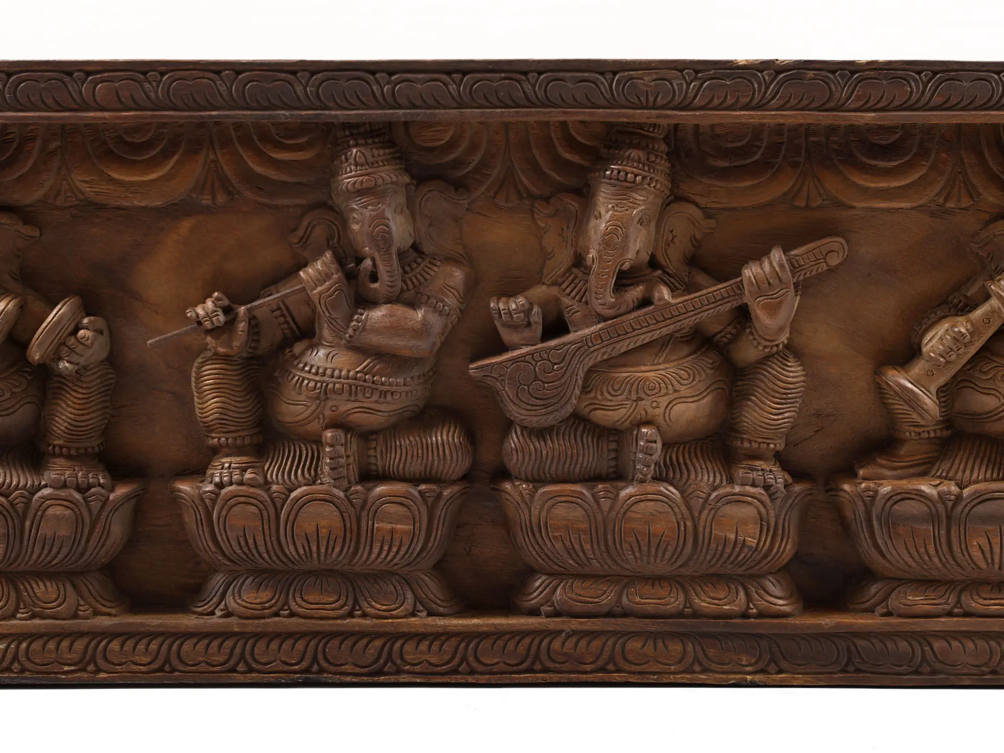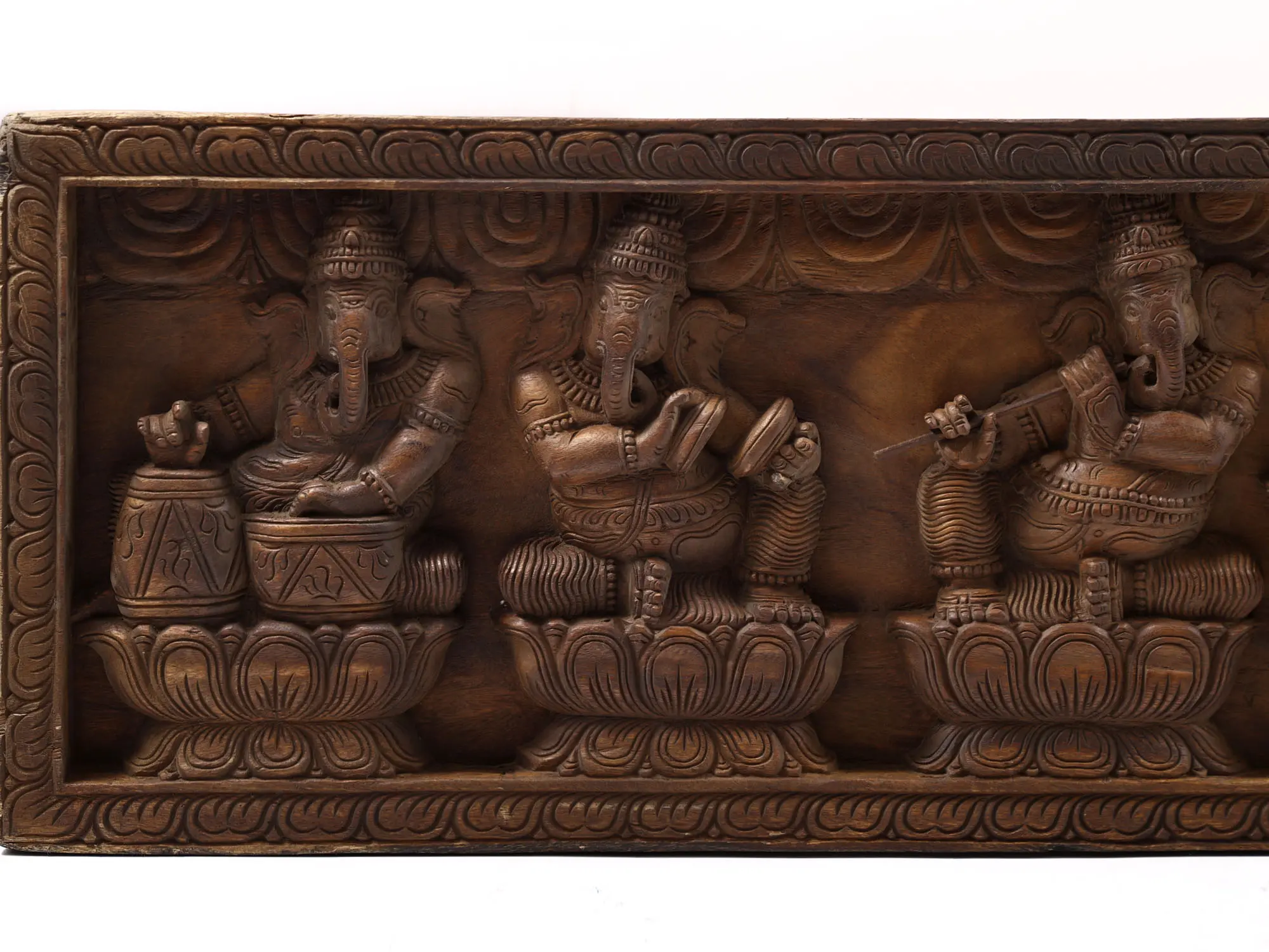 The forms of Lord Ganesha are seen playing musical instruments like the Tabla, Flute, Manjira, Sarangi, Veena, Shenai, and Dhol. This unique fusion of visual and auditory beauty not only serves as a stunning decorative piece but also invokes a sense of divine tranquility. The panel stands as a testament to the craftsmanship and creativity, offering a harmonious celebration of art and spirituality.