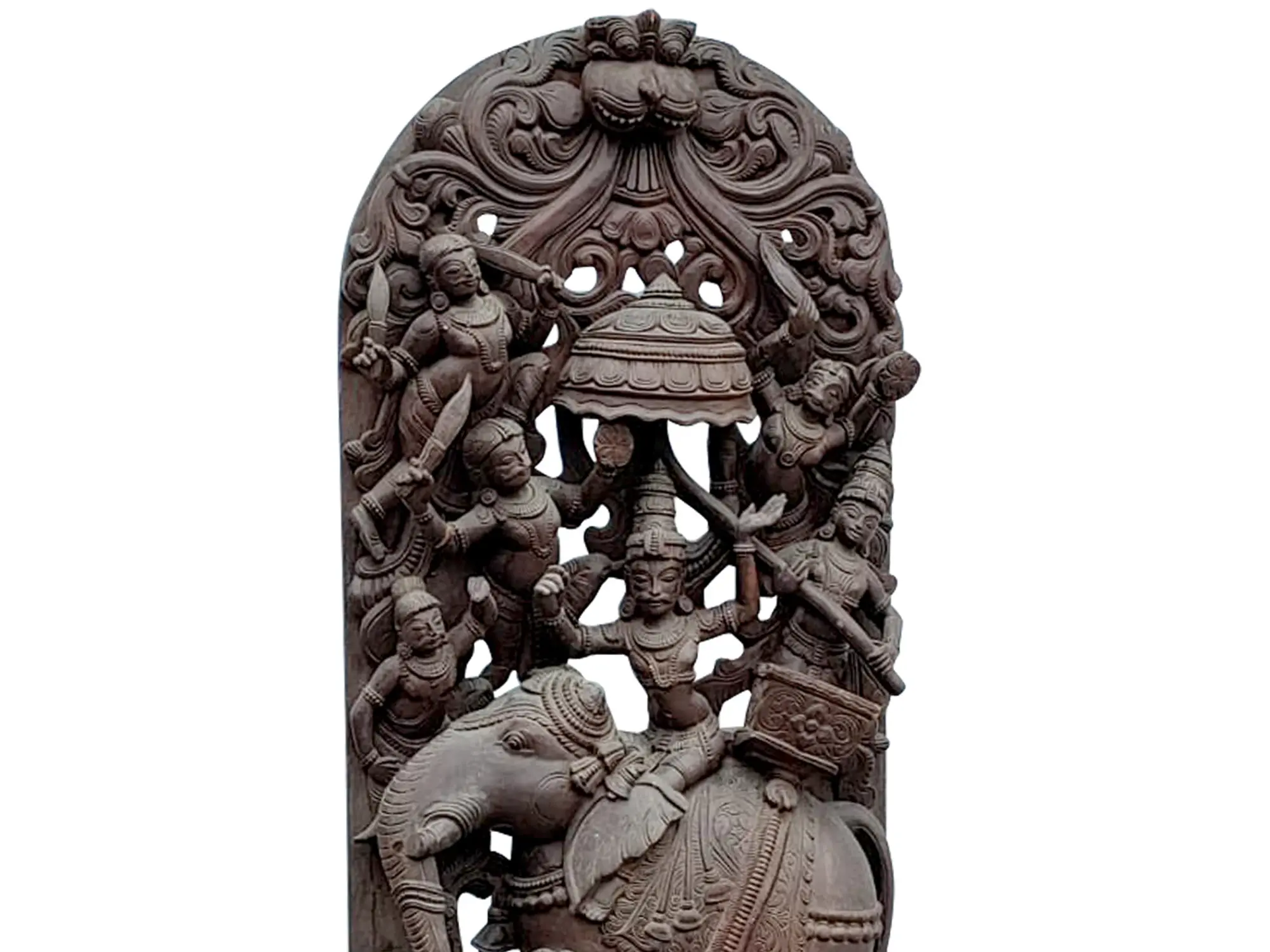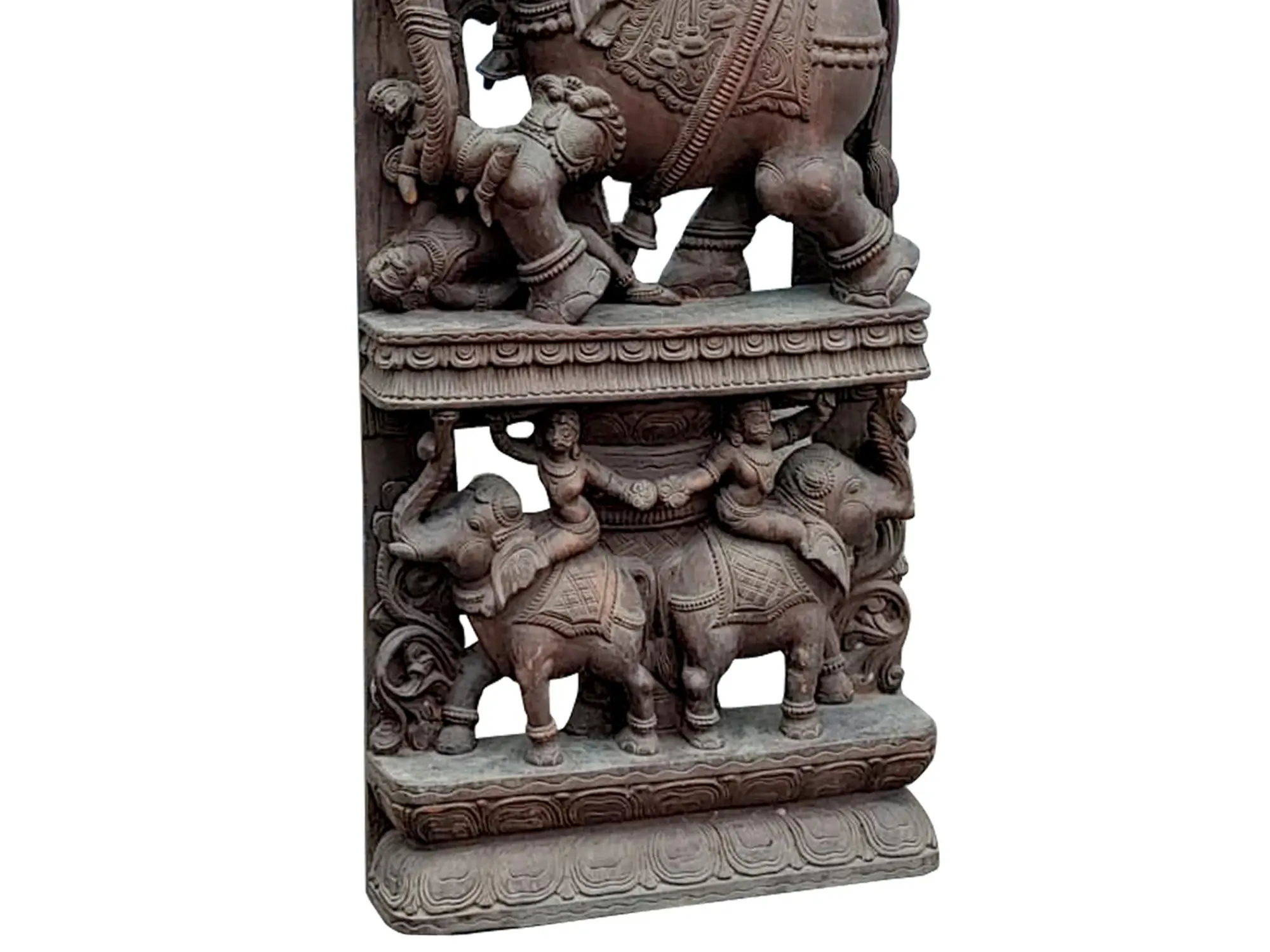 The wooden artwork depicts a dynamic war scene, brimming with the vigor of the battlefield. Surrounded by Yakshas and Rakshasa who hover above the central image, Indrajit rides the Airvata, after having plucked its tusk. A soldier on the ground, wrapped in the trunk of Airavata, and Kirtimukha aureole (a symbol of royalty and sovereignty) become the symbols of Indrajit's supreme prowess. The act of taking a rival's mount or vaahana in ancient Indian traditions is seen as a universal declaration of victory over them, and following this ritual of war, this antique woodwork brings to life, one of the most powerful, but forgotten warriors of Valmiki's Ramayana.
