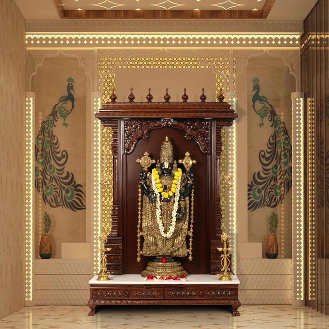 The platform is substantially comprehensive for you to set different items of pooja as well as other deities as per your ritual and spiritual requirements. Sturdy pillars with traditional patterns stand on each side of this brass Tirupati Balaji statue, attached to the arch of the teakwood frame which is beautified with lotus petal-shaped schemes. Seven pot-like elements are placed in a straight line on the wooden roof of the shrine symbolizing virtues such as fecundity, auspiciousness, and the goddess Lakshmi.