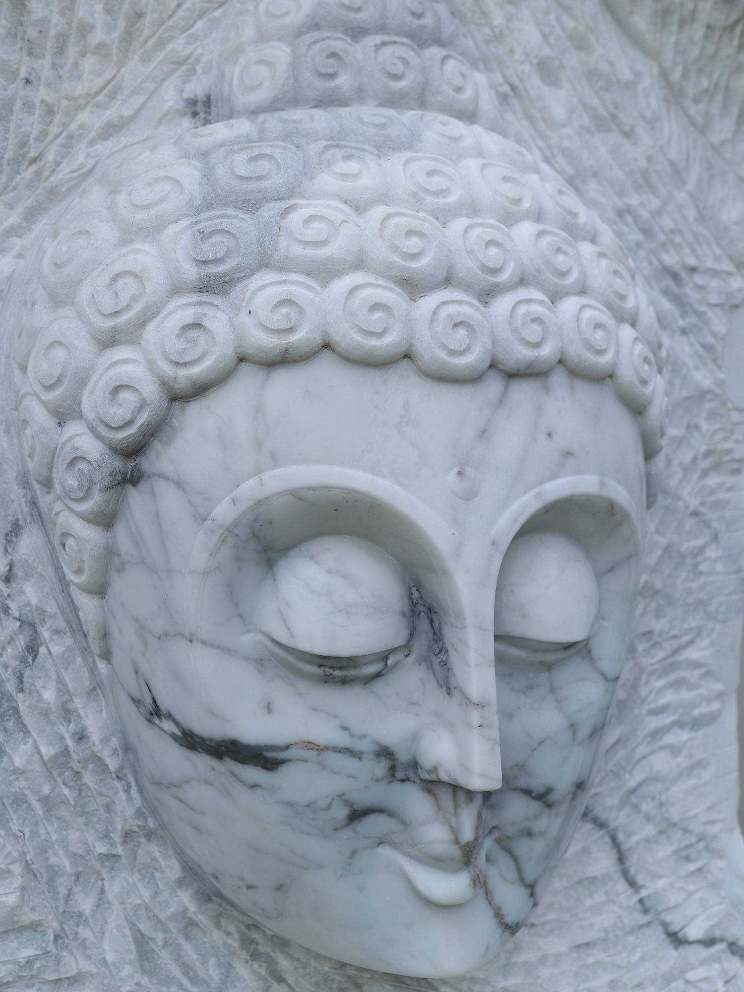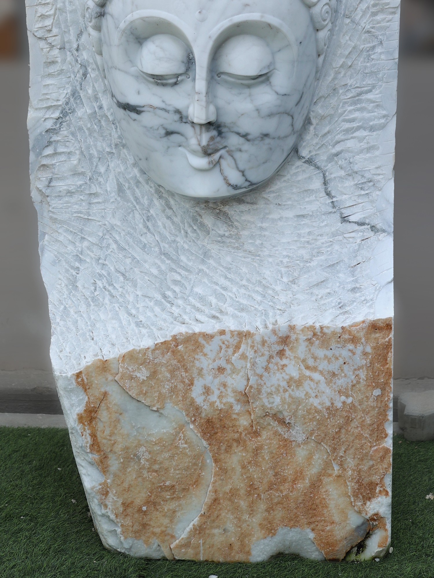 This magnificent sculpture captures the profound serenity and inner peace that Siddhartha Gautama, the Buddha, embodied. Carved from a single piece of natural white marble, its monumental scale and raw, unrefined edges contrast beautifully with the finely sculpted face of the enlightened one. The artist has masterfully conveyed the calm, compassionate gaze, the gentle curve of the lips hinting at a benevolent smile, and the characteristic curly hair, each detail rendered with exquisite precision. This artwork transcends mere decoration; it is a portal to contemplation, a reminder of the path to mindfulness and tranquility. ––––––––––