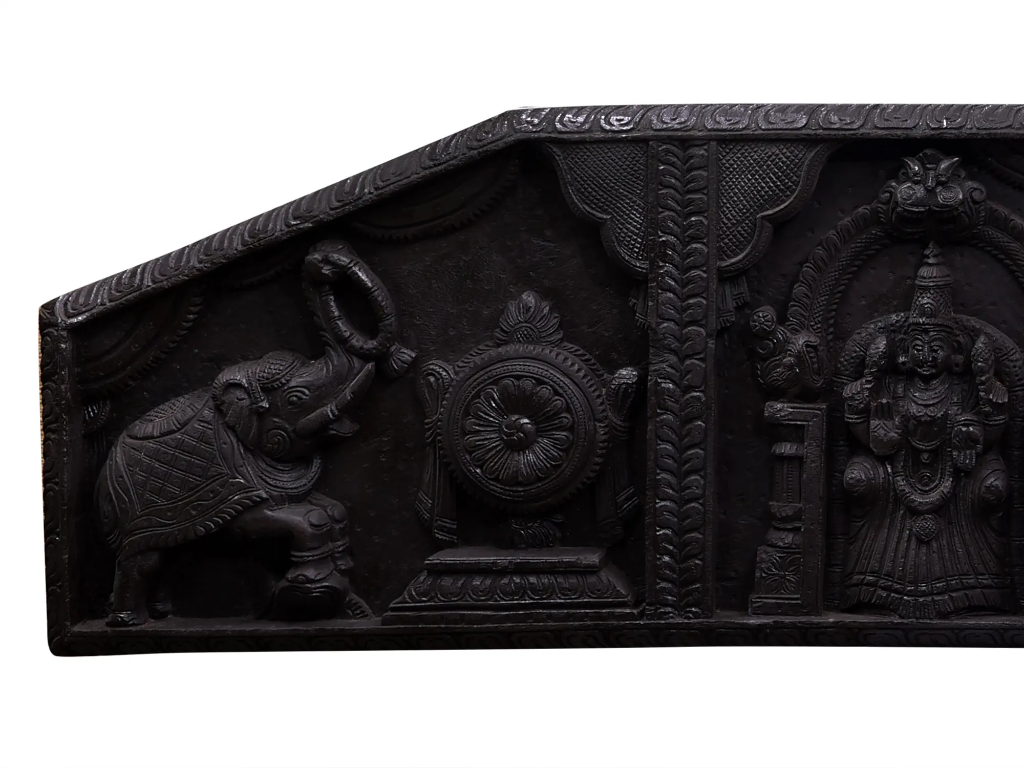 The sanctum sanctorum of Tirupati Balaji, Sridevi, and Bhudevi is recreated in the masterful iconography of this six-foot-long woodwork, a testament to the devotion and dexterity of Indian artists. With intricate details, the elements of grand temple architecture such as arches, pillars, and Kirtimukha aureole have been represented in the wall panel, making three separate shrines for the central deity- Balaji and his wives.