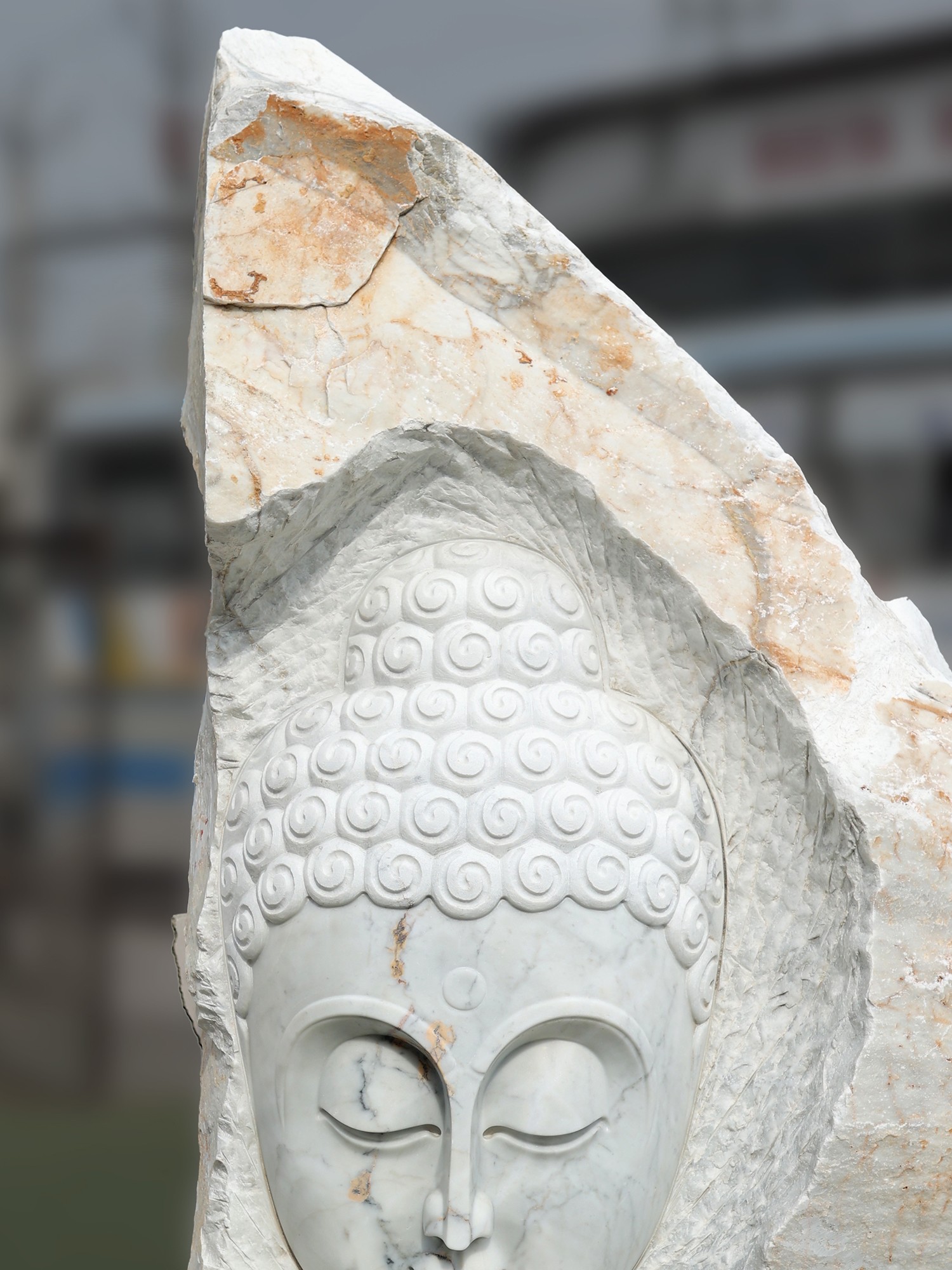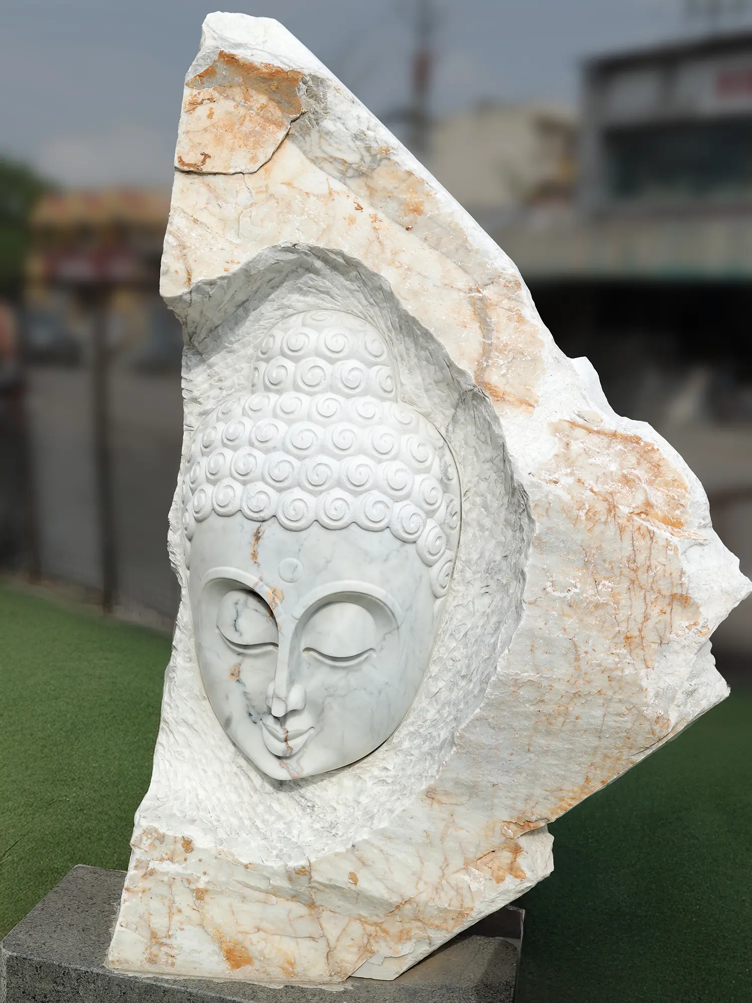 Whether placed in a tranquil garden setting, a meditation space, or as a striking addition to a contemporary living area, this Lord Buddha face sculpture will undoubtedly command attention and inspire contemplation. Its monumental presence and artistic integrity make it a significant statement piece, reflecting a deep appreciation for both art and spirituality. The craftsmanship is evident in every detail, from the smooth, polished planes of the face to the rough, organic texture of the stone, creating a piece that is both visually captivating and spiritually resonant. This is an artwork designed to endure, to inspire, and to bring a touch of the divine into the everyday.