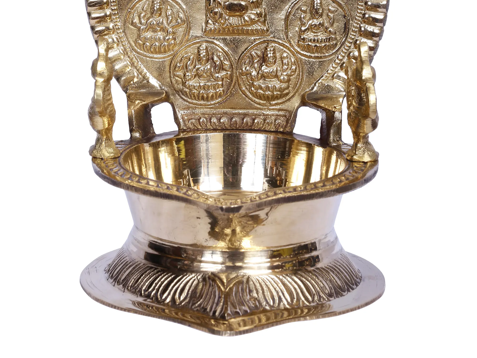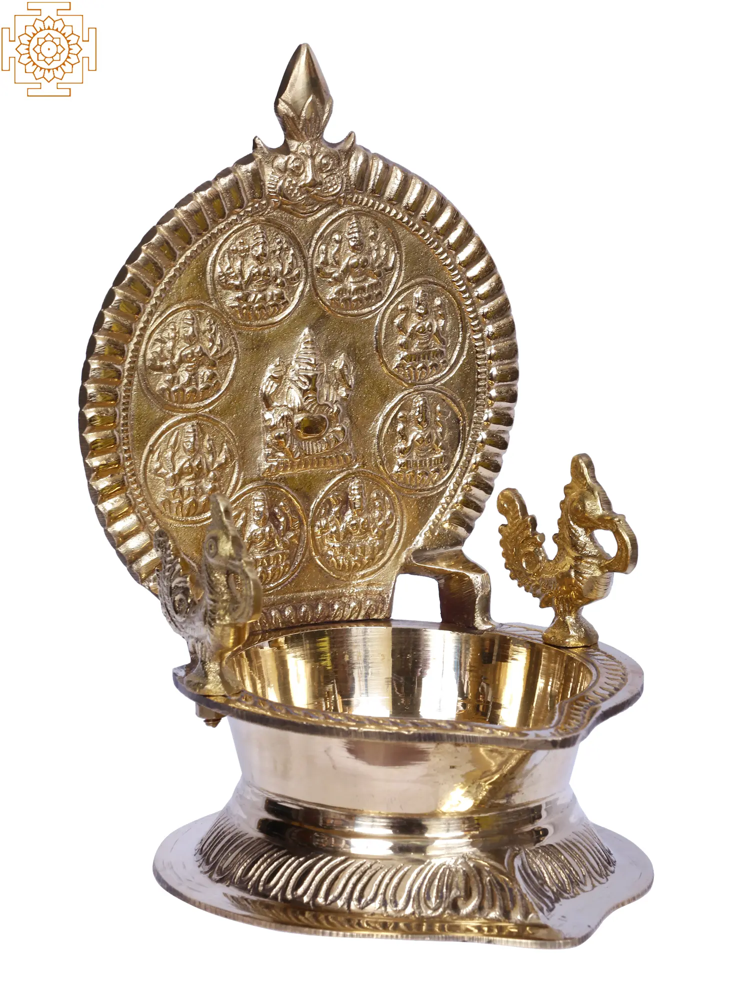 This is a brass Ashtalakshmi Diya with eight holy pictures of Goddess Lakshmi in eight different forms. The lamp's crown is adorned with these pictures, and the oil bowl is circular, as is typical of Mada Vilakus or votive lamps. The advantages of lighting this Ashatalakshmi diya include the provision of all eight sorts of prosperity as a whole, including granary wealth, courage, progeny, knowledge and wisdom, success, renown and fortune, and material and spiritual wealth. This lamp is unquestionably a vehicle for introducing all types of prosperity into a home.