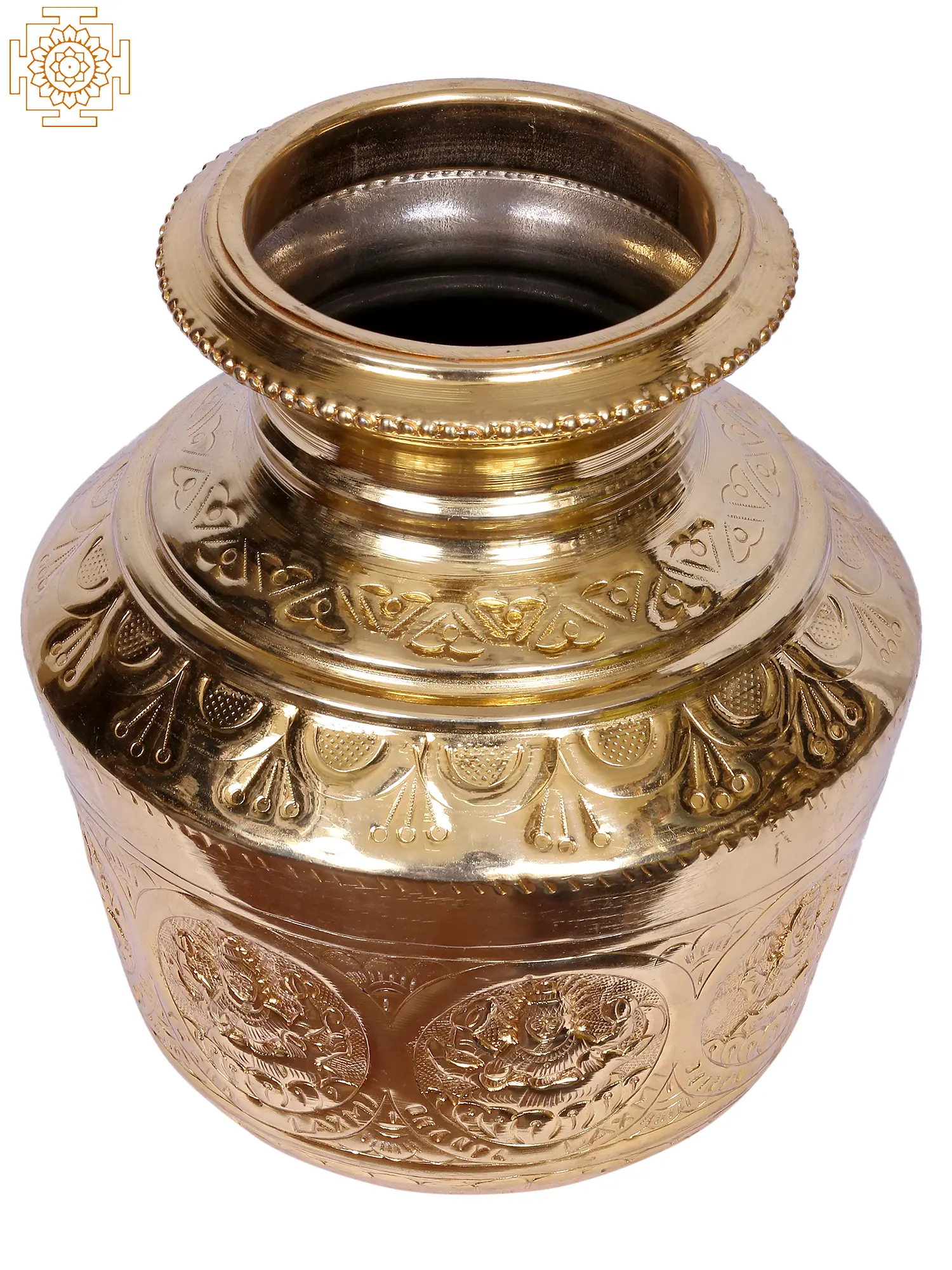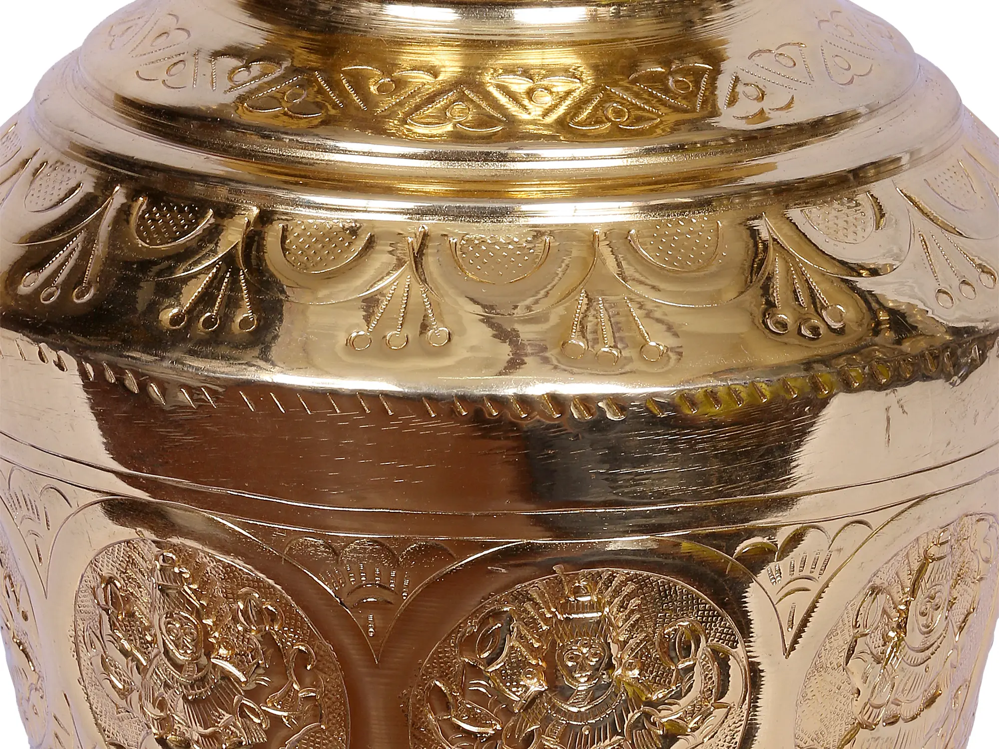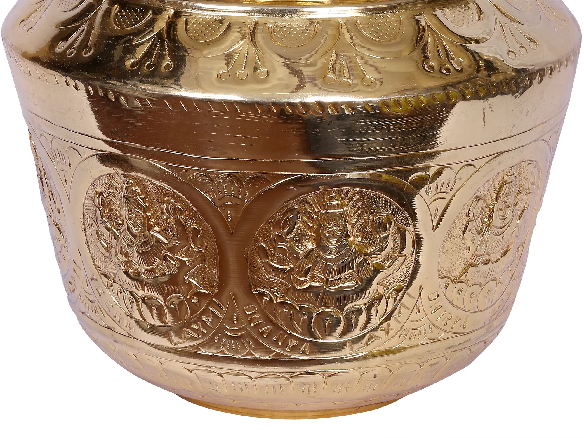This Asthalakshmi Kudam, a brass vessel of abundance, pays homage to Goddess Lakshmi, the bestower of wealth and prosperity. Asthalakshmi, the eight incarnations of Lakshmi, are exquisitely depicted, each representing different forms of fortune, from wealth to knowledge. In her multiple hands, she carries symbols such as the lotus (purity), gold coins (material wealth), and a book (wisdom). As we pour sacred water from this kudam during rituals, we invoke her grace, believing that her blessings will nourish our lives with spiritual and material riches.