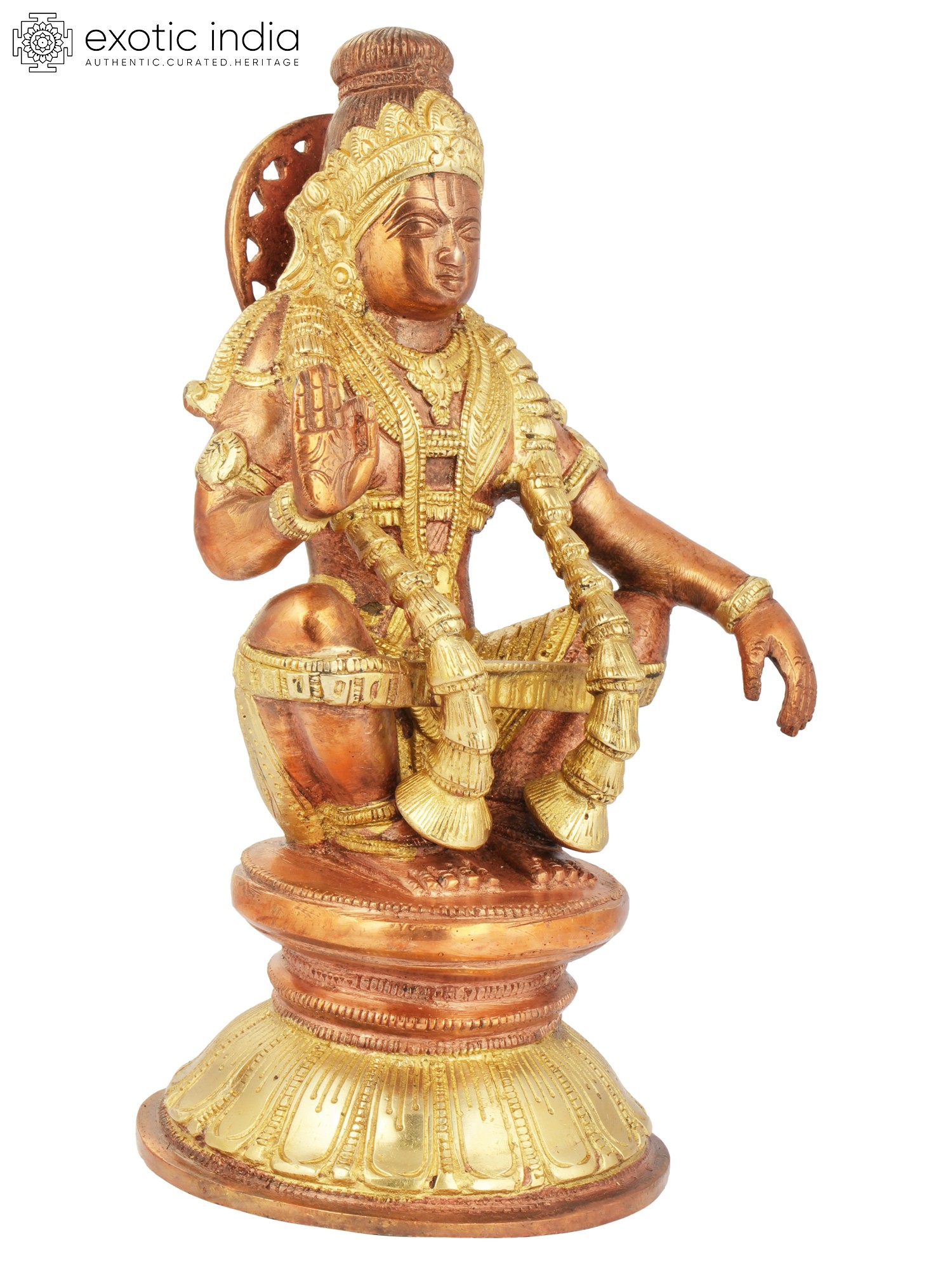 Ayyappan was a Hindu saint elevated to the status of a deity highly worshipped in the country’s southern part. Characteristic to his image conceived as one engaged in Yoga his statue has been cast representing him as seated in a posture characteristic to penancing Yogis - knees turned upwards and knotted by a band that Yogis use for holding their legs in position, besides the gesture of his hands, one indicating ‘abhaya’ – freedom from fear, and other, ‘varada’ – liberation.