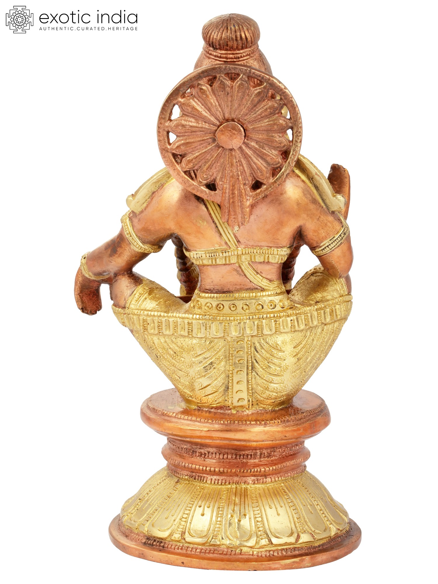 This brass statue, typical of South Indian metal-cast – iconography and body posture with knees contained by an ornate band consisting of a lotus motif design, represents Ayyappan, also known as Sastavan or Sasta, and sometimes as Manikandana or Manikantha for always wearing a Mani – jewel, around his neck.