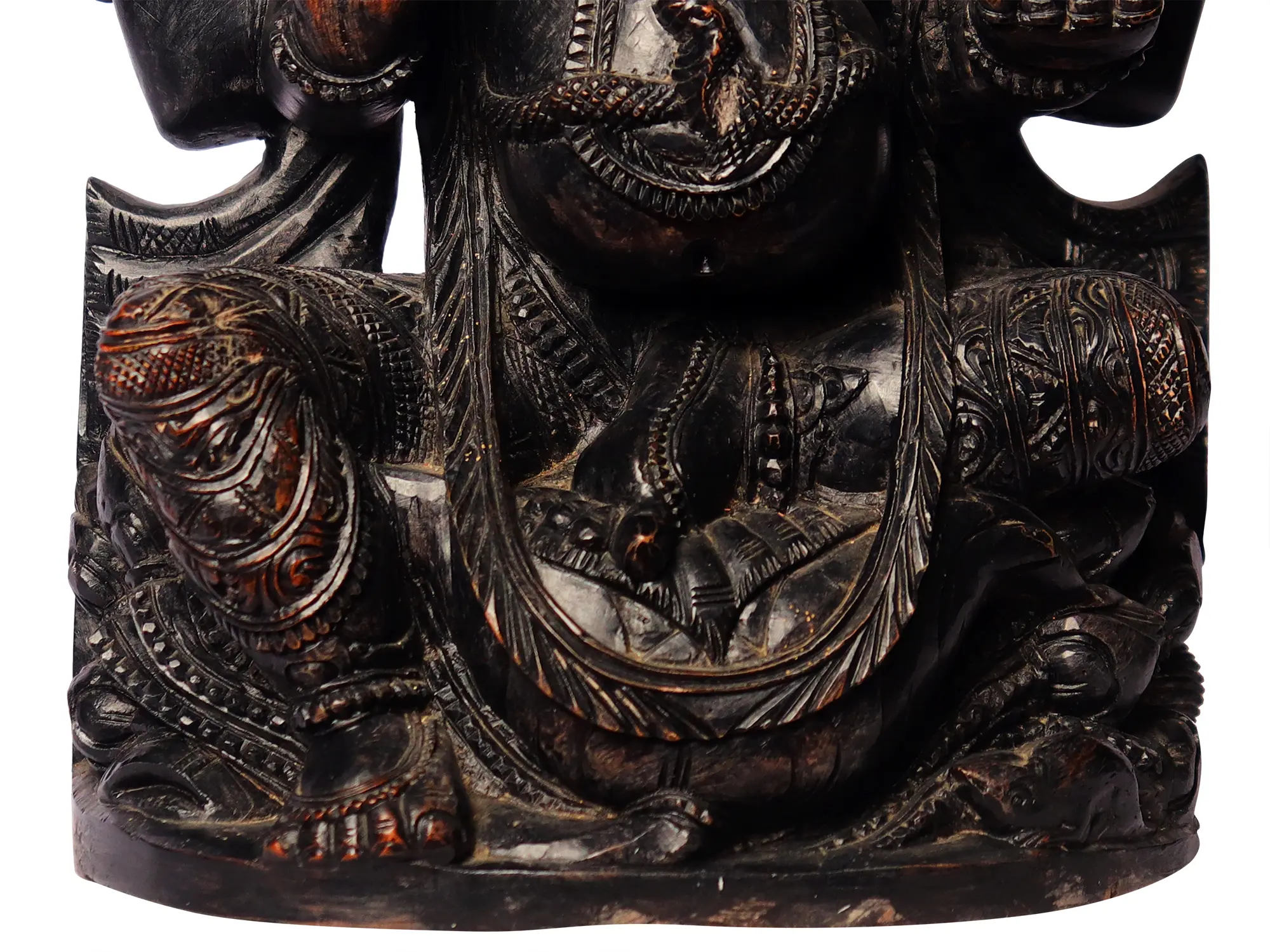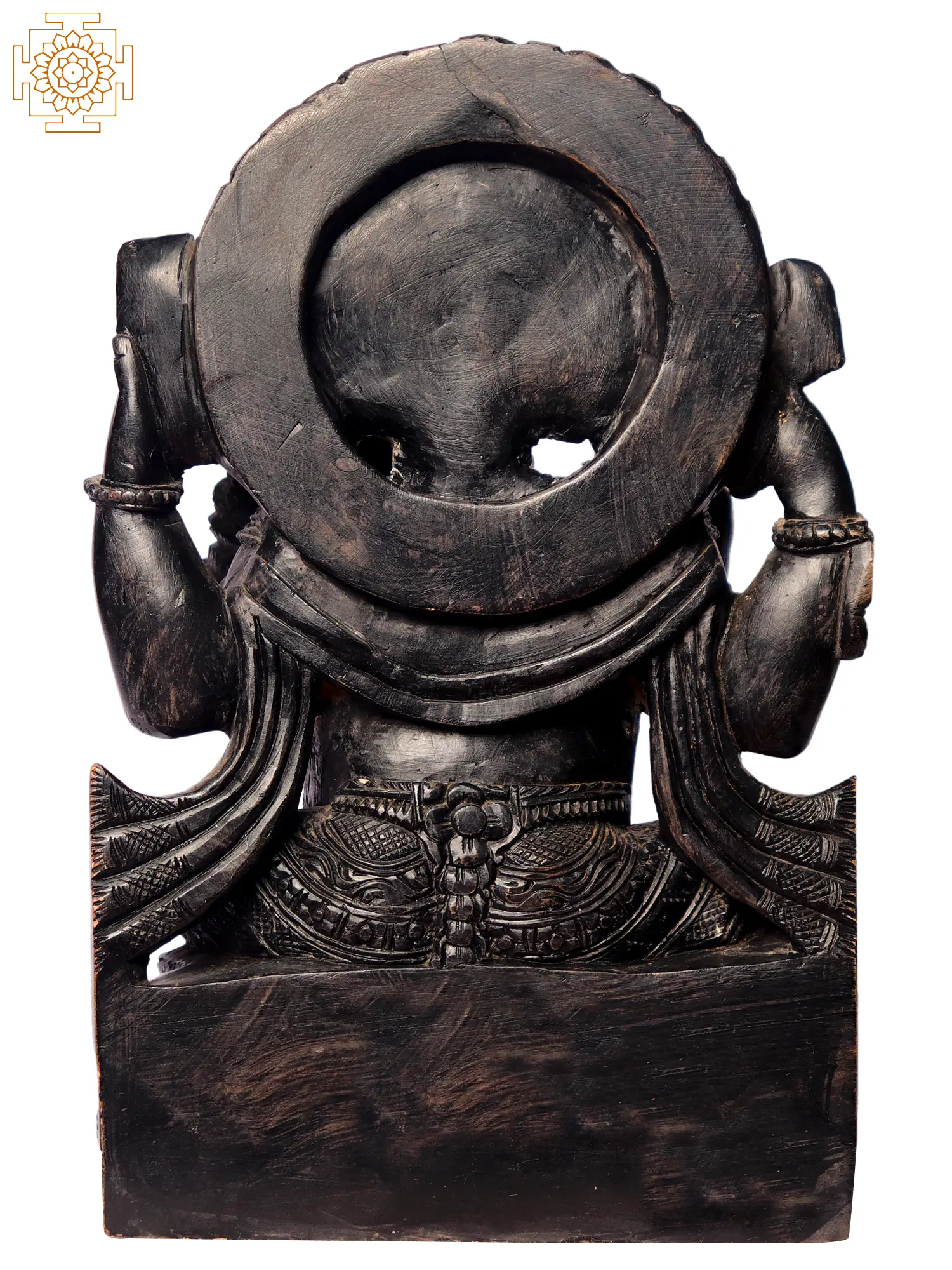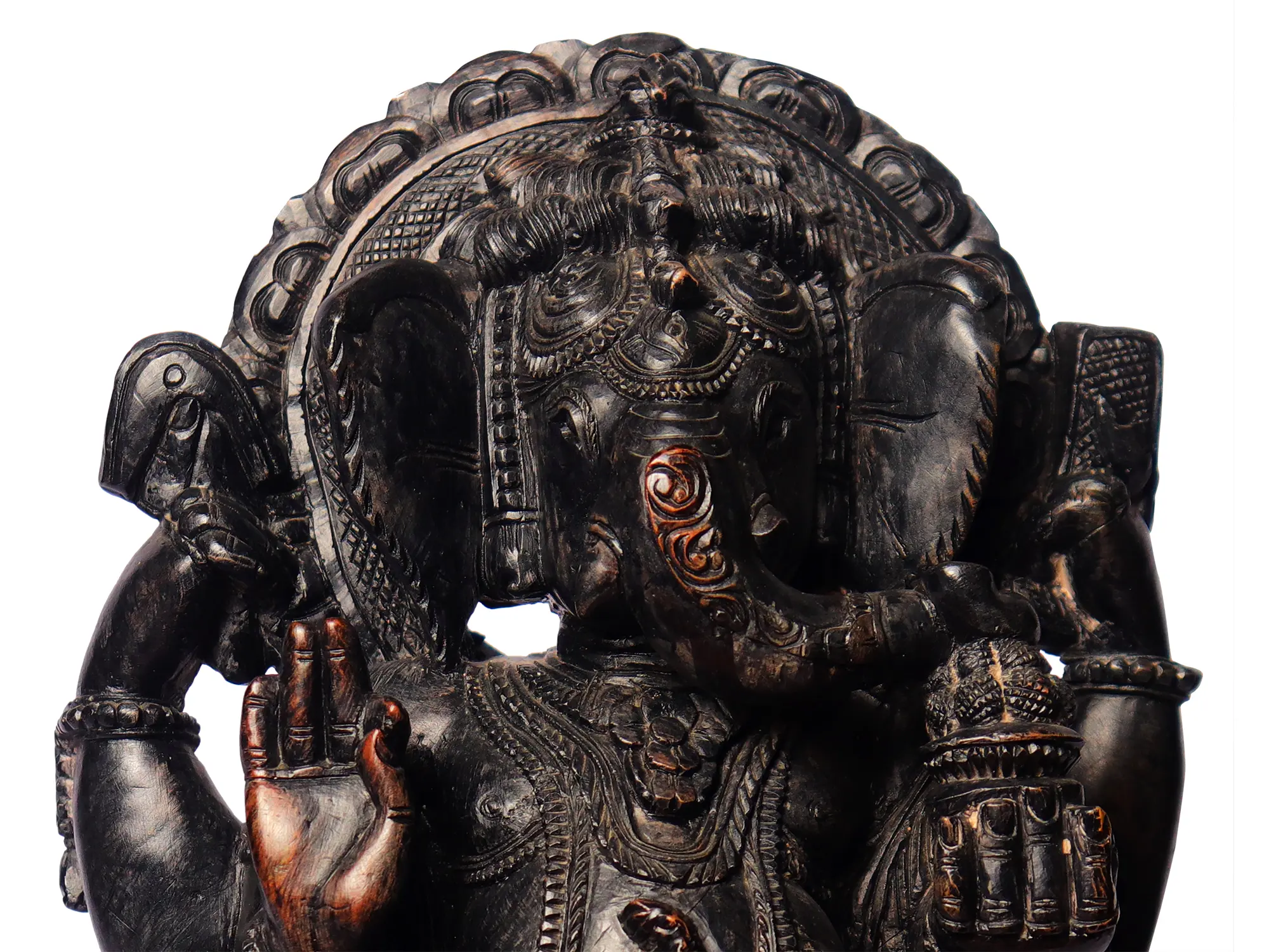 In the sacred realm of South Indian artistry, this black stone sculpture of Lord Ganesha emerges as a stunning creation reflecting the rich cultural heritage and spiritual essence of the region. Drawing inspiration from the timeless tradition of South Indian art, this Ganesha exemplifies the convergence of divine grace, cosmic energy, and artistic finesse. Carved from lustrous black stone, the sculpture radiates a mystic aura, symbolizing the boundless potential of the universe and the infinite depths of the divine. The ebony hue embodies the eternal darkness from which creation emerges, representing the womb of the cosmic mother from which all life springs forth.