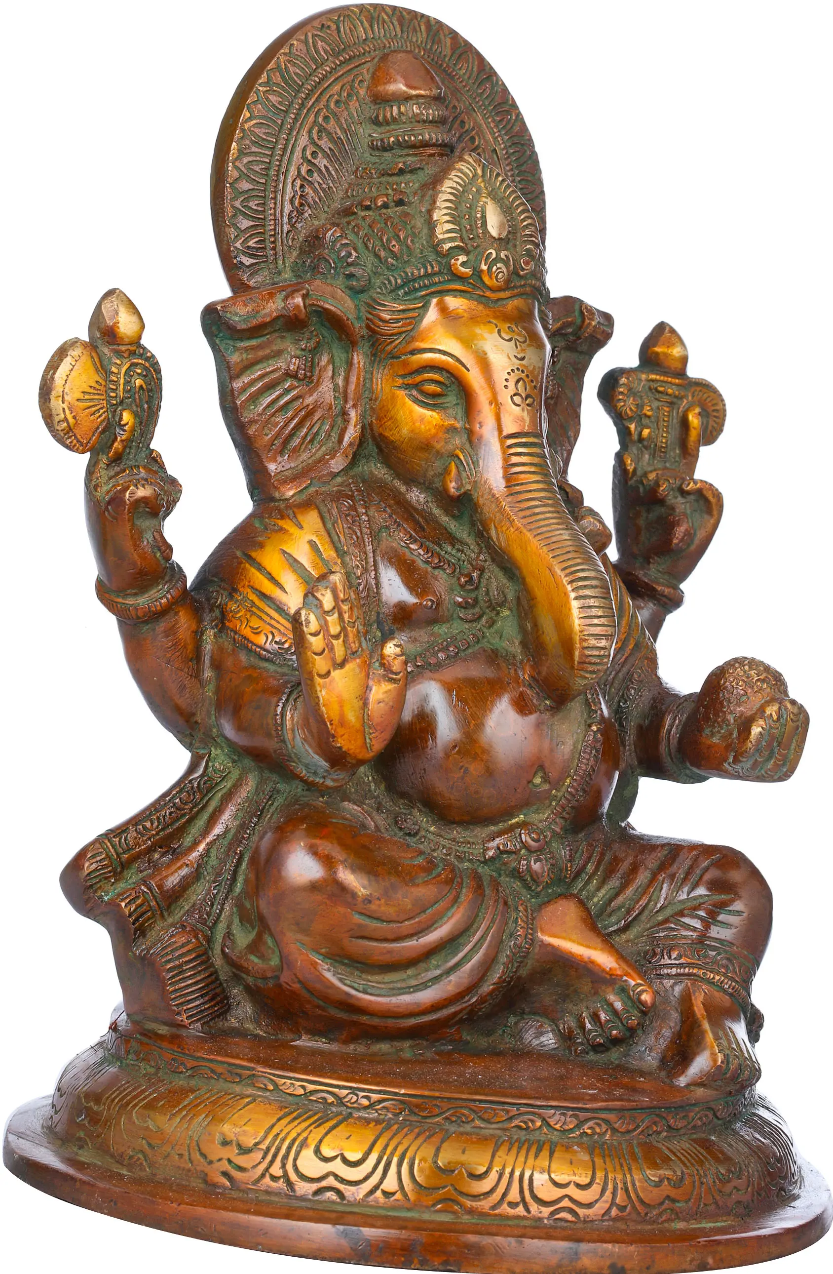 Each statue is meticulously handcrafted from high-quality brass, a metal revered for its purity and durability. The artisans have poured their skill and devotion into every curve and detail, from the intricate patterns on his crown and adornments to the gentle expression on his face. The striking blend of green and gold hues is achieved through a traditional patination process, giving the idol a unique and timeless appeal. This piece is a perfect embodiment of Indian craftsmanship, where art and spirituality intertwine seamlessly. Whether placed in your puja room, meditation corner, or as a statement piece in your living area, this Ganesha statue is sure to radiate positivity, wisdom, and good fortune. It also makes for an exceptional and meaningful gift for loved ones embarking on new journeys or seeking divine guidance.