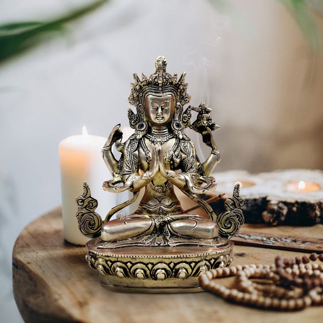 Within the world of holy art, there is a luminous brass statue of the Tibetan Buddhist Deity Chenrezig, who is a manifestation of Shadakshari Avalokiteshvara. This magnificent work of art, which was painstakingly crafted by hand in the heart of India, perfectly captures Chenrezig's caring spirit.