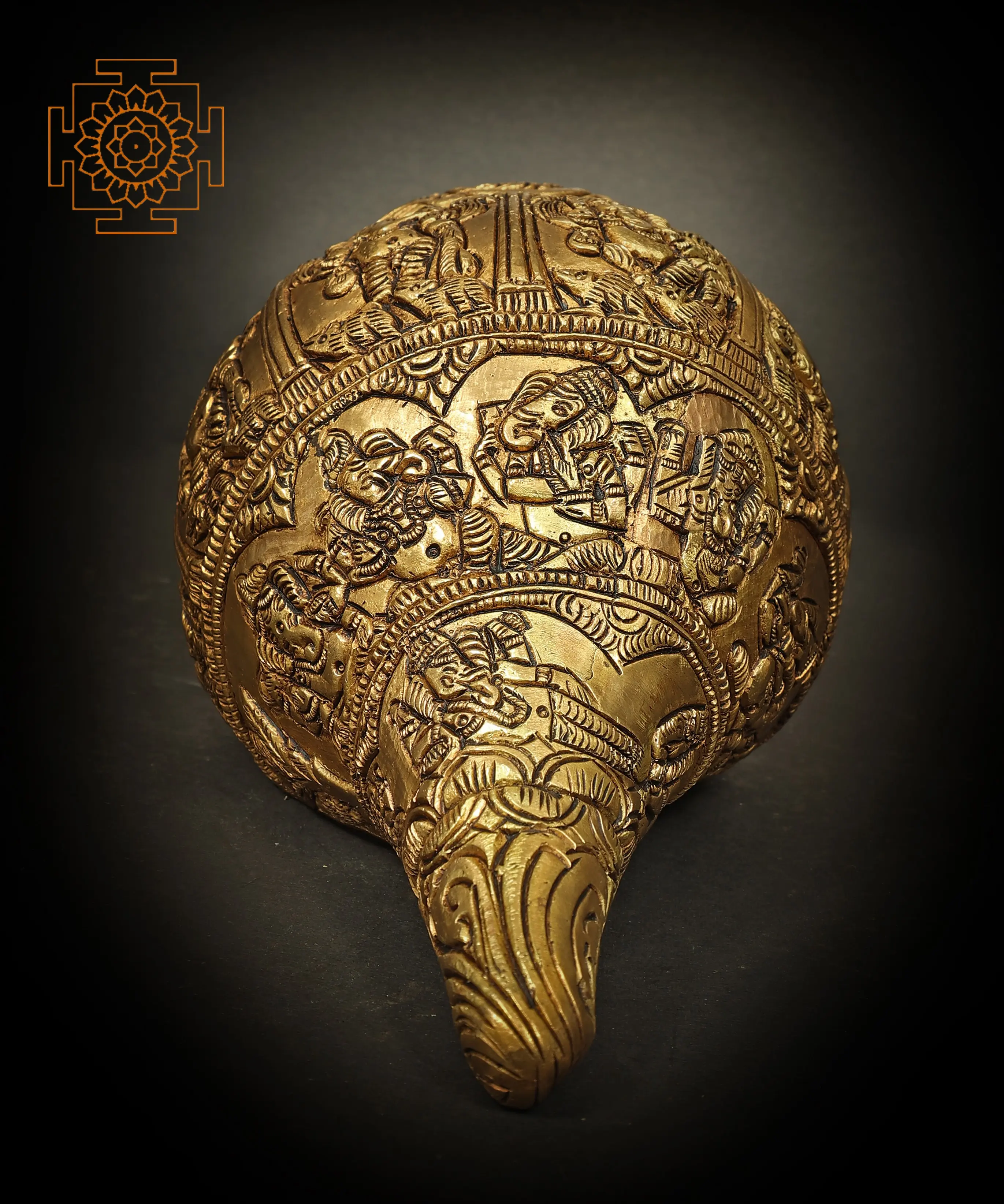 Celebrate the union of spirituality and artistry with our Handmade Brass Conch featuring Lord Ganesha in various postures, crafted in India. This remarkable piece harmonizes devotion with intricate craftsmanship. Lord Ganesha, the revered remover of obstacles, graces this conch, embodying different postures, each carrying a unique significance. From the Abhaya Mudra, symbolizing fearlessness, to the blessing gesture, each posture resonates with spiritual depth. Handmade with meticulous care, it not only produces sacred sounds but is also a work of art, reflecting the rich heritage of Indian brasswork. By welcoming this conch into your life, you connect with centuries of tradition and devotion, echoing Lord Ganesha's grace in every resounding note.