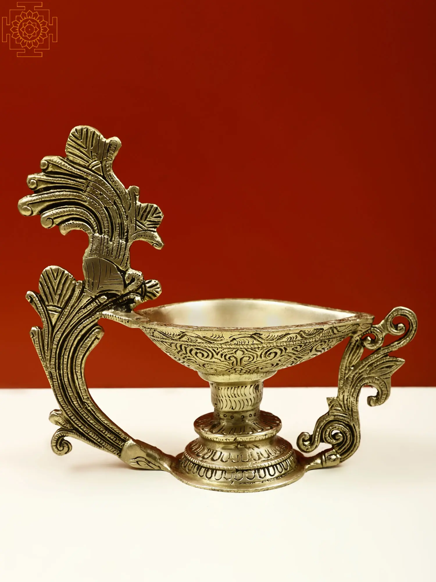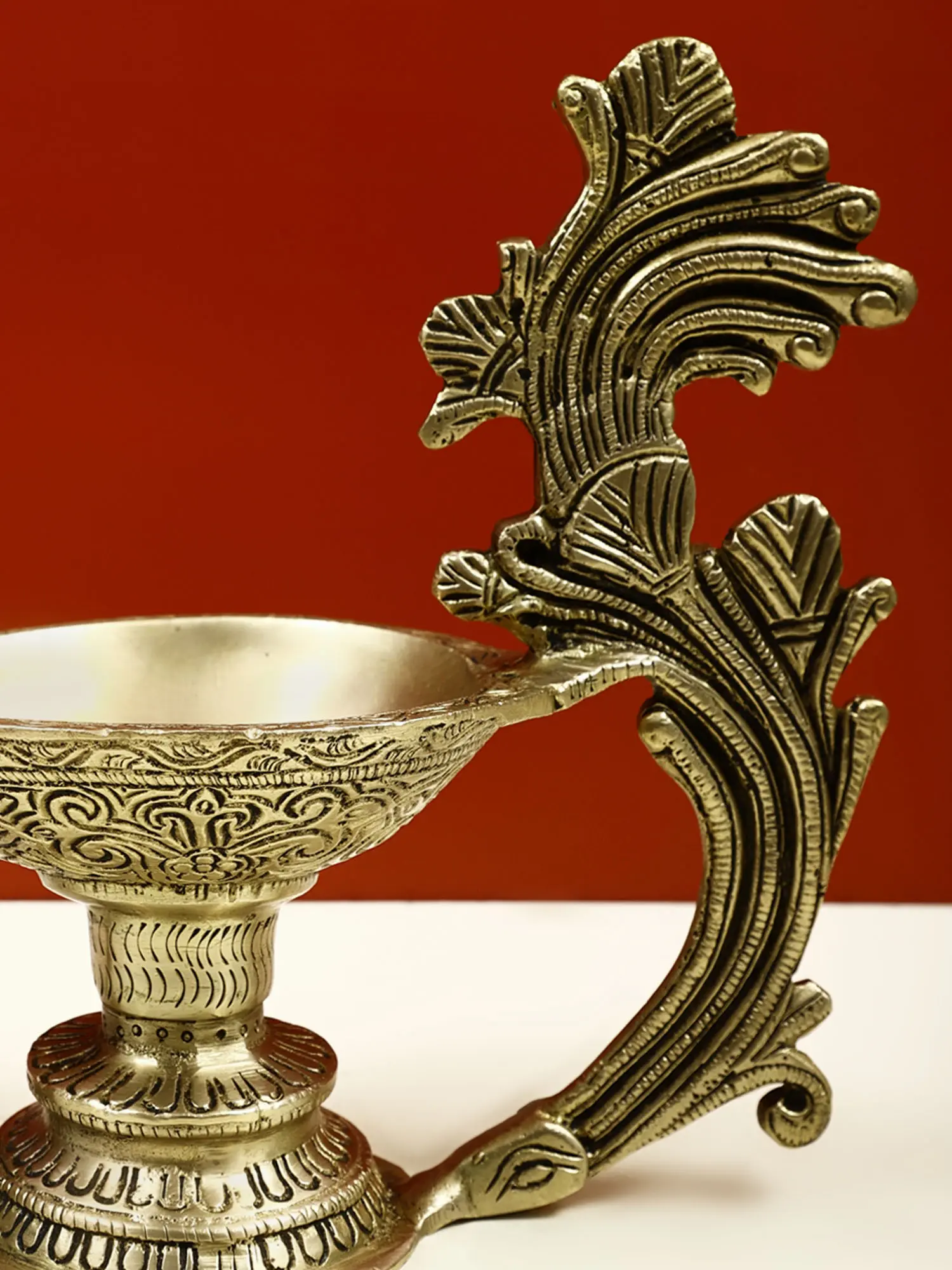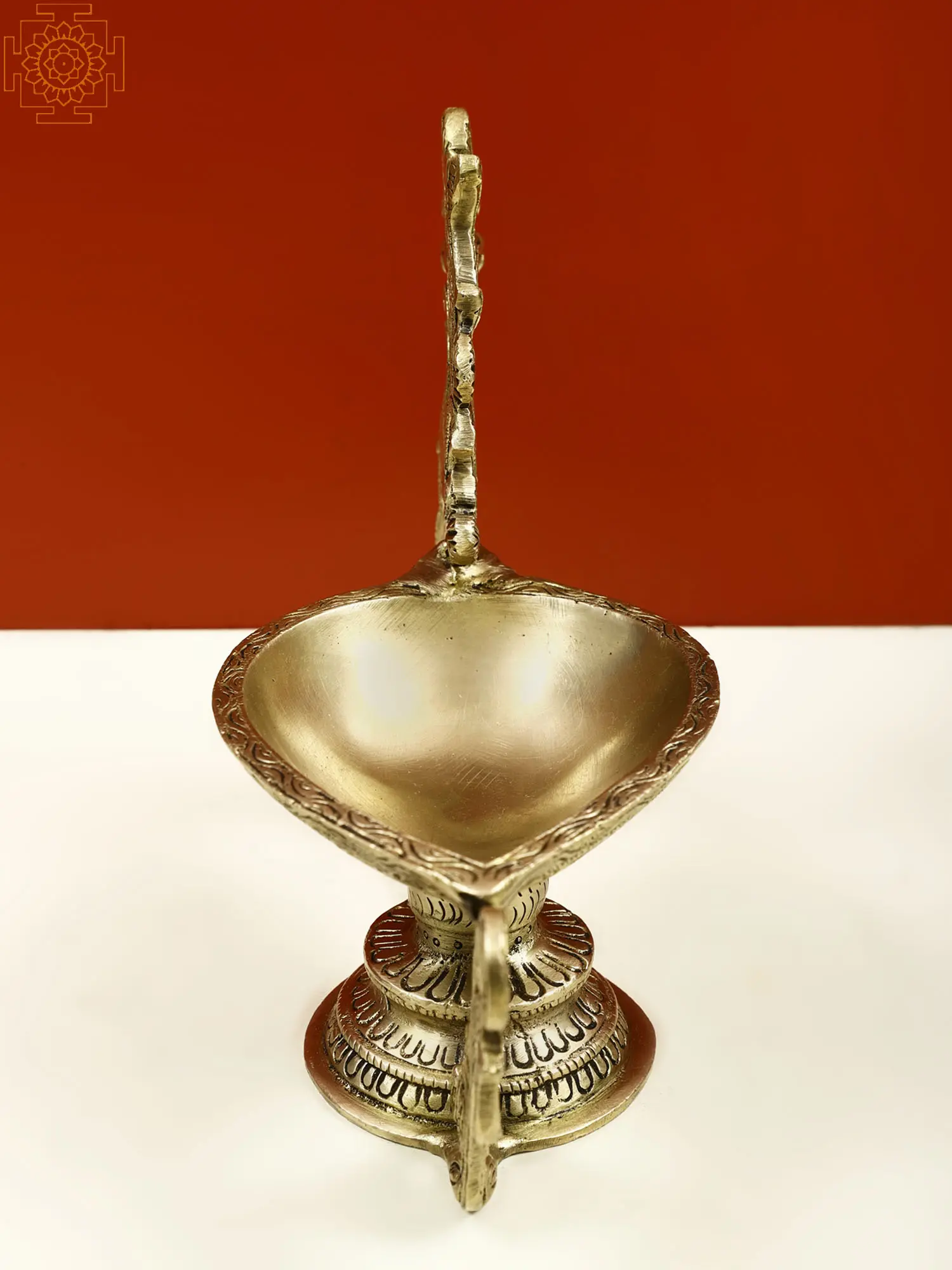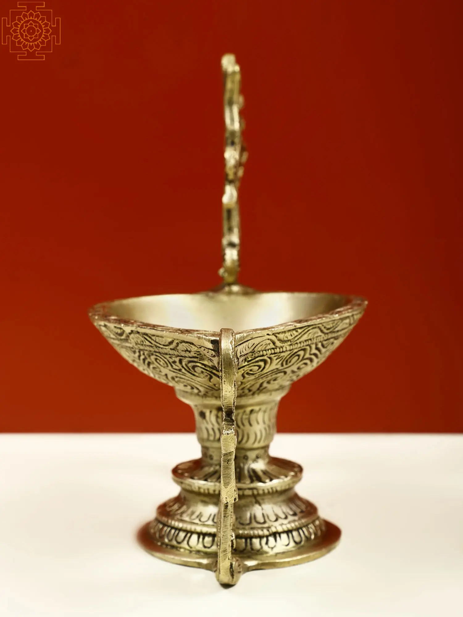 This single-wick portable lamp is a simple yet beautiful brass Diya that represents the path from darkness to light. The lamp is the most classic style, with its simple body and one wick, and it is the finest approach to begin regular devotional practice. It has an unusual handle in the shape of a beautiful branch and a raised platform for an Aarti Diya. It has a shallow oil basin and may also be used for Camphor Aarti. The lamp's body is etched with exquisite designs that contribute to the piece's attractiveness. Including this Diya in your daily rituals of giving fire to the gods will bring you, their favors.