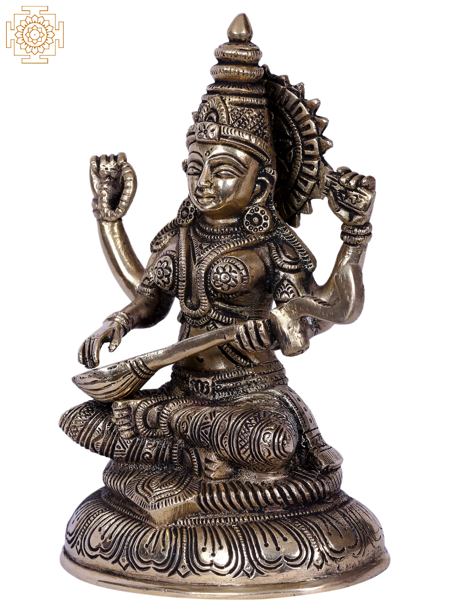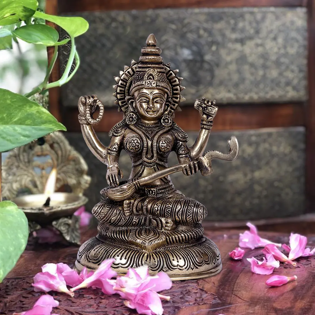 Goddess Saraswati, the epitome of wisdom and art, sits majestically in her divine form, adorned with ornate jewellery and flowing garments that cascade like a river of creativity. Drawing inspiration from centuries-old traditions, the Central Indian sculpture technique showcases the seamless fusion of art and spirituality. Passed down through generations, this ancient craftsmanship method bestows an unparalleled level of precision and artistic depth to each creation.