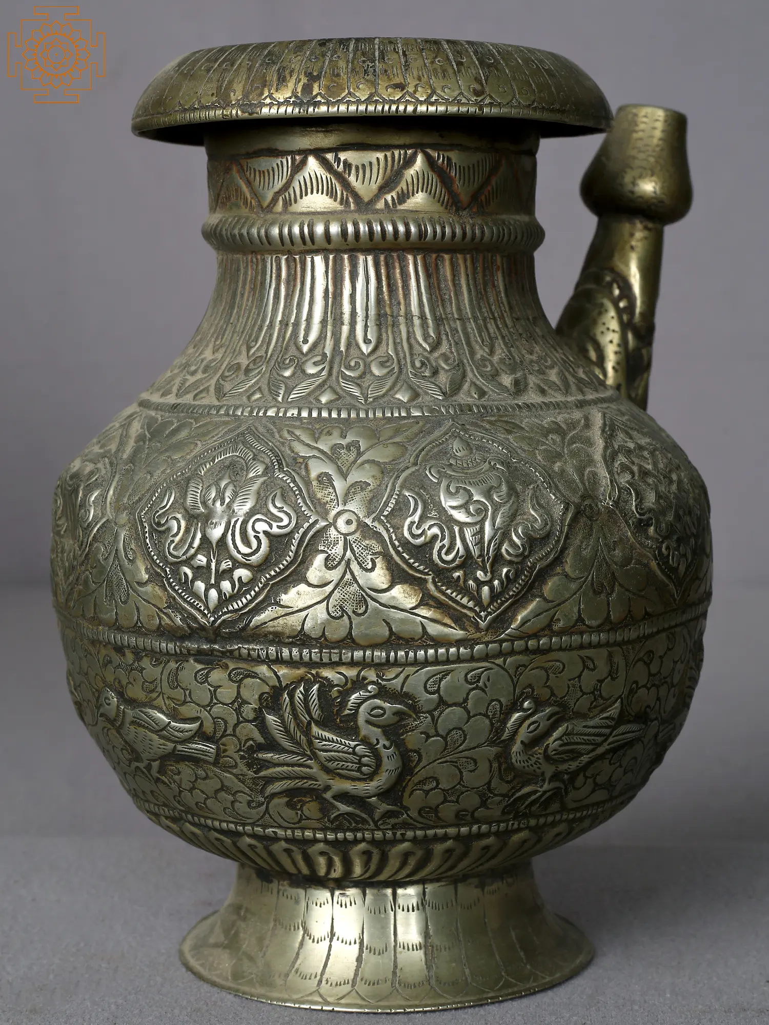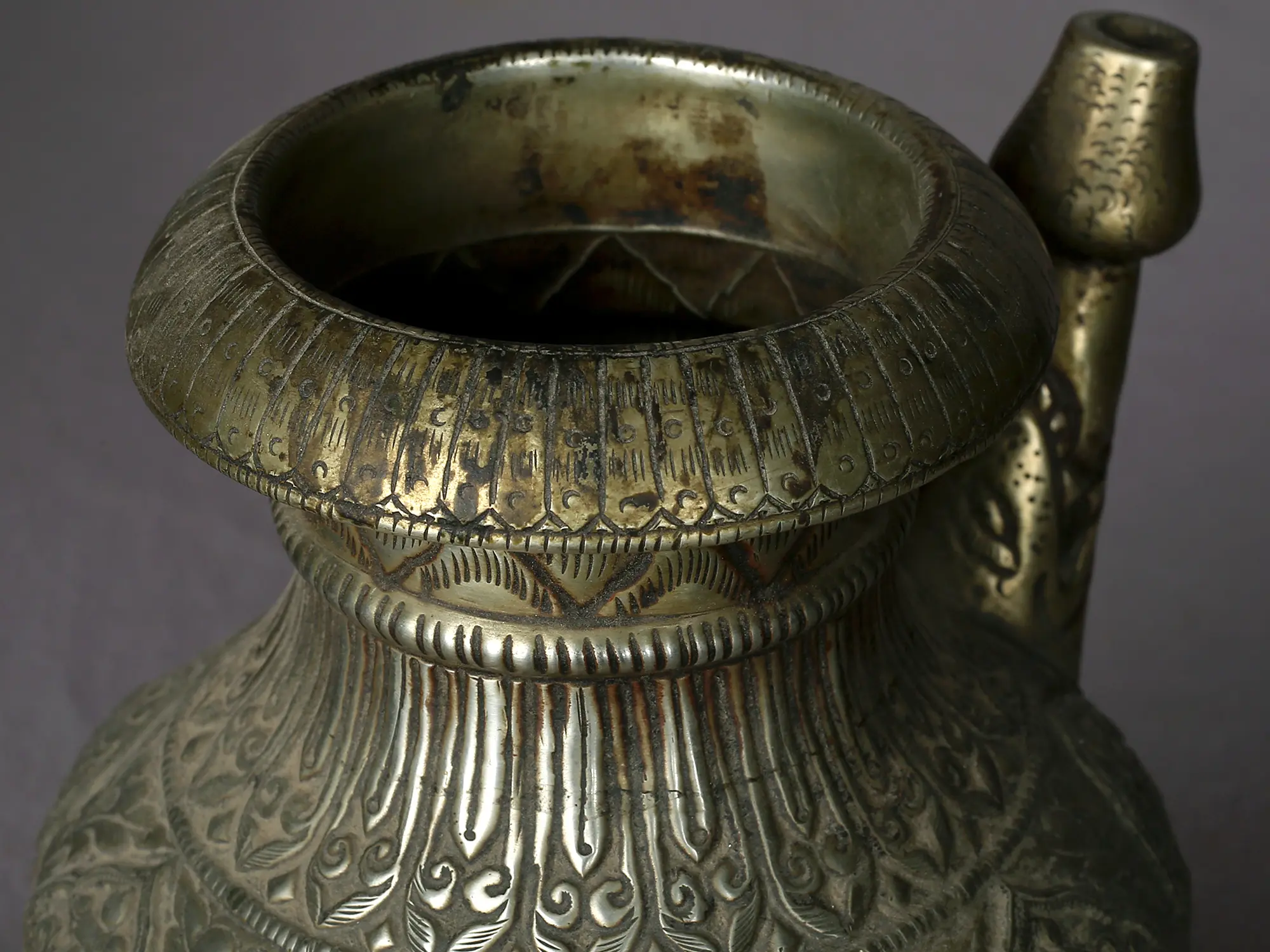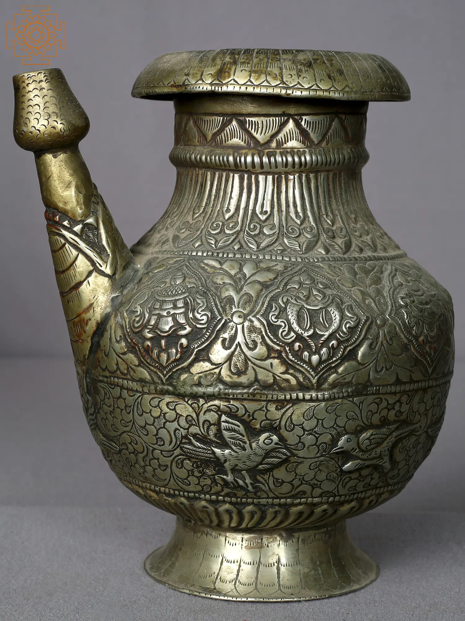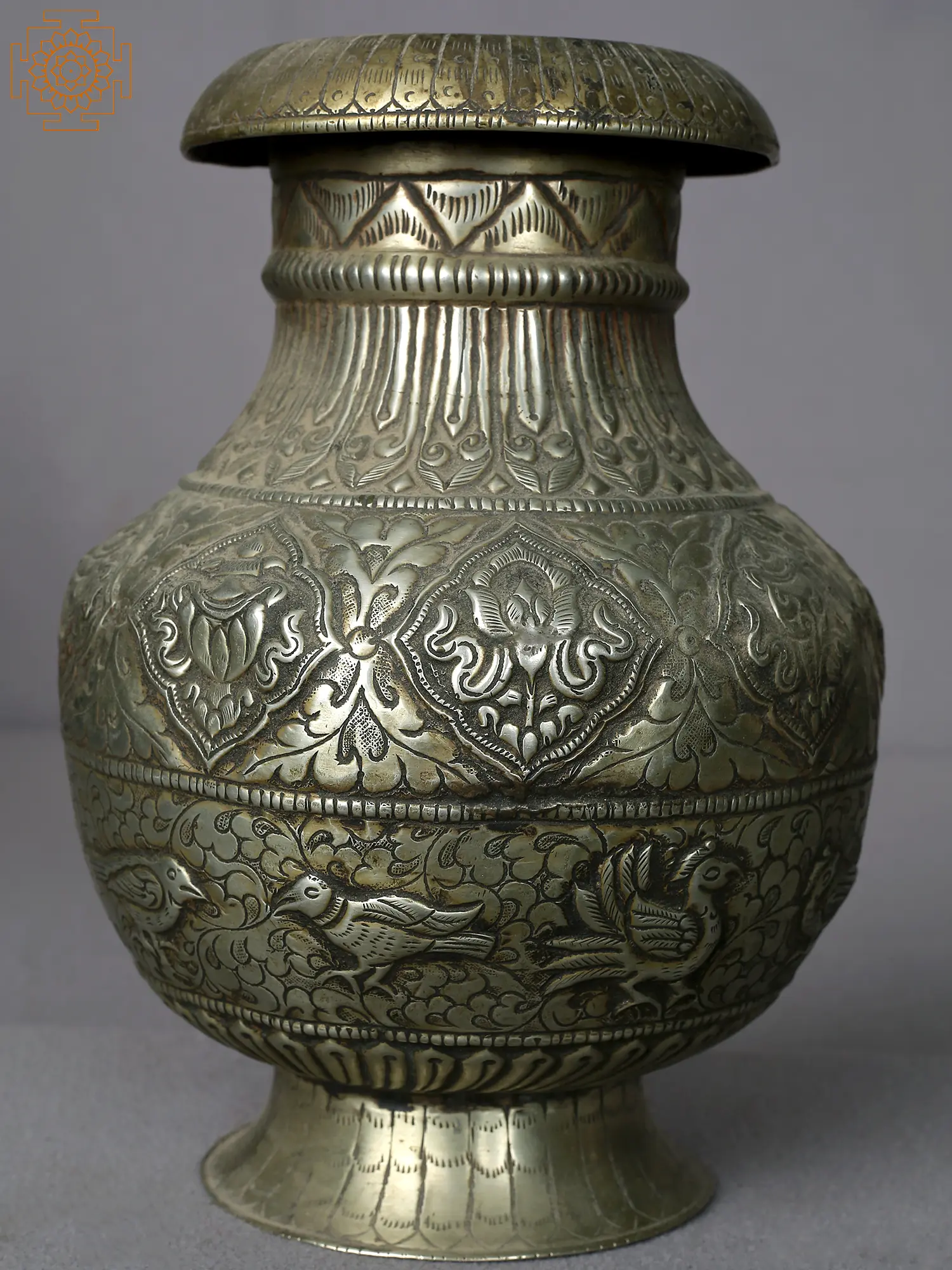 Karuwa is a ceremonial vessel adorned with symbols embodying good fortune, spiritual power, and enlightenment. The Eight Auspicious symbols encompass items like the conch shell, endless knot, and lotus, each carrying distinct symbolic significance. This ritual item would find application in various Newari Buddhist ceremonies, particularly those involving blessings and auspicious energies.